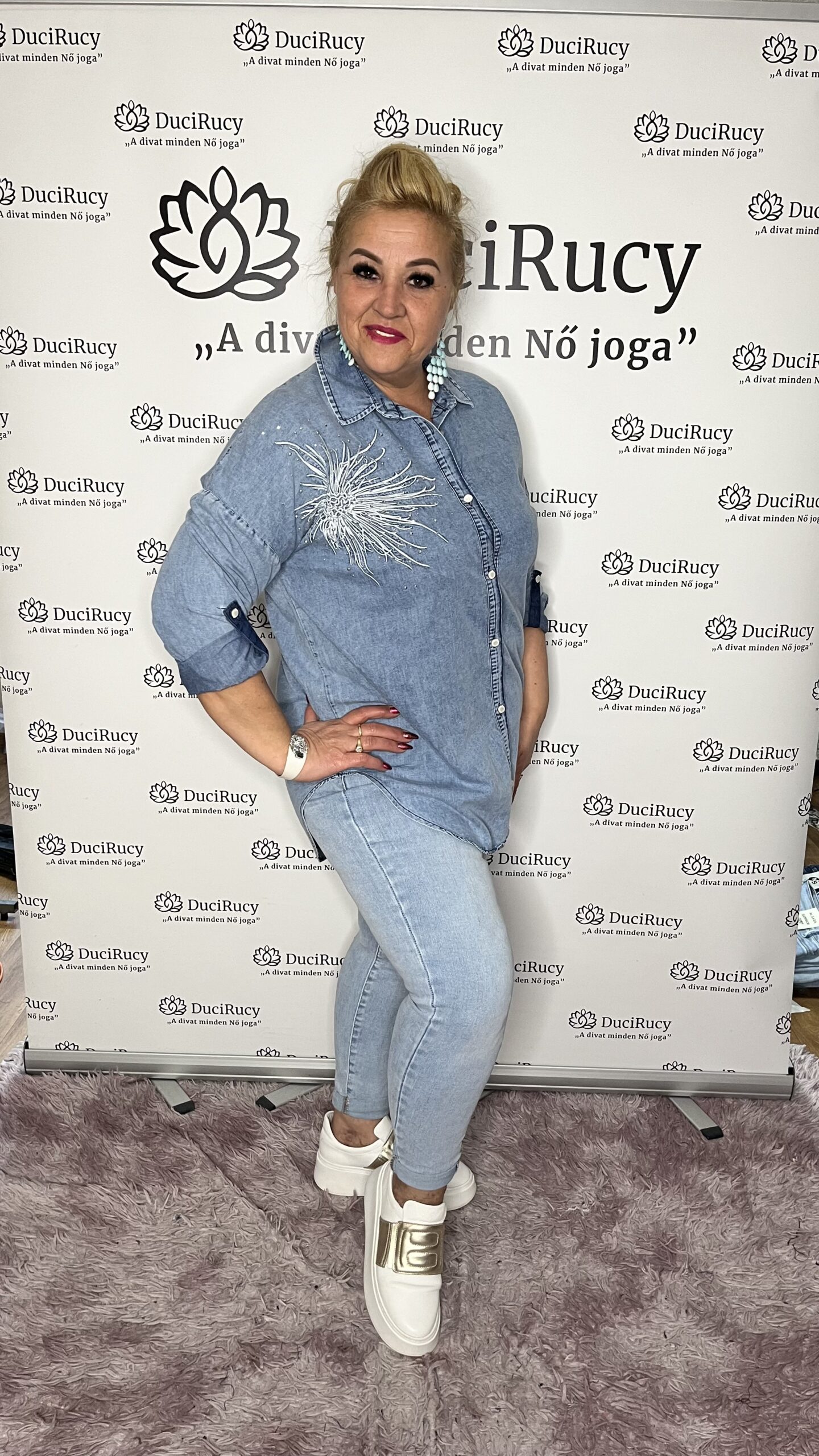 Török, minőségi anyagból készült farmering, melynek egyik oldalán kövekkel kirakott hímzett virág díszíti. Az ing anyaga nem rugalmas, de nem az a durva farmeranyagból készült, hanem vékonyabb farmervászon anyagból. Igazi ritka darab, ezzel nem valószínű, hogy az utcán szembe találkozol. Az ing kerekített fazonú, az ujja felgombolható.