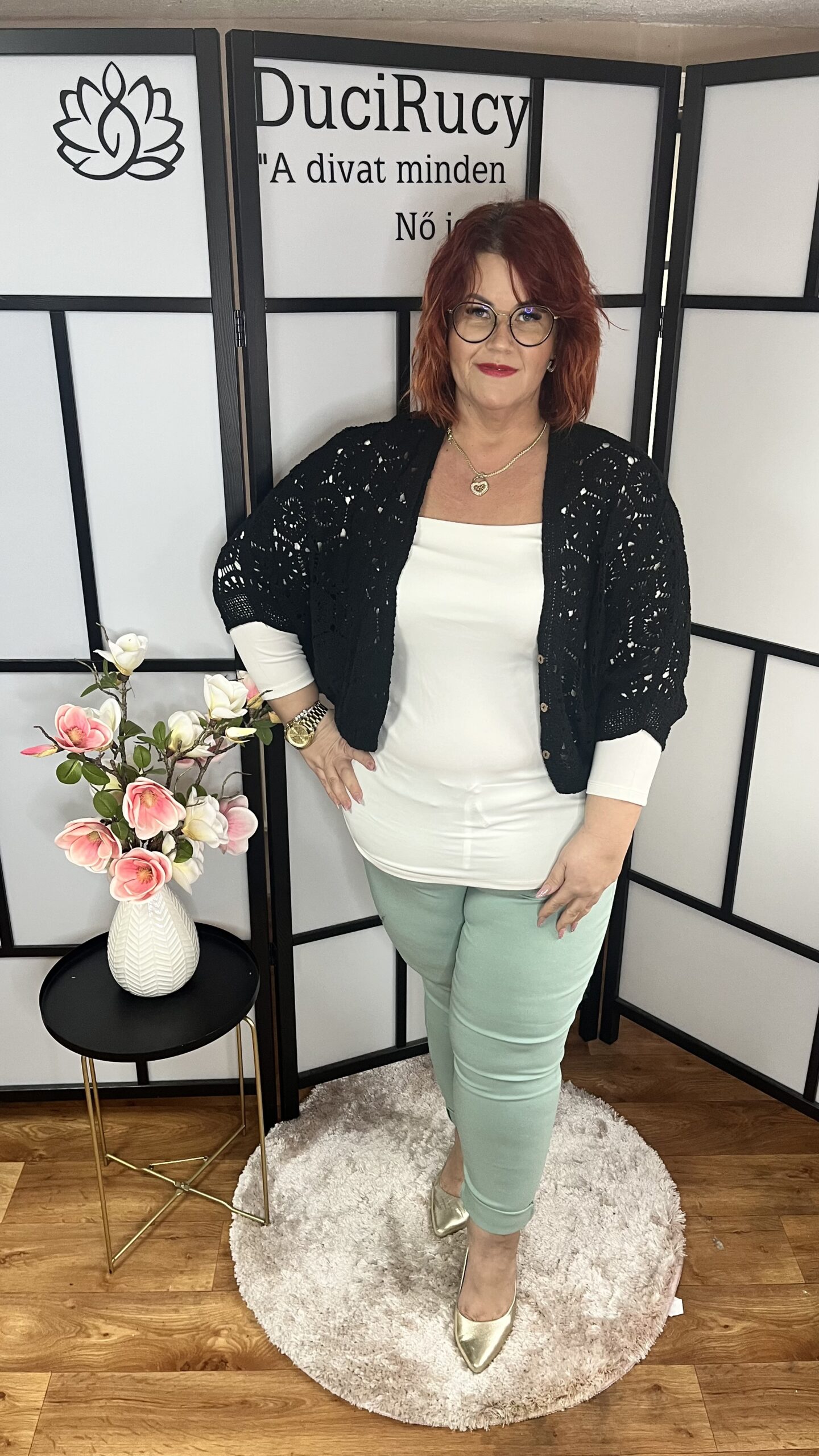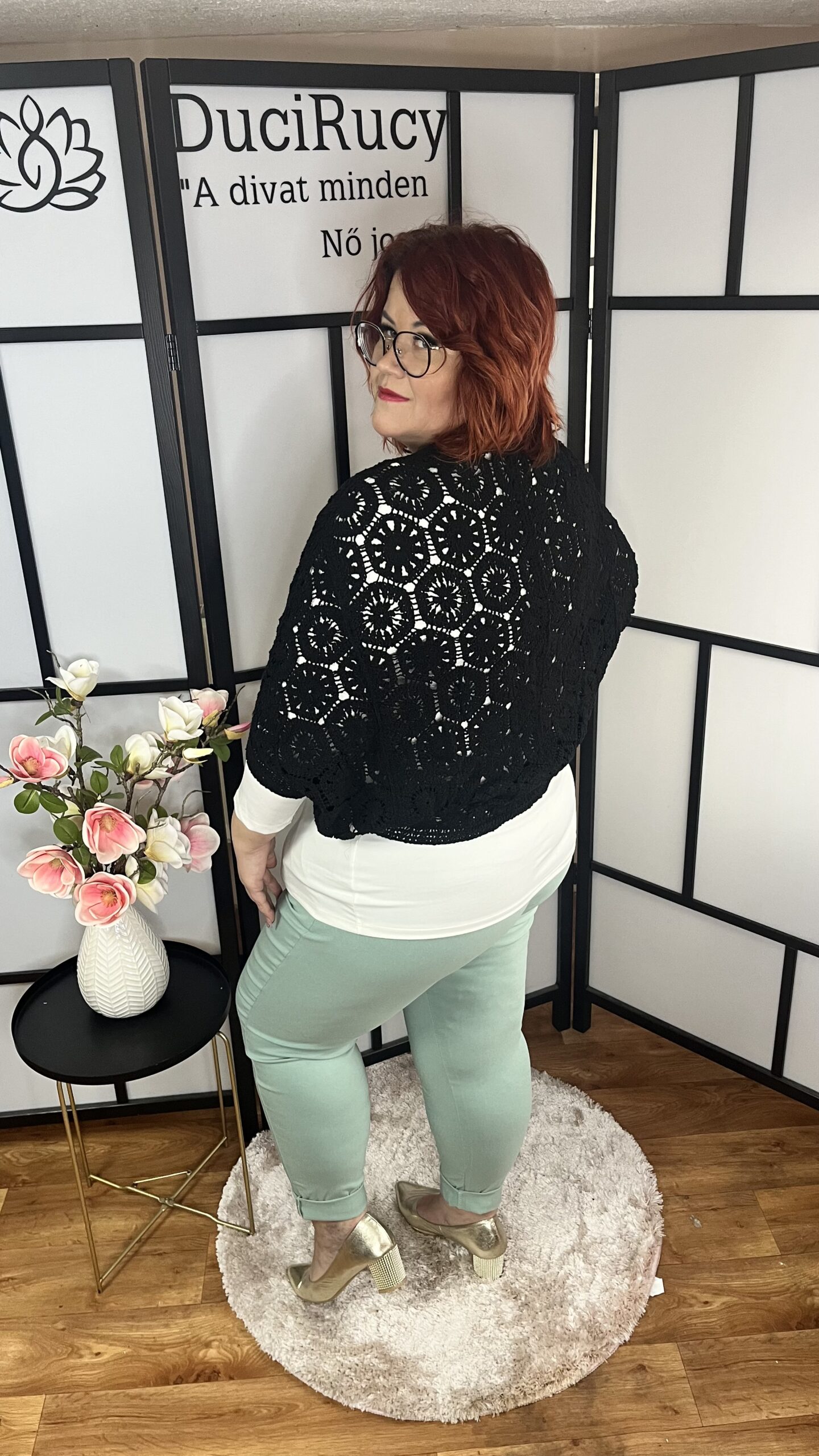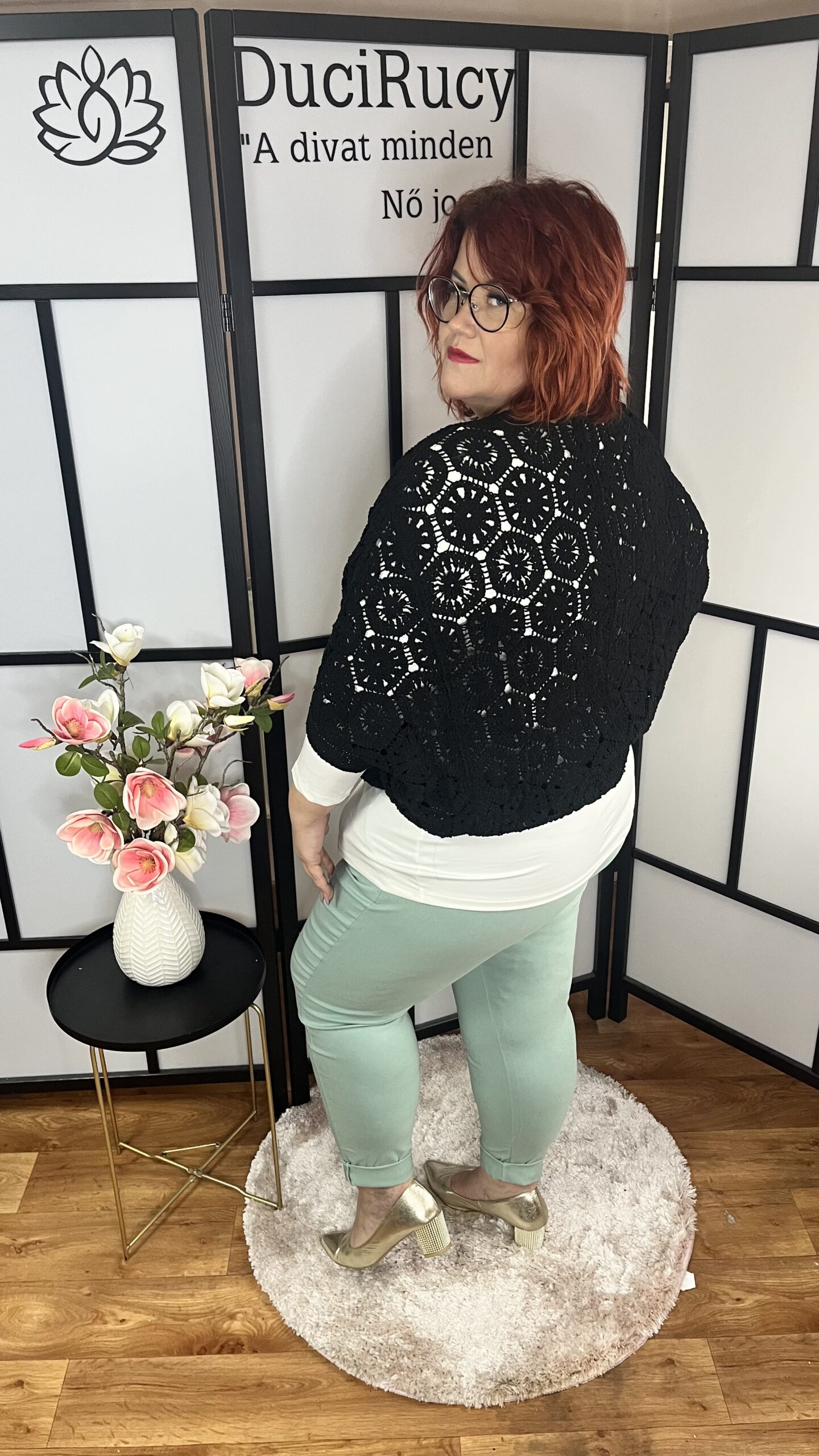 Szuper divatos horgolt kardigán. Igazán divatos kis darab, bármilyen szettet fel lehet dobni vele. Bohém stílusú, elején 3 apró fa gombbal. Könnyed és romantikus darab. Maximum 50-52 méretig ajánljuk.