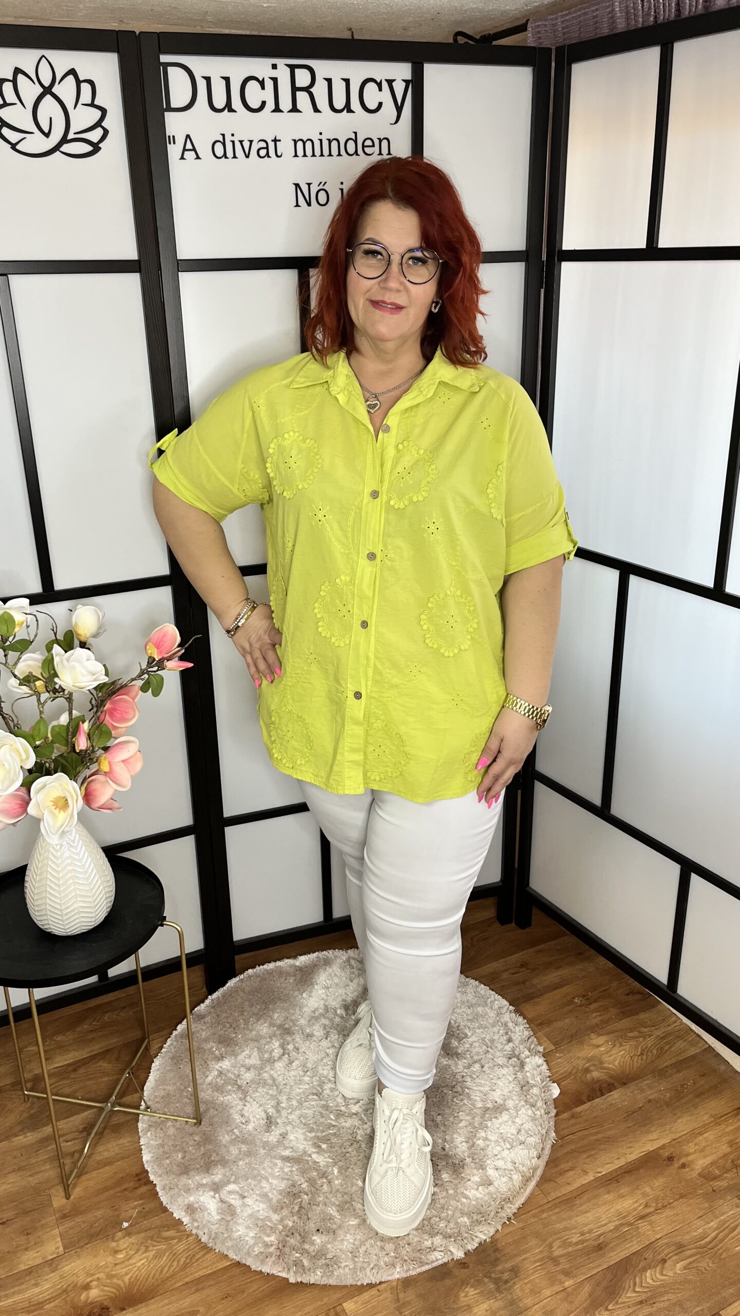 Gyönyörű és kényelmes, egyenes, az alján kerekített fazonú, horgolt és madeirás virágdíszítéssel készített, végig gombos vászon ing. Az ing anyaga nem rugalmas, az ujja felgombolható. Nagyon praktikus viselet, jól kombinálható darab.