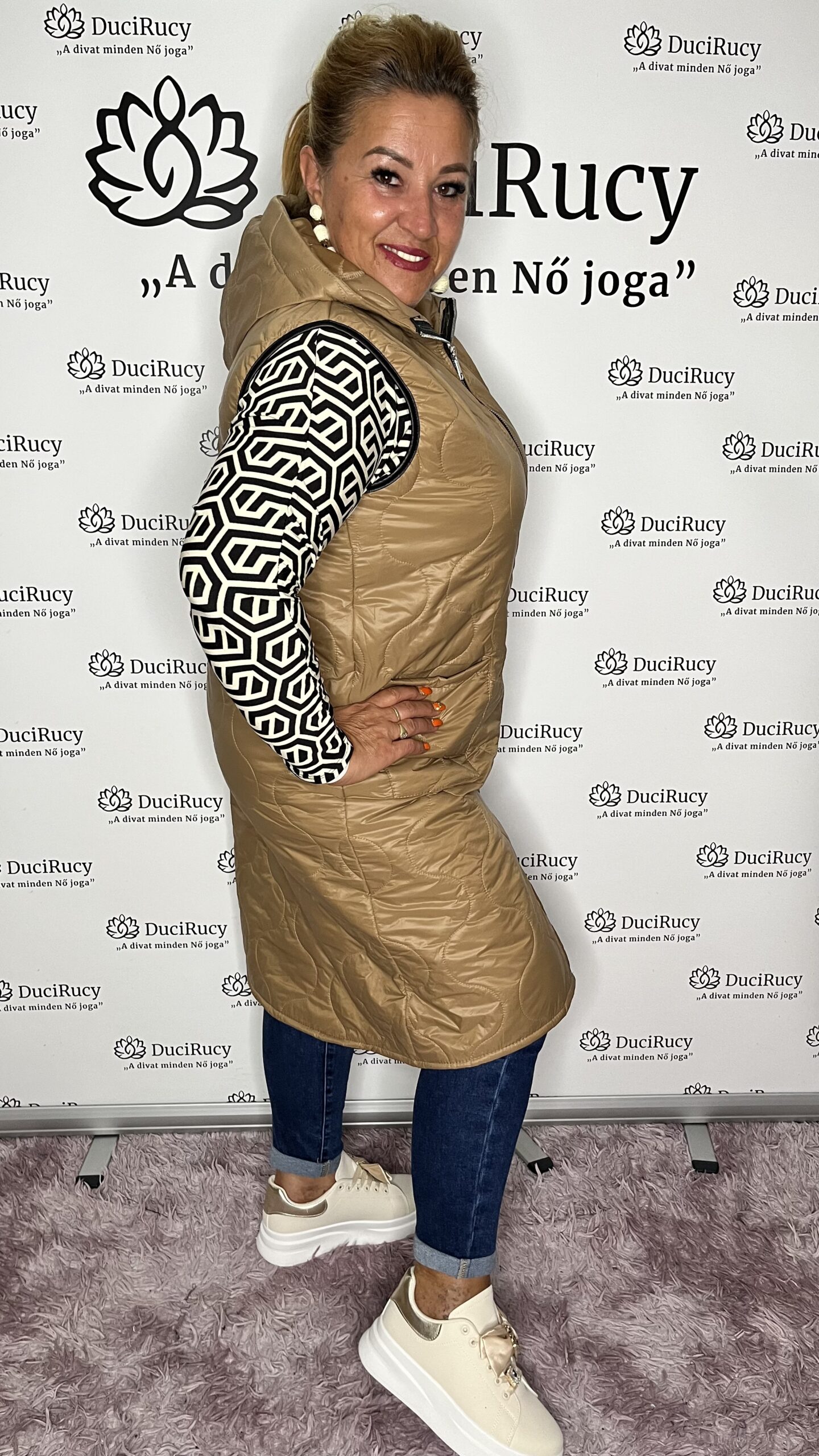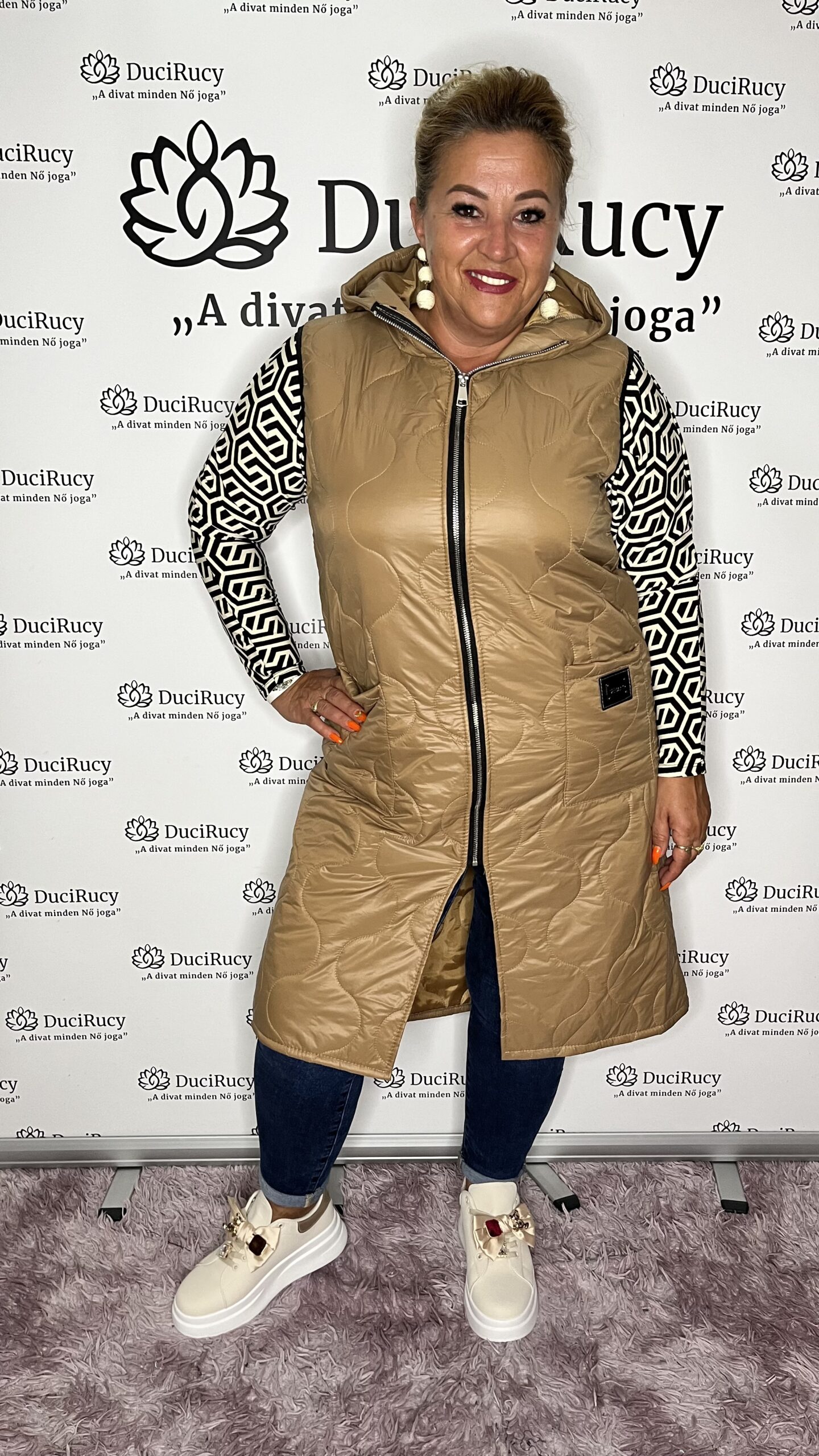 Olasz méret nélküli, hosszított fazonú, nagyon divatos, steppelt kapucnis mellény. A mellény elöl pár centiméterrel rövidebb, mint hátul.