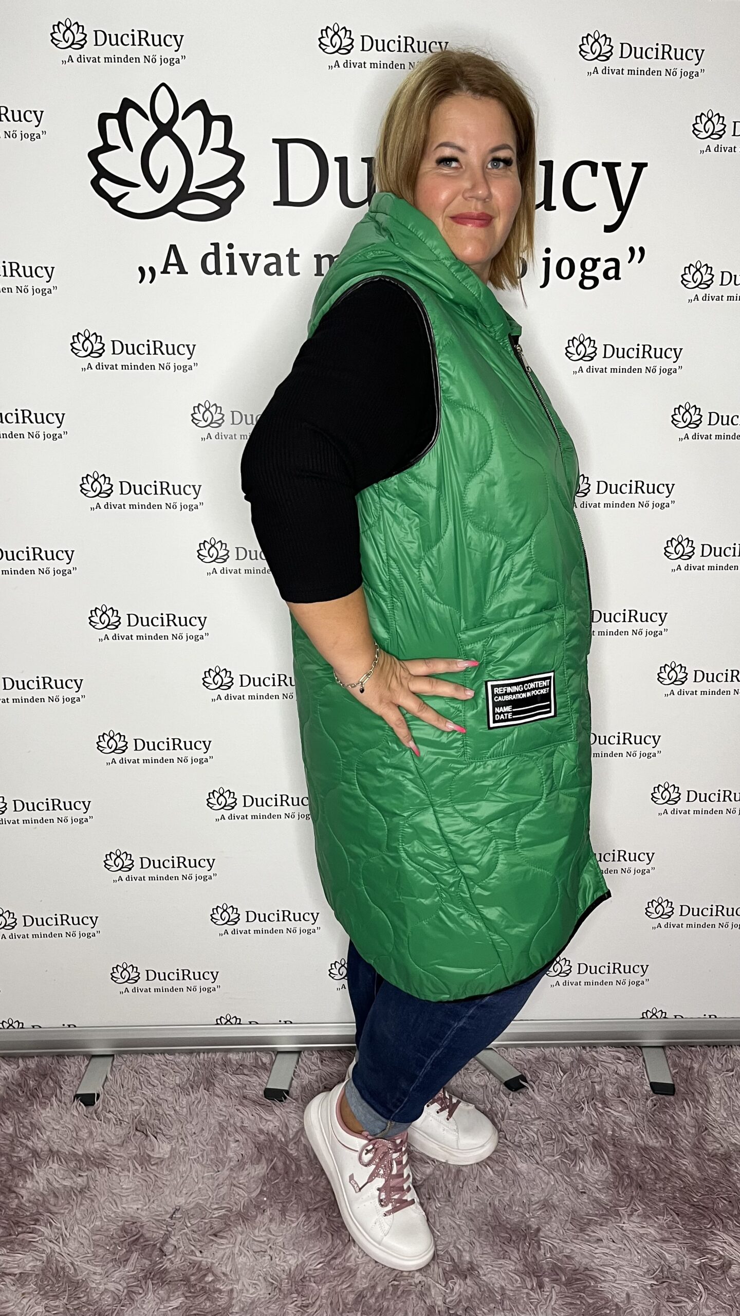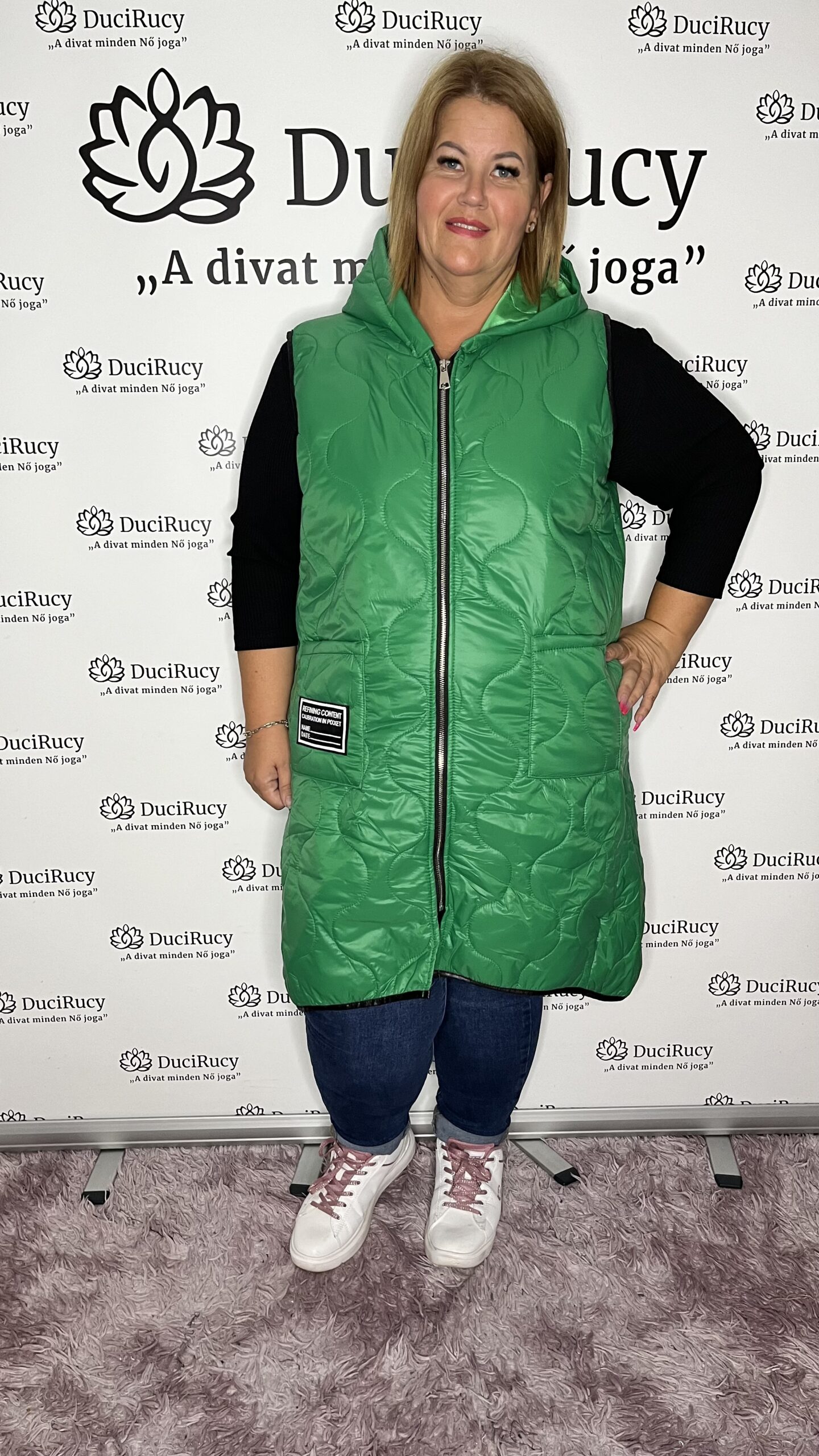 Olasz méret nélküli, hosszított fazonú, nagyon divatos, steppelt kapucnis mellény. A mellény elöl pár centiméterrel rövidebb, mint hátul.