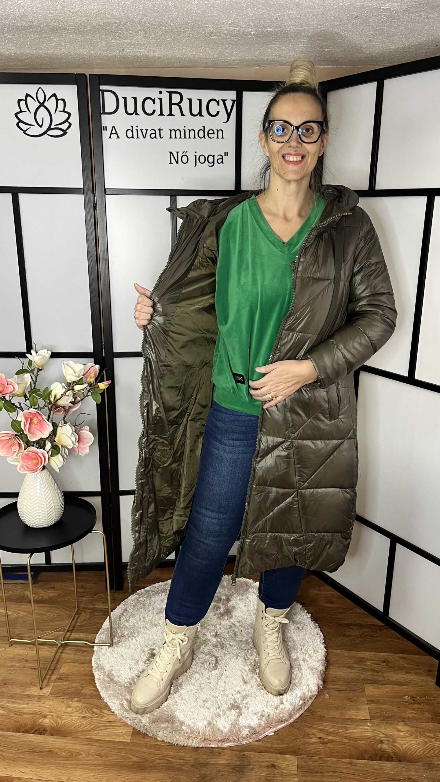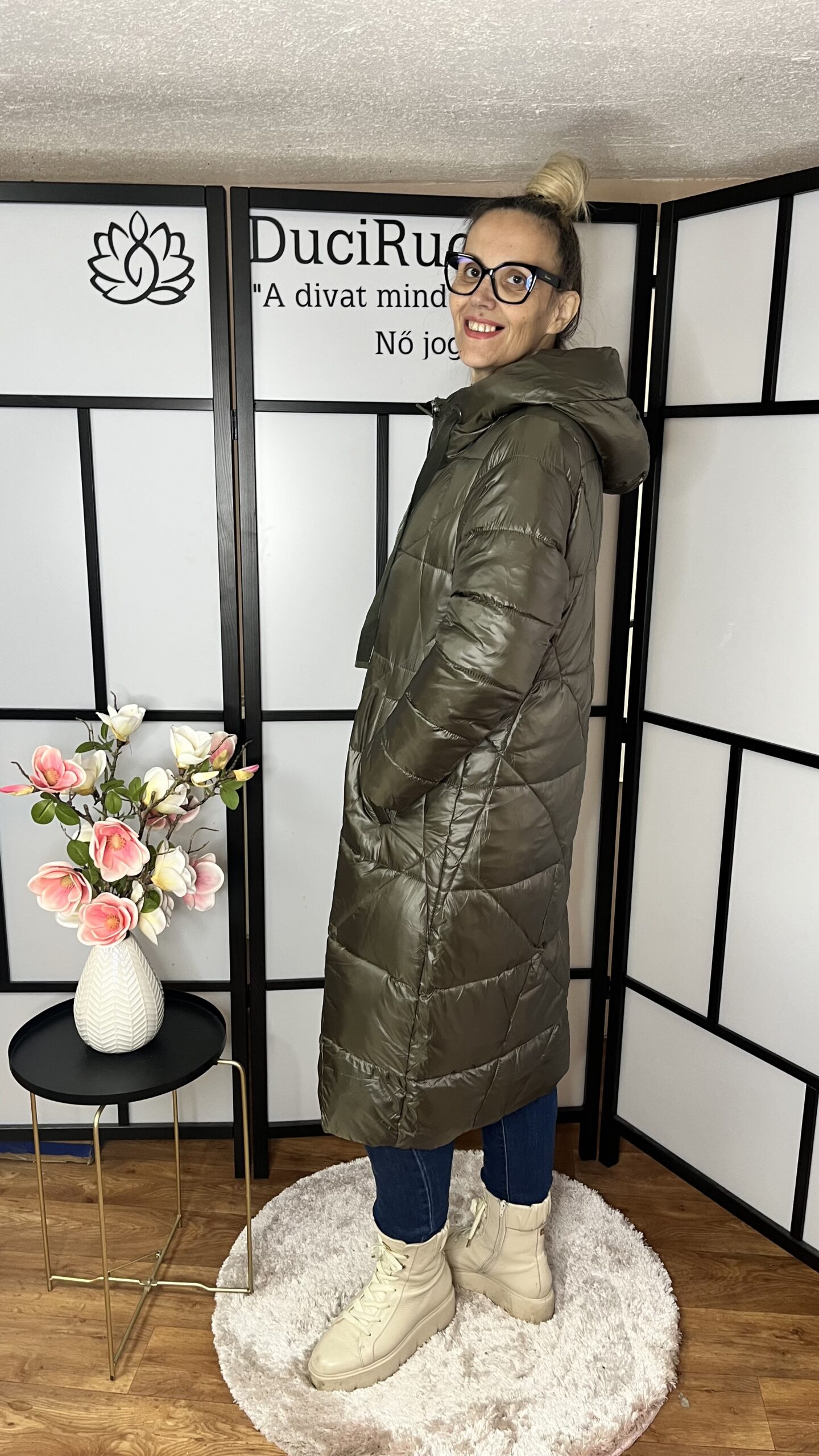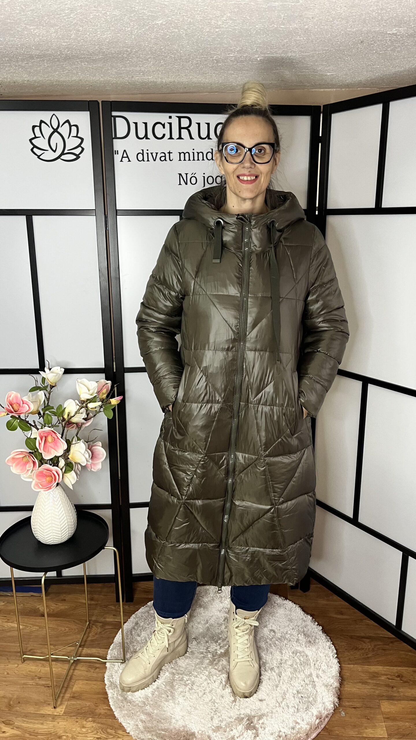 Hosszú fazonú, steppelt kapucnis téli kabát. A kapucni nem levehető. A zipzár alulról is felhúzható, hogy akár kocsiban, akár kerékpáron kényelmesebb legyen.