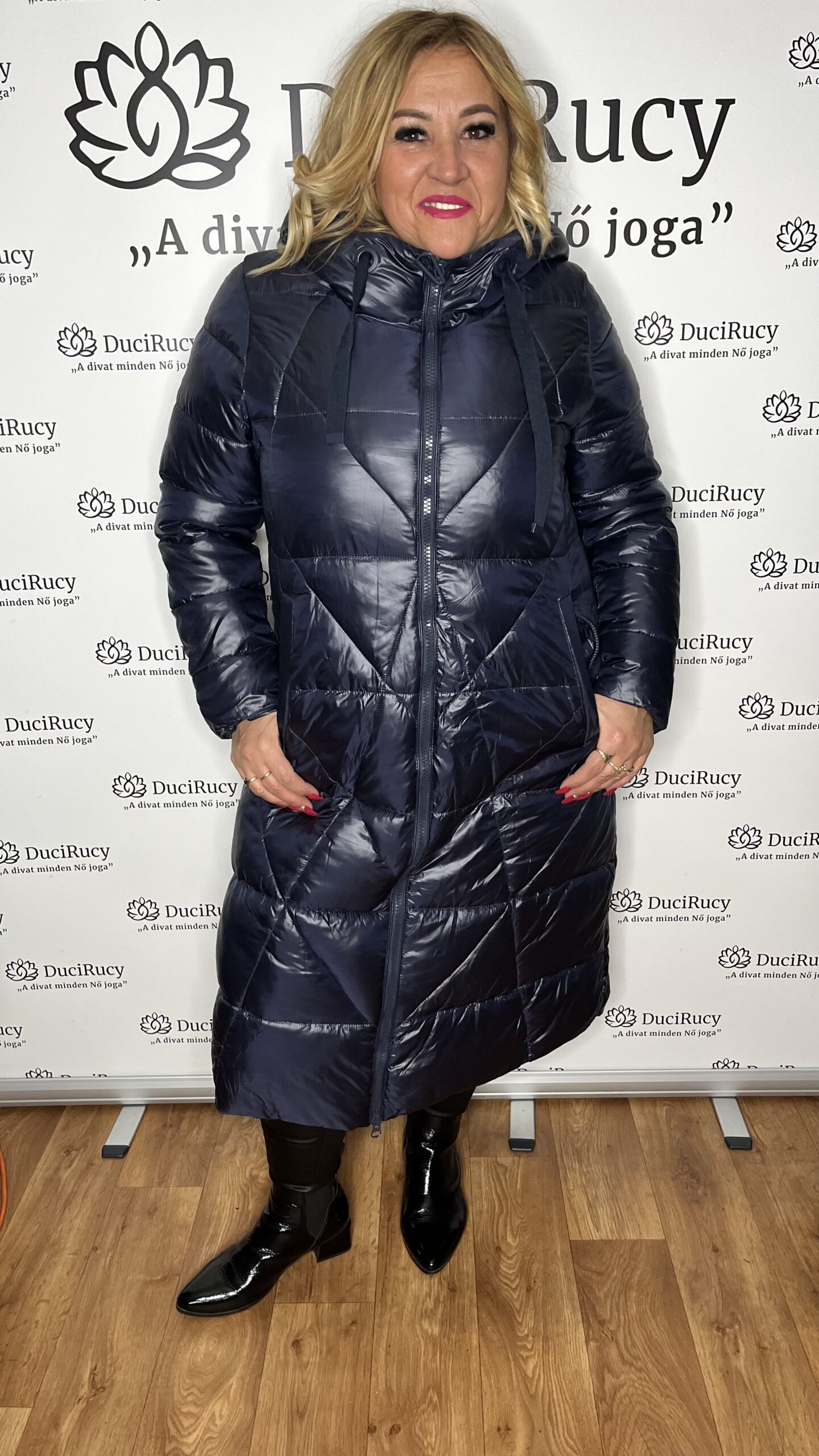 Hosszú fazonú, steppelt kapucnis téli kabát. A kapucni nem levehető. A zipzár alulról is felhúzható, hogy akár kocsiban, akár kerékpáron kényelmesebb legyen.