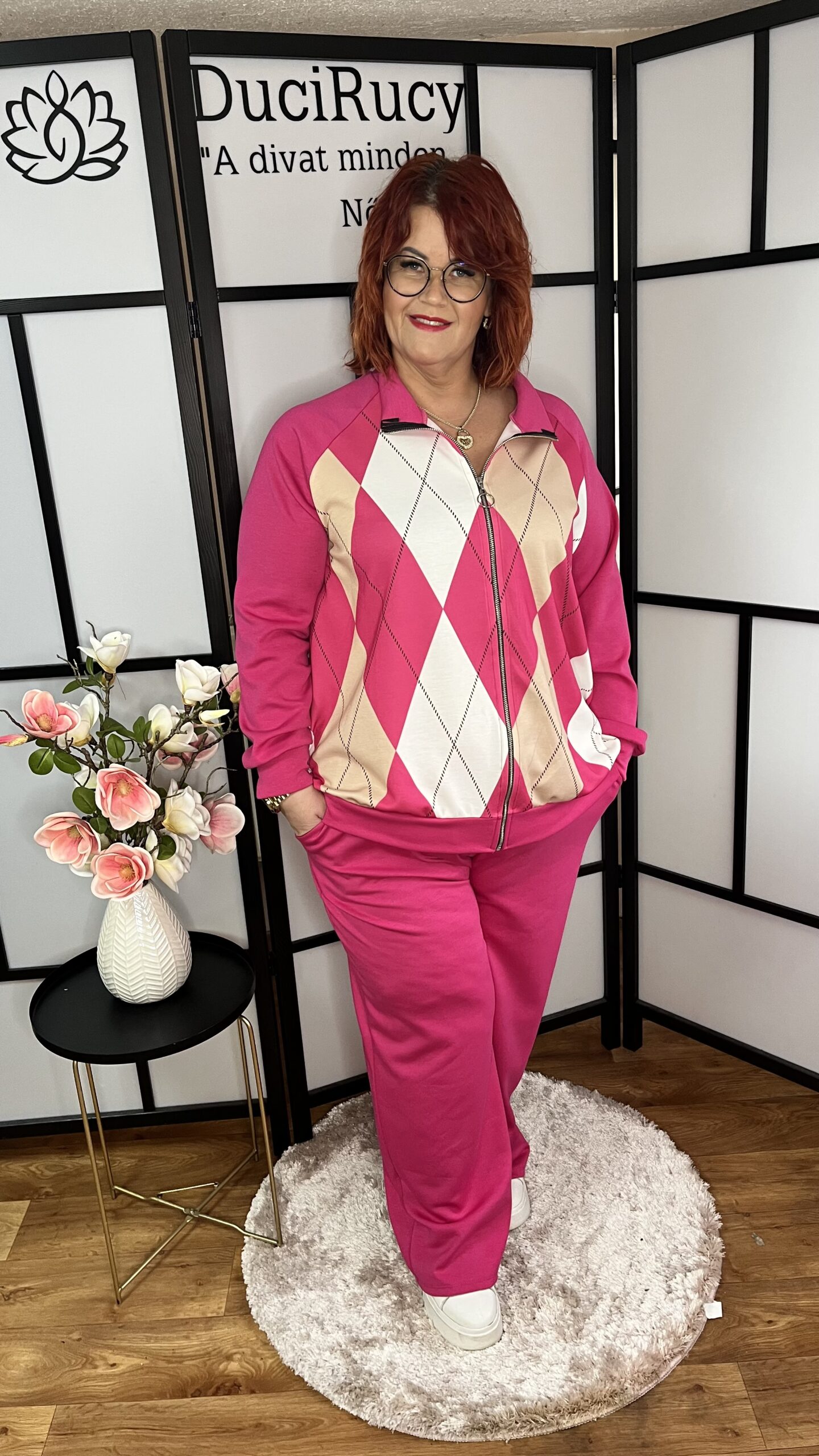 Prémium anyagból készült, nagyon trendi és divatos, az idei tavasz sláger mintájával készített szabadidő együttes. A felső rész zipzáros, passzés aljú, a nadrág zsebes, az alja pedig egyenes fazonú, nincs rajta passzé rész.