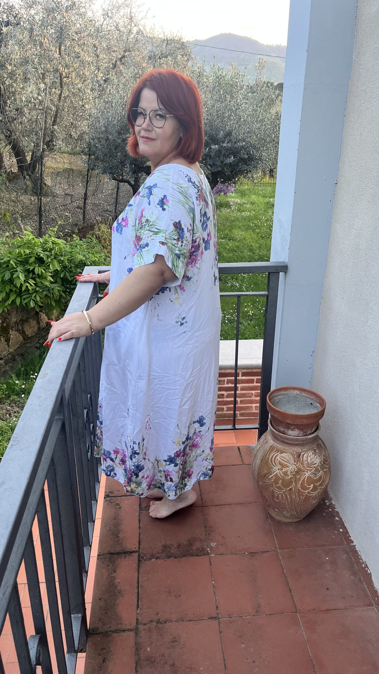 Kerek nyakú, vállnál és alul virág mintás, zsebes maxi len ruha fango színben mennyiség