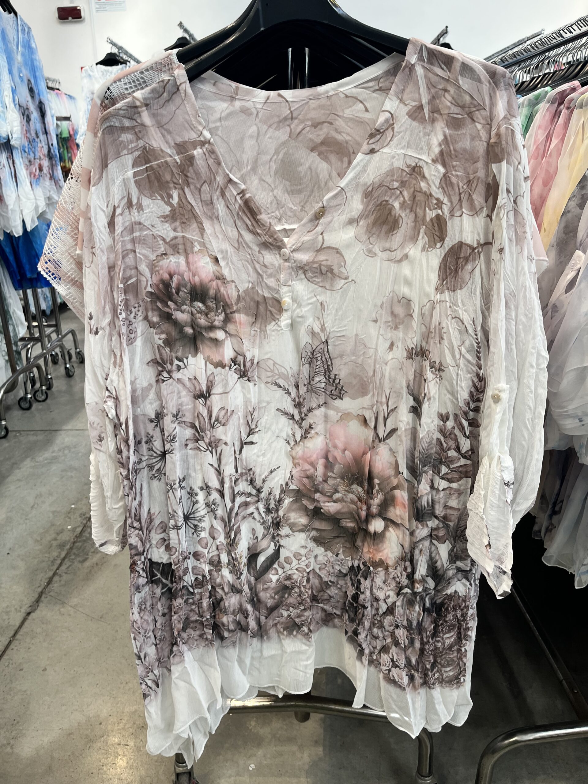 Kétrétegű, gyűrt, virágmintás tunika barna színben mennyiség