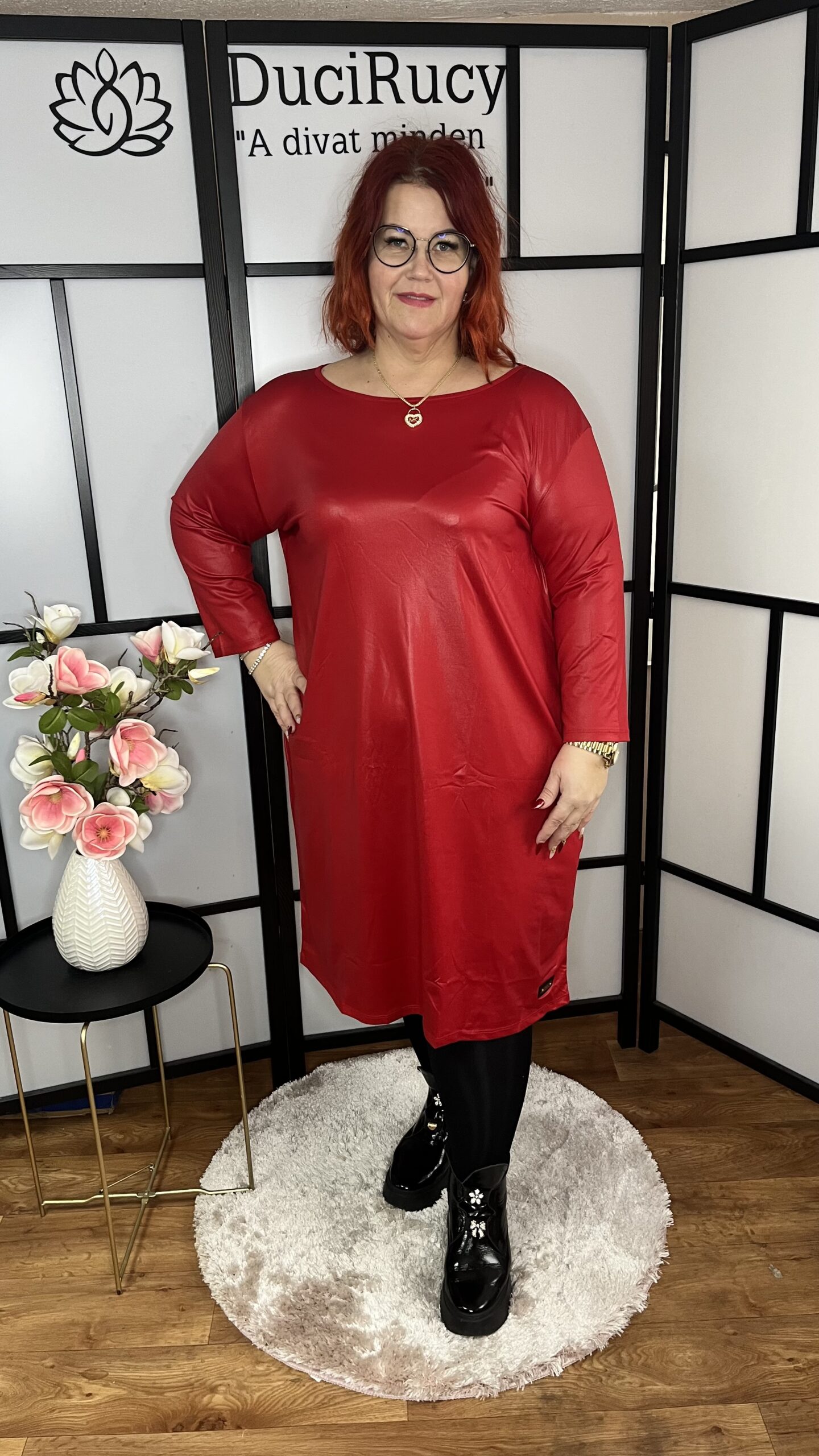 Kissé fényes anyagból készült gyönyörű kerek nyakú hagymaruha oldalán két zsebbel. Nagyon előnyös fazon molett hölgyeknek. Bármilyen alkalomra felvehető, de a hétköznapokban is megállja a helyét.