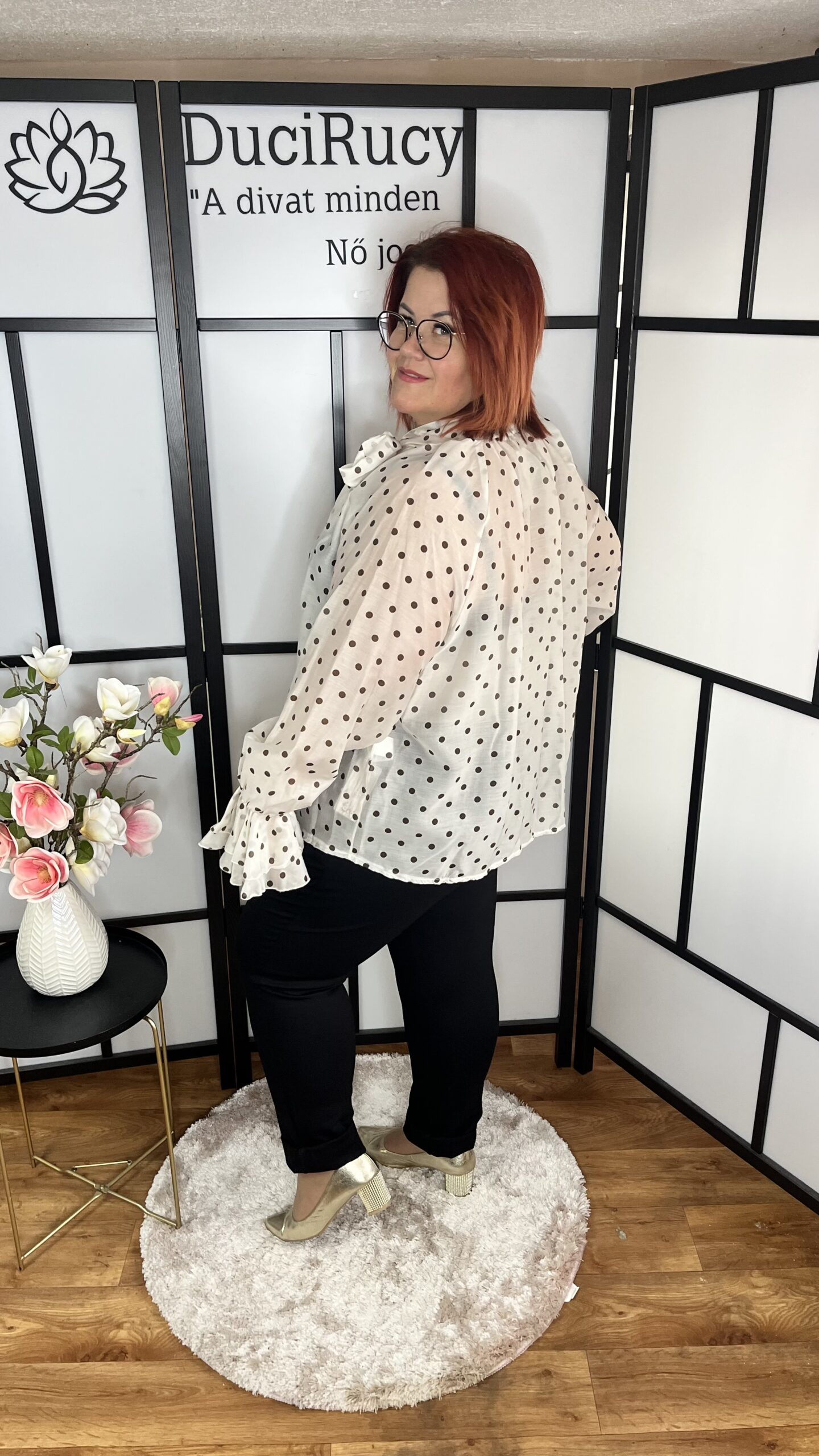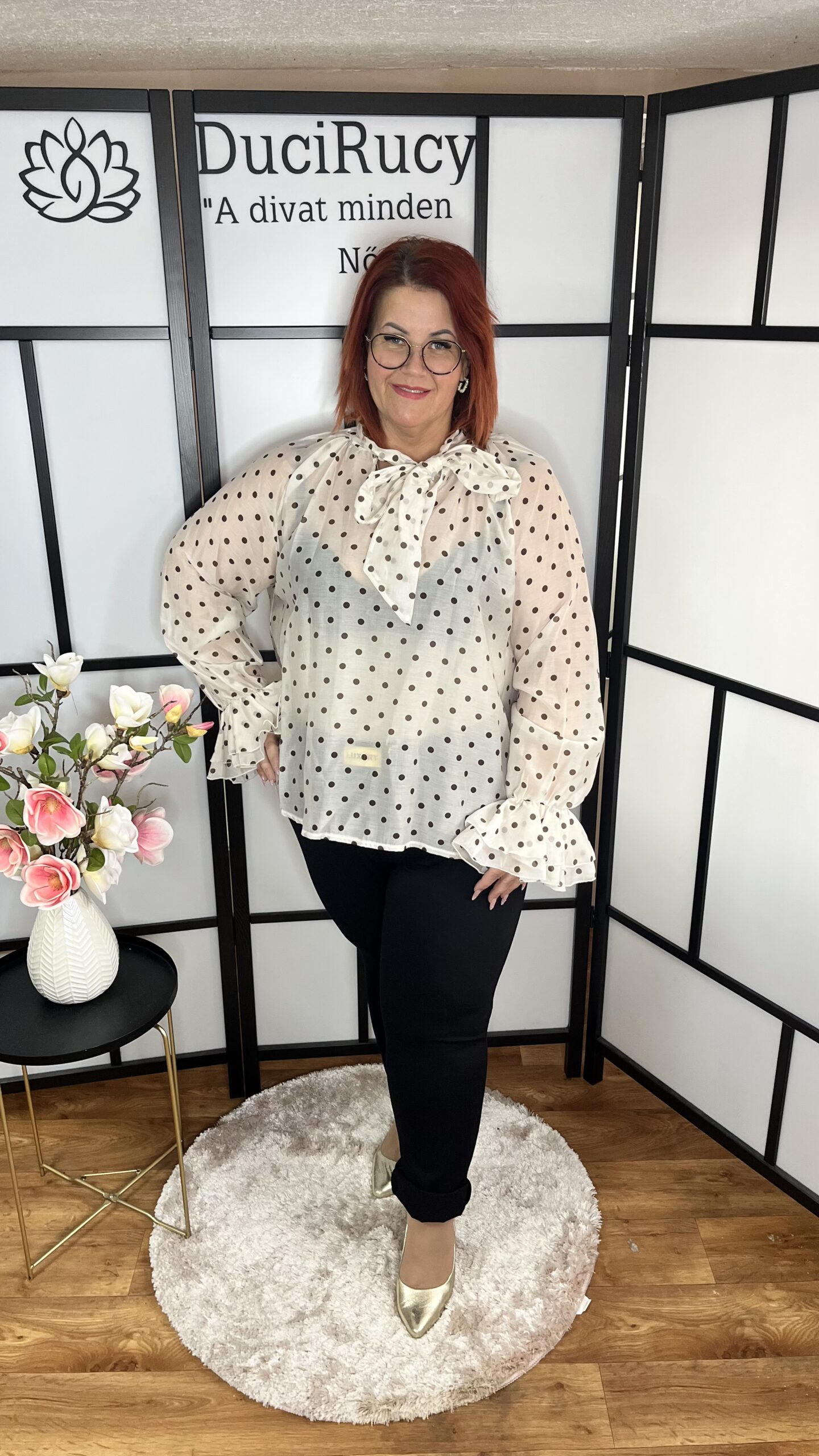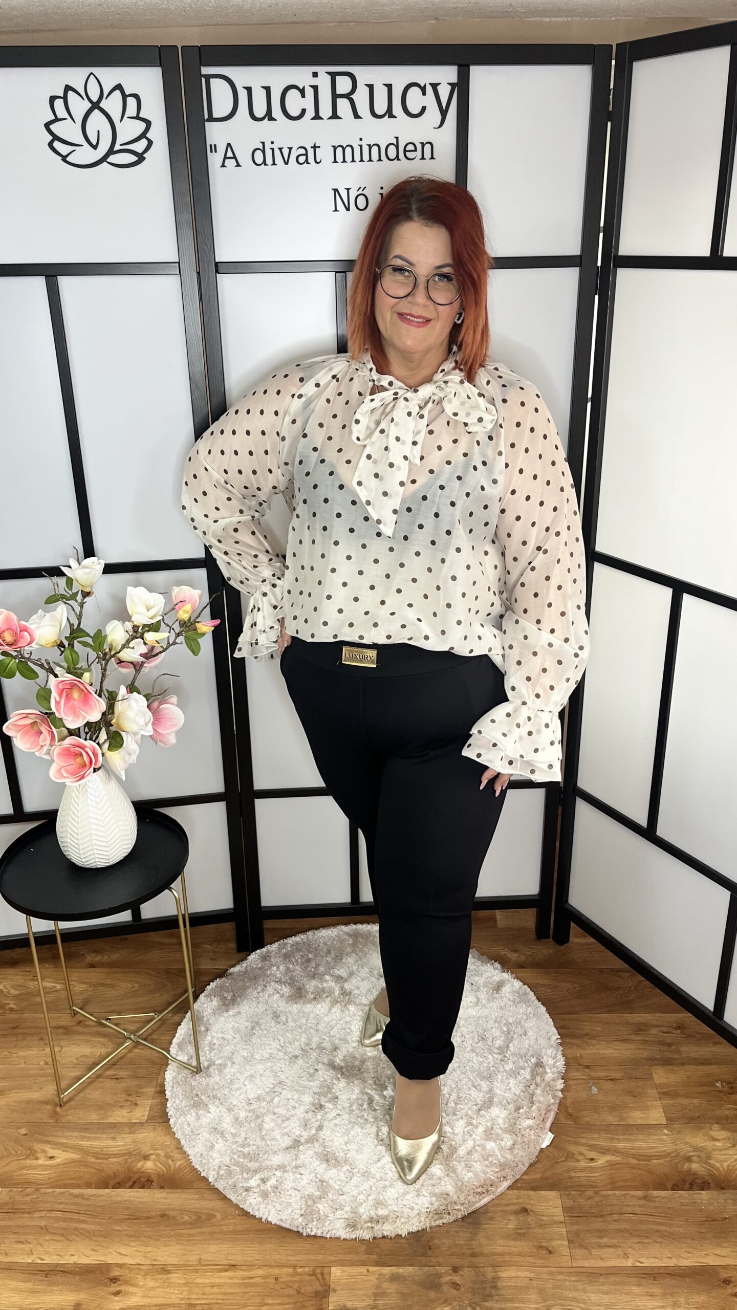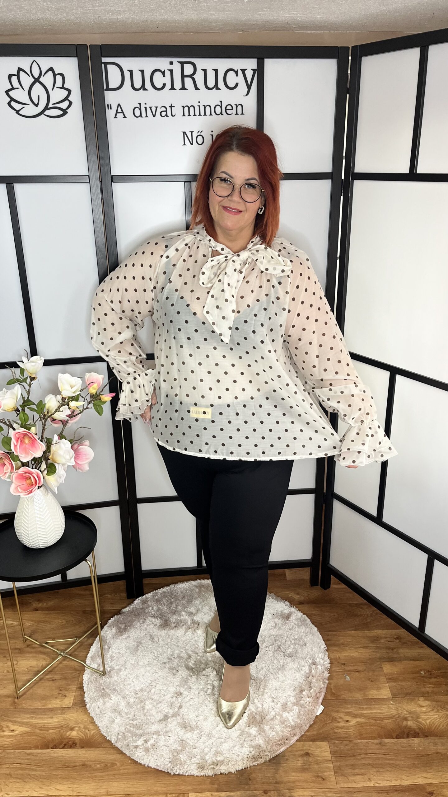 Különleges könnyed, légies olasz pöttyös blúz nyaknál megköthető fazonnal. Csuklónál fodor díszíti. Igazi csajos álomdarab. Egyméretű, szoknyával, nadrággal egyaránt használható. Fantasztikus, sikkes megjelenést eredményez a viselete.