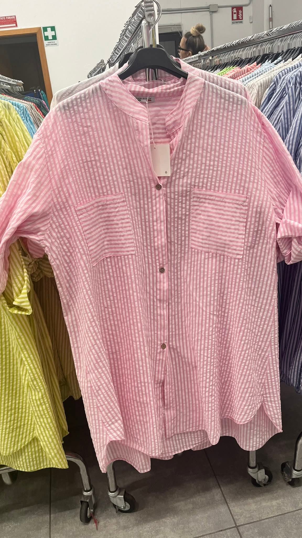 Lenge, könnyed anyagú, V nyakú, hosszában csíkos, végig gombos fazonú ingtunika, mellrésznél két zsebbel. A tunika anyaga nem rugalmas. Amilyen egyszerű, olyan nagyszerű ez az ingtunika.