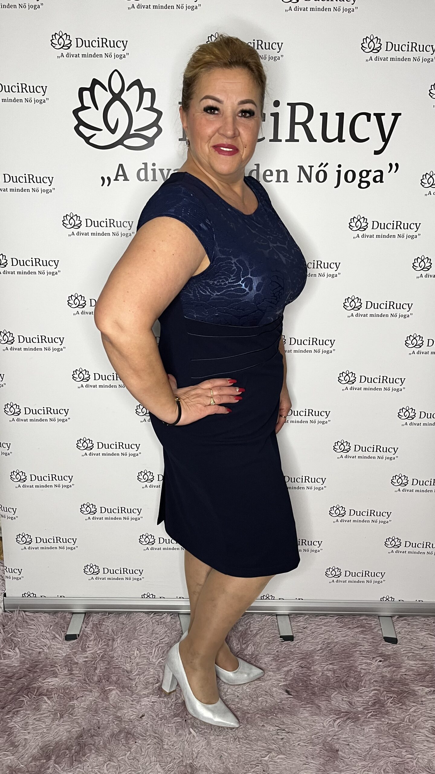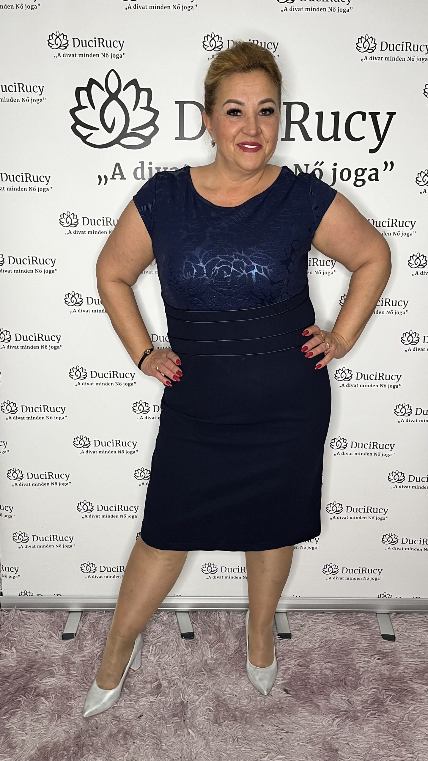 A modell a képeken a 44-es méretet viseli. Az Ő adatai: Mell és csípőbőség: 120 cm