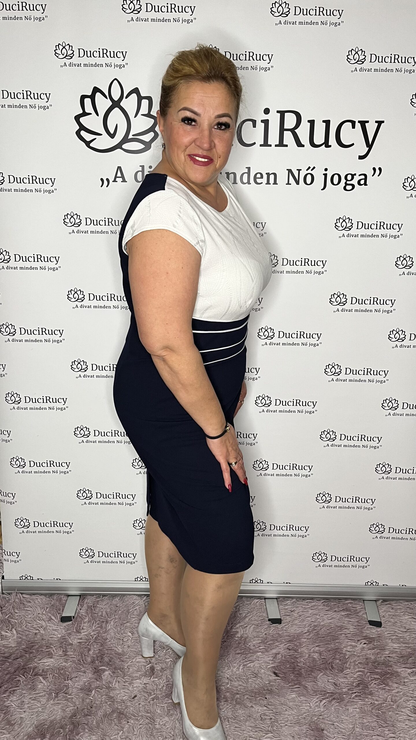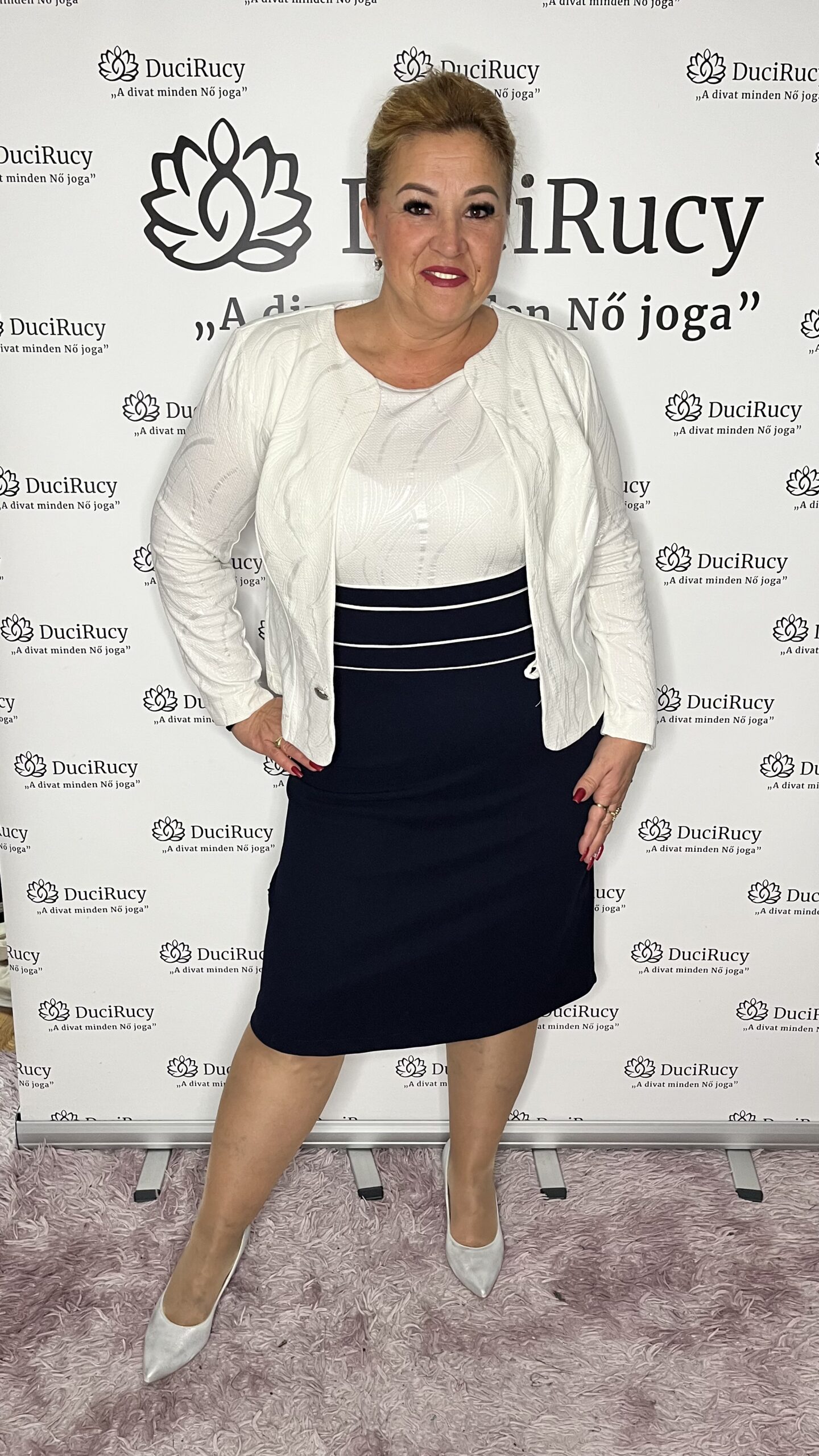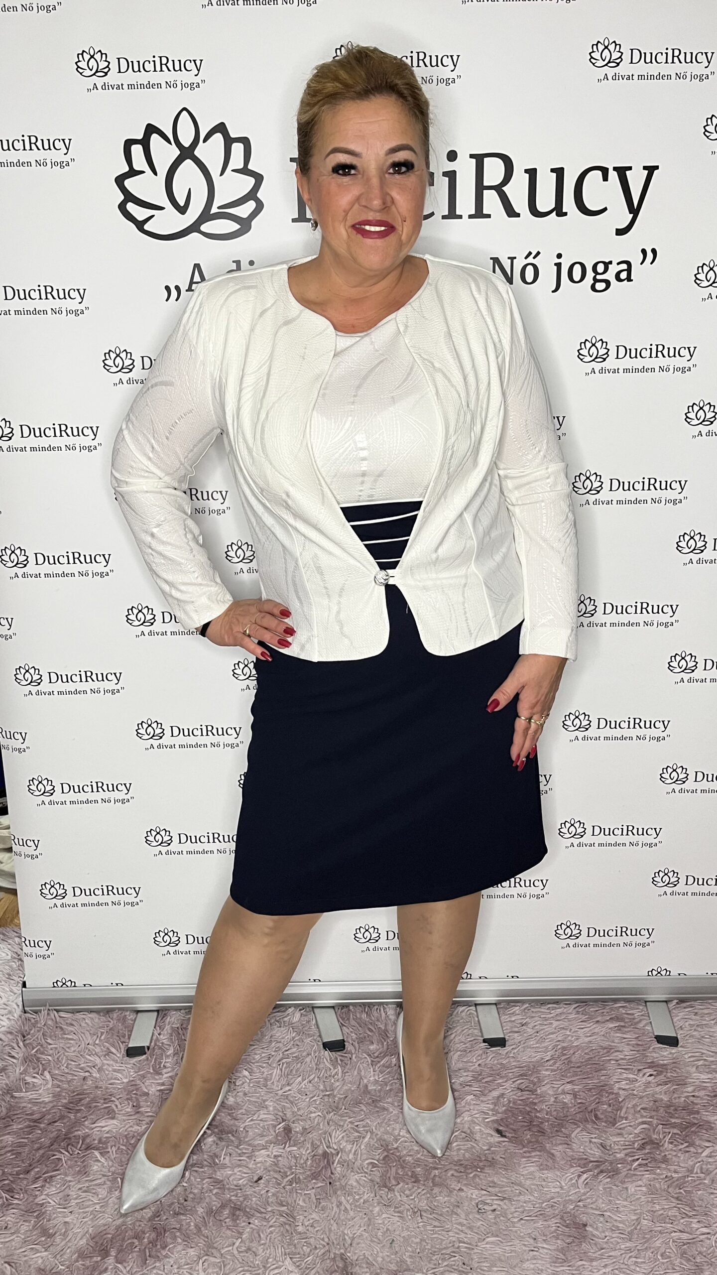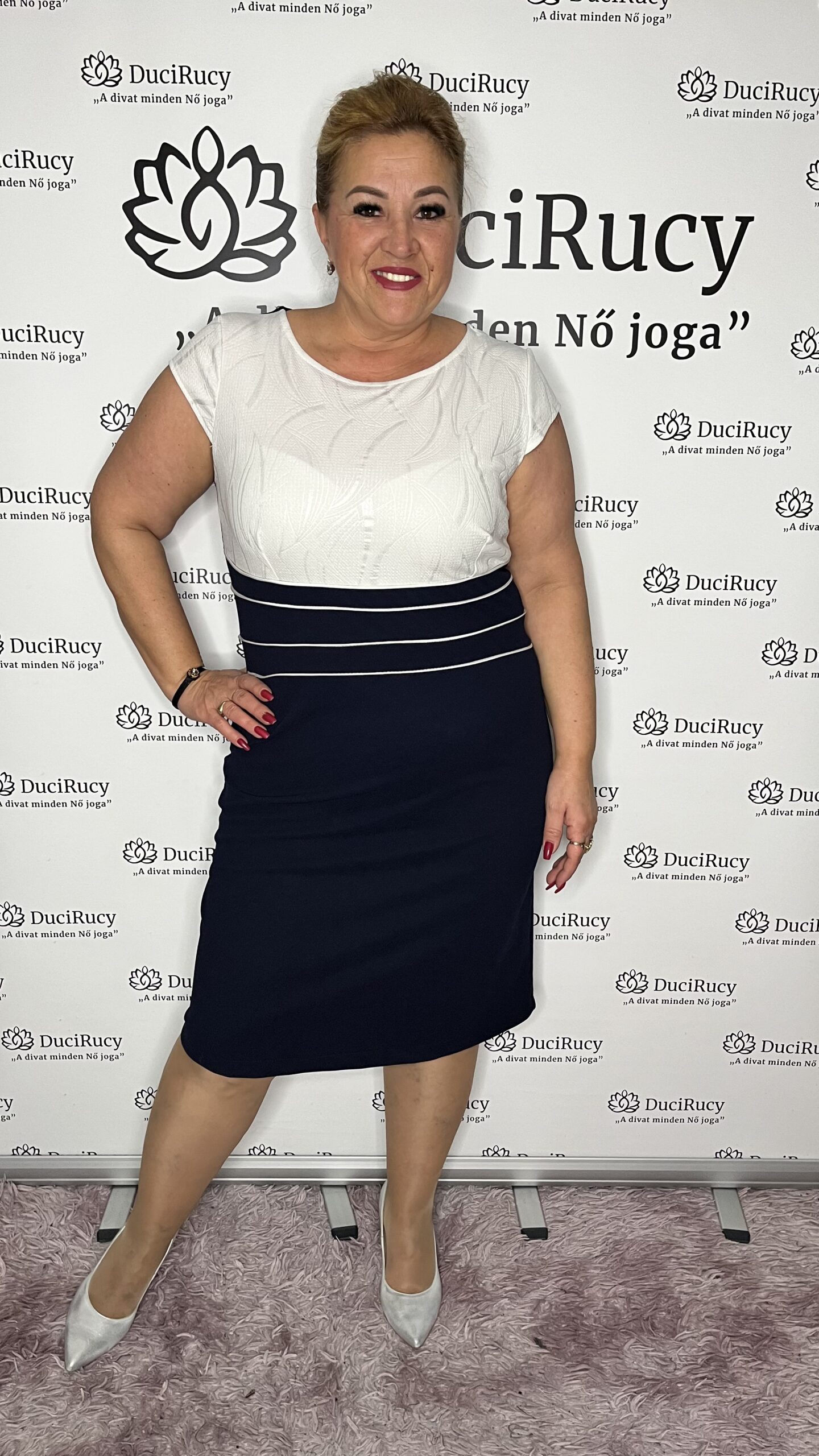 A modell a képeken a 44-es méretet viseli. Az Ő adatai: Mell és csípőbőség: 120 cm