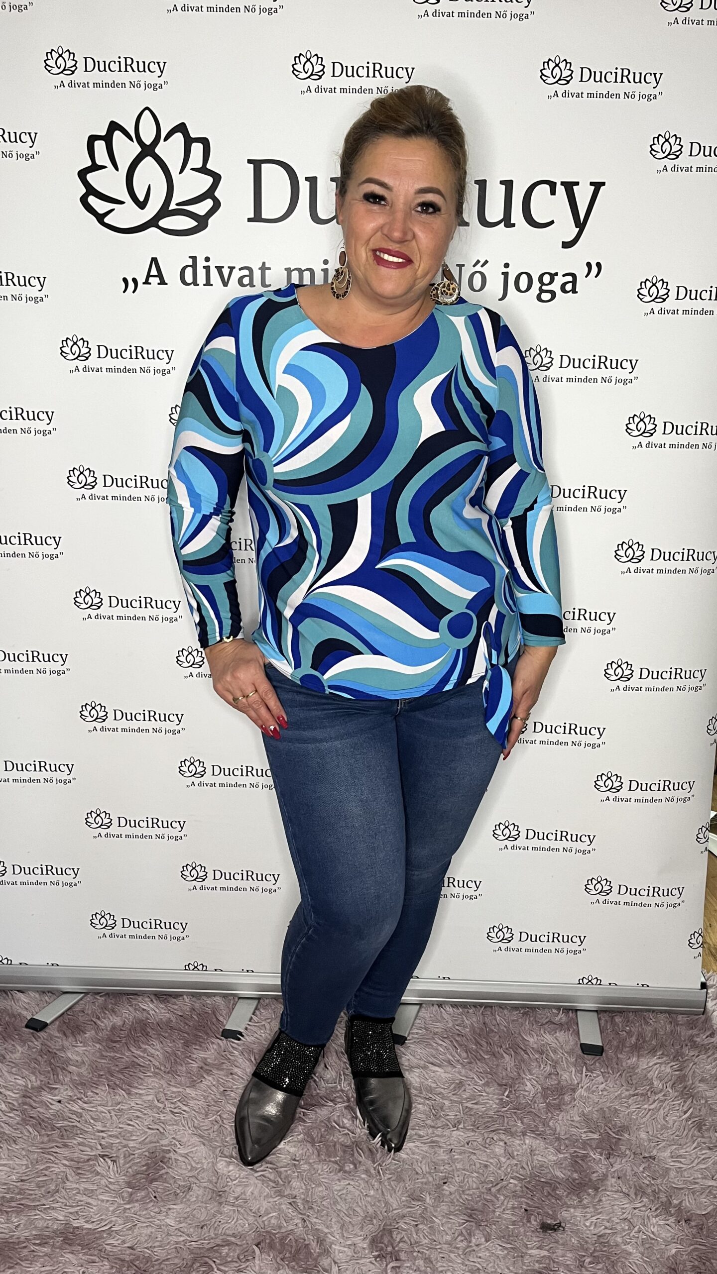 Lengyel kiváló minőségű, gyönyörű kék mintás, enyhén kerekített fazonú, alul megkötős blúz. A blúz anyaga rugalmas, bármilyen alkalomra viselhető.