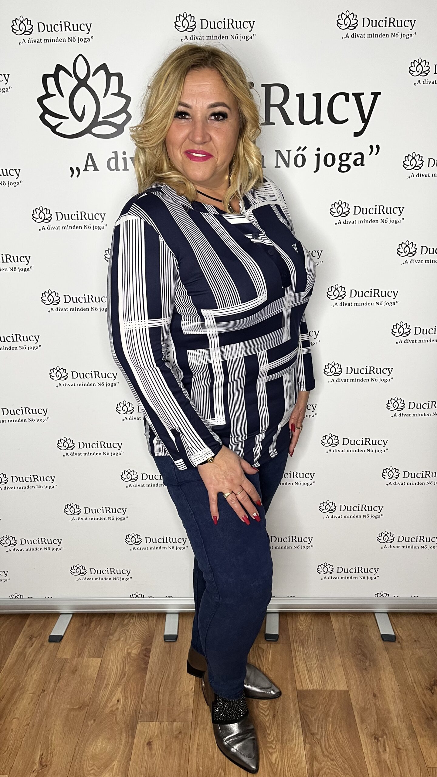 A képeken a modell a 46-os méretet viseli. A modell méretei: mell- és csípőbőség 120 cm, magassága 167 cm.