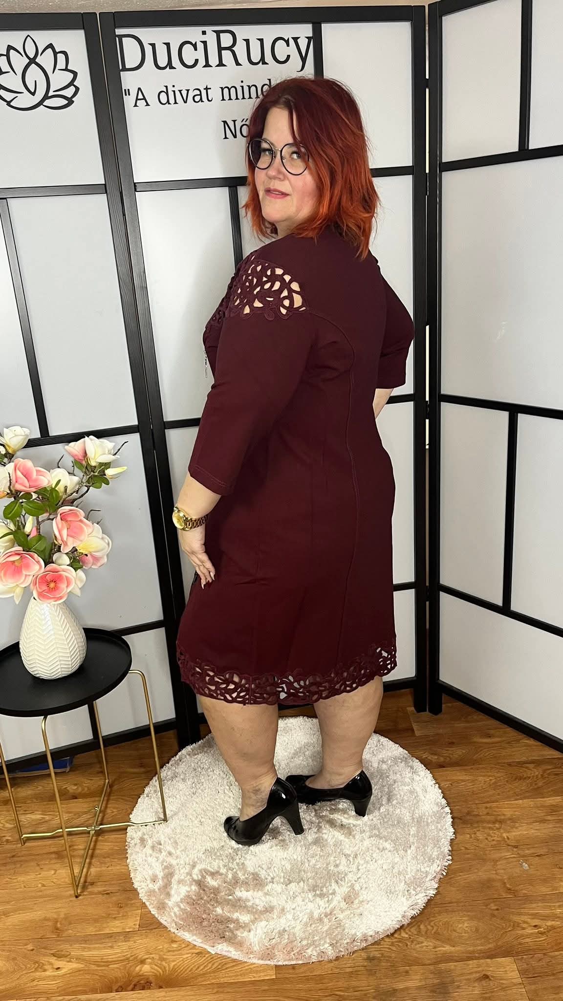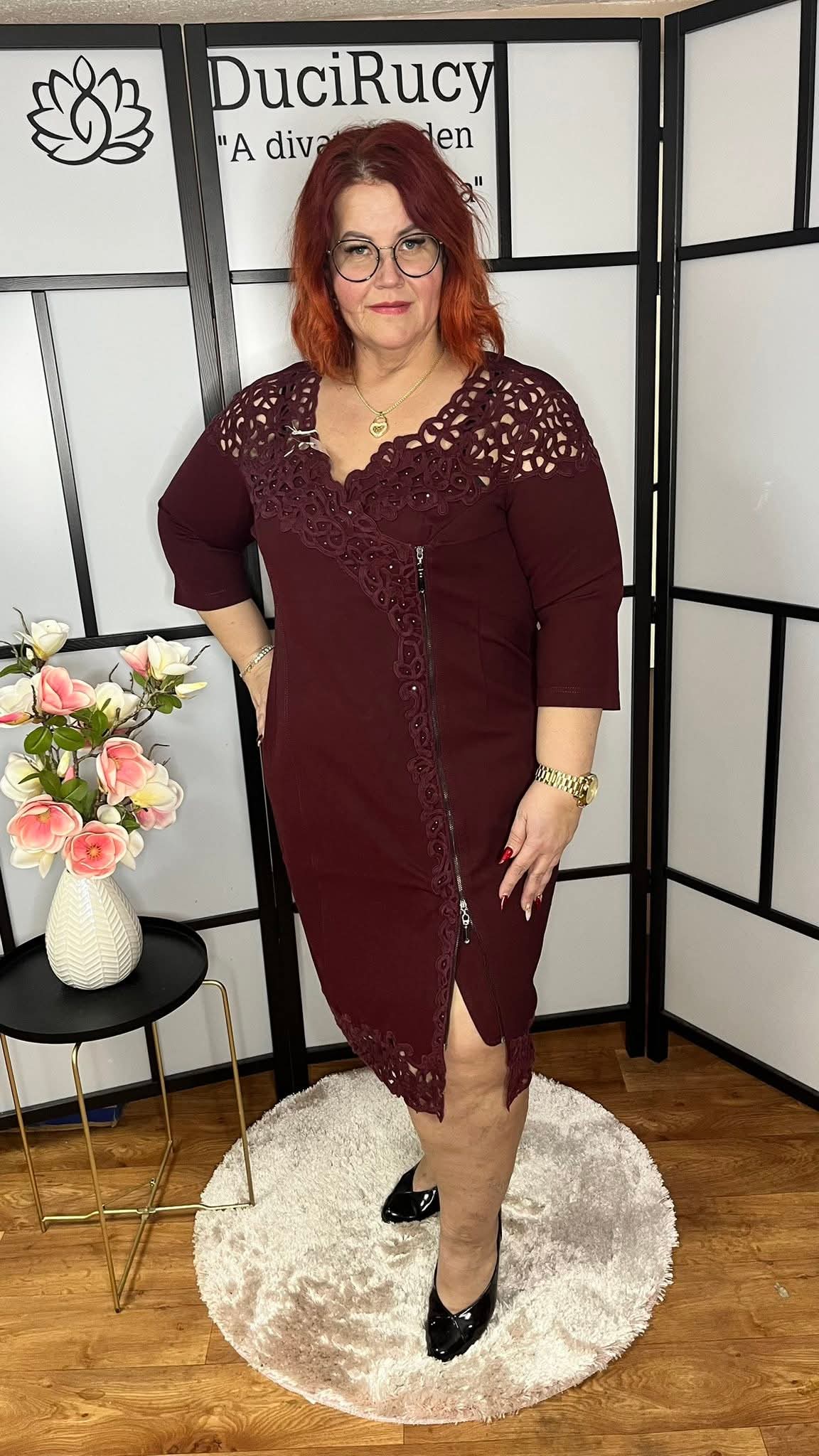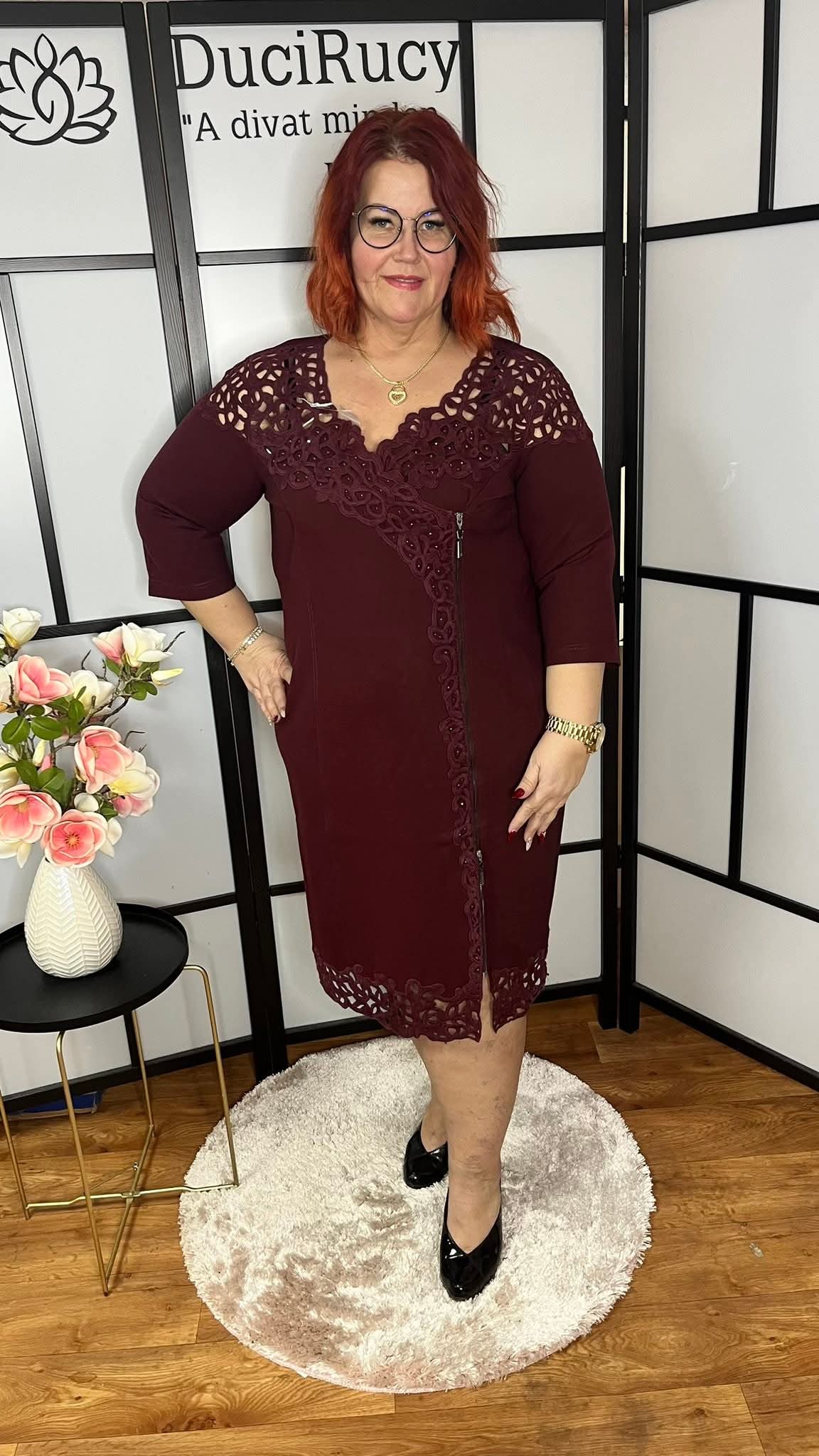 Igazán különleges és trendi madeirával és strasszkövekkel díszített zipzáros ruha. A ruha anyaga rugalmas. Igazán mutatós darab.