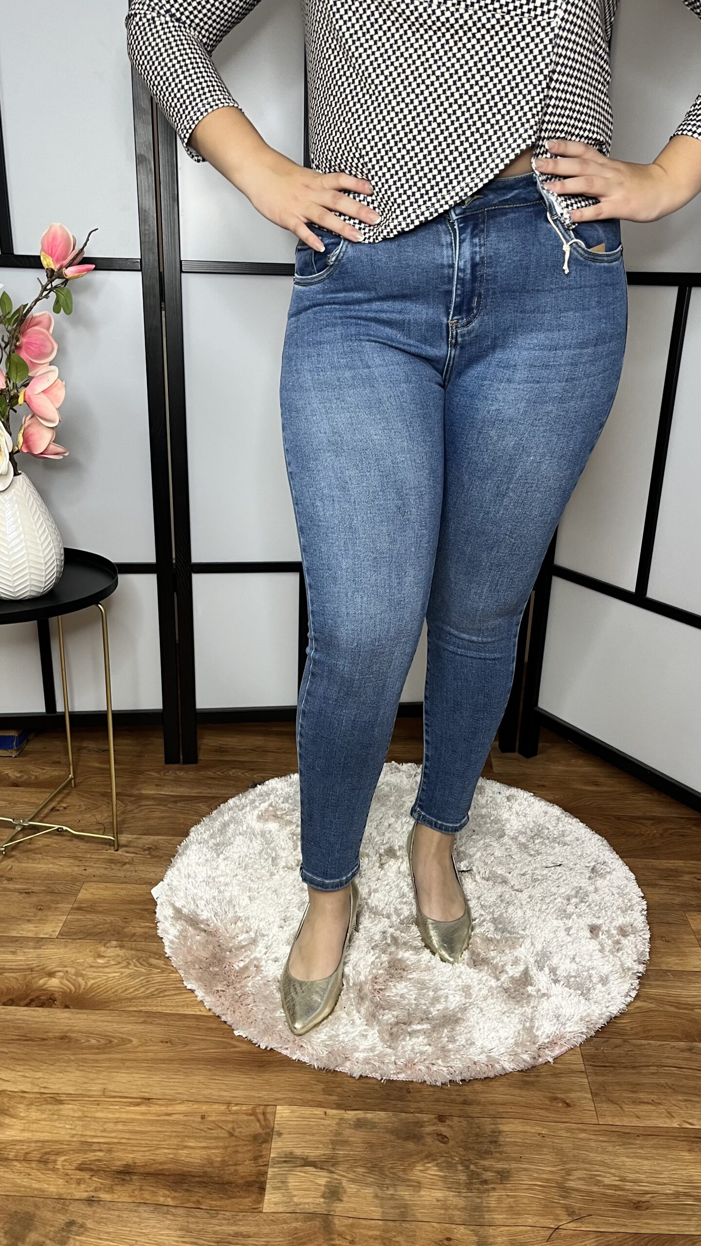Magas derekú, szűk szárú középkék színű rugalmas farmer nadrág
