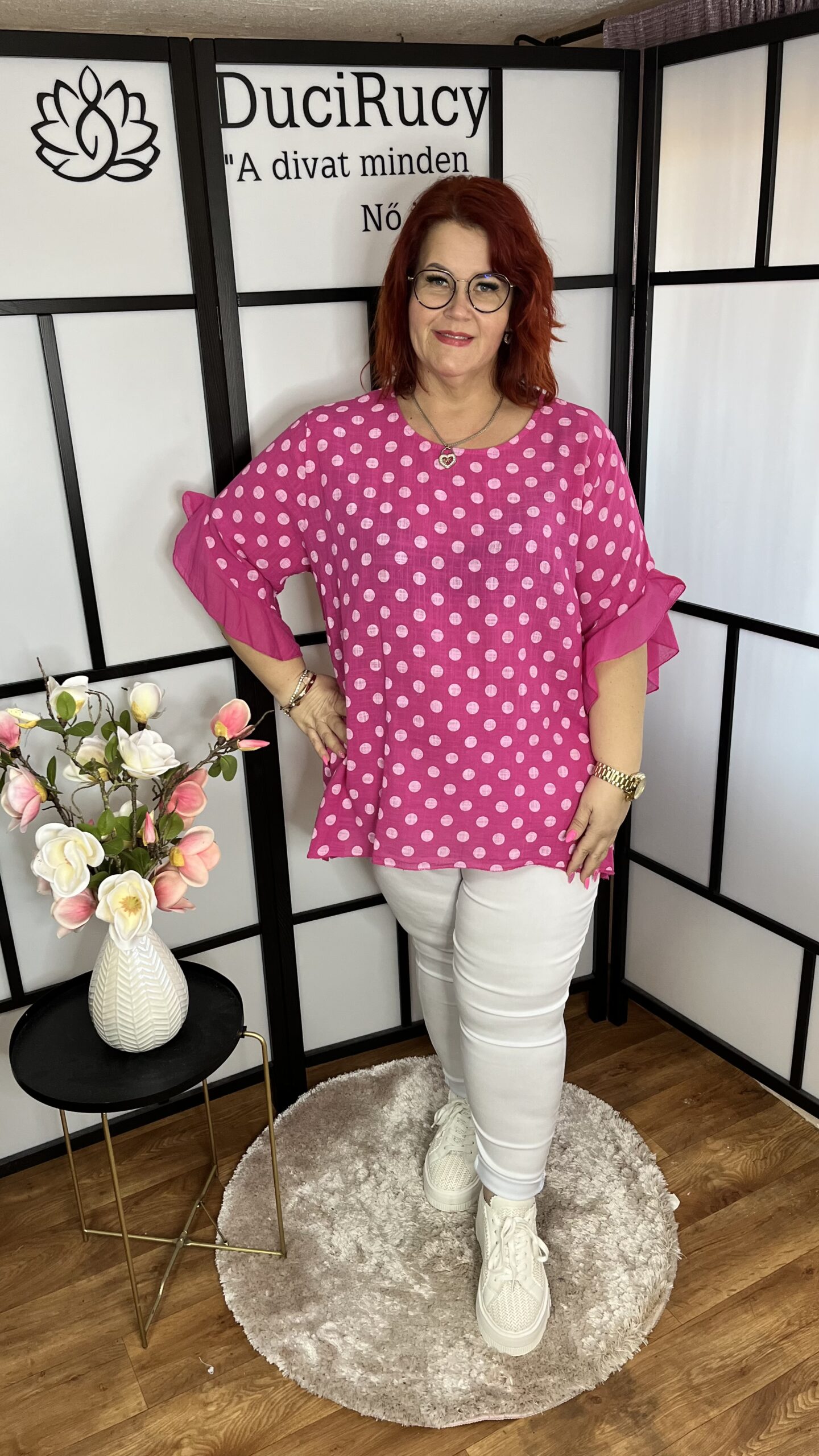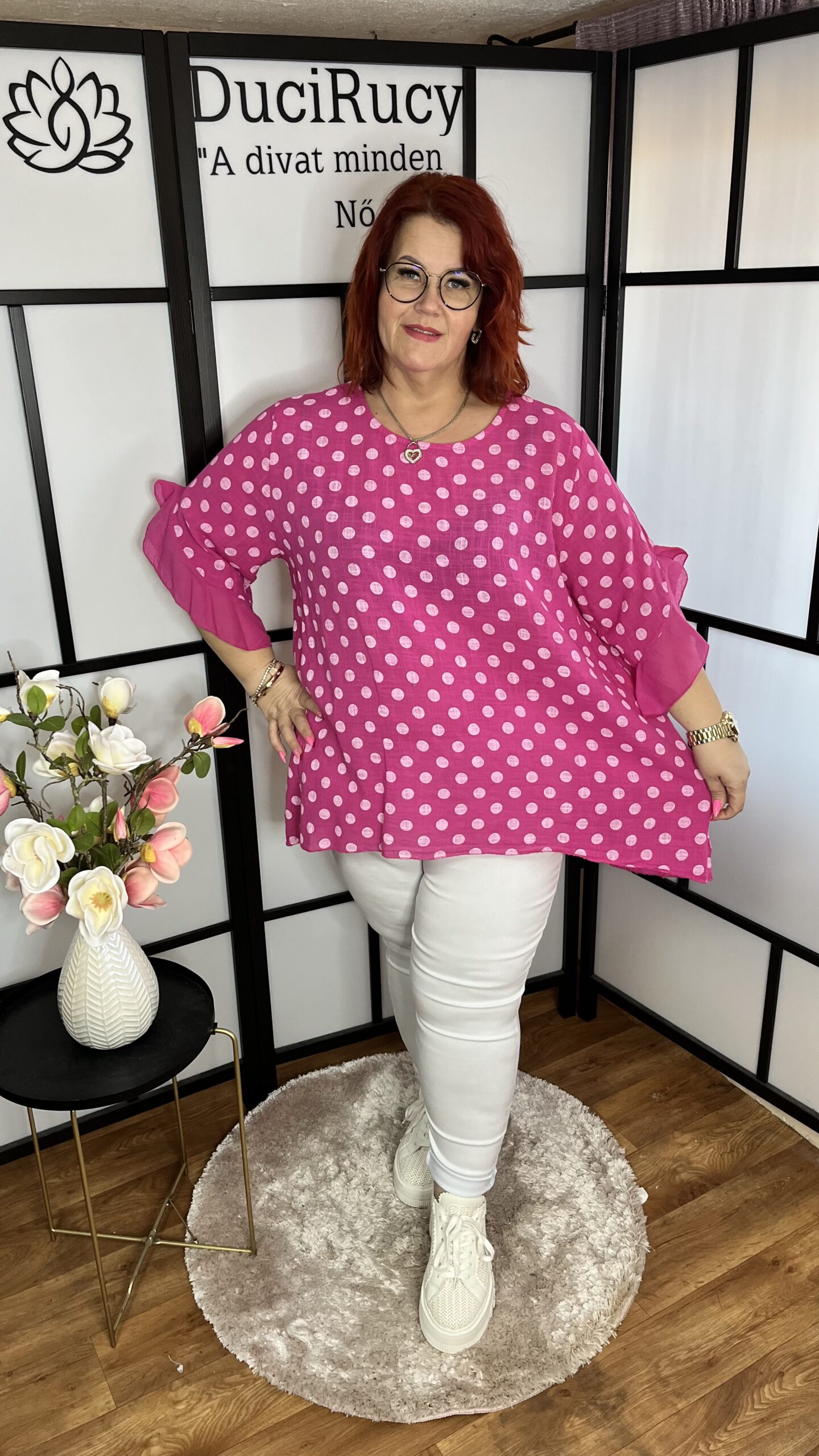 Magenta színű, kerek nyakú, pöttyös, fodros ujjú, lenvászon tunika