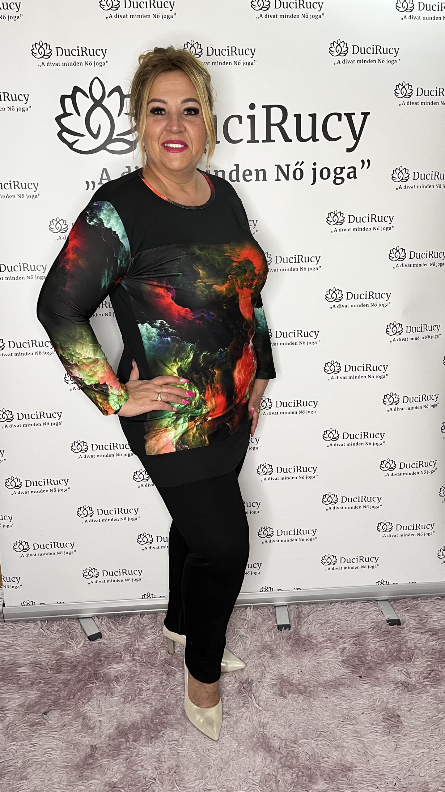 A képeken a modell az XL méretet viseli. A modell méretei: mell- és csípőbőség 120 cm, magassága 167 cm.