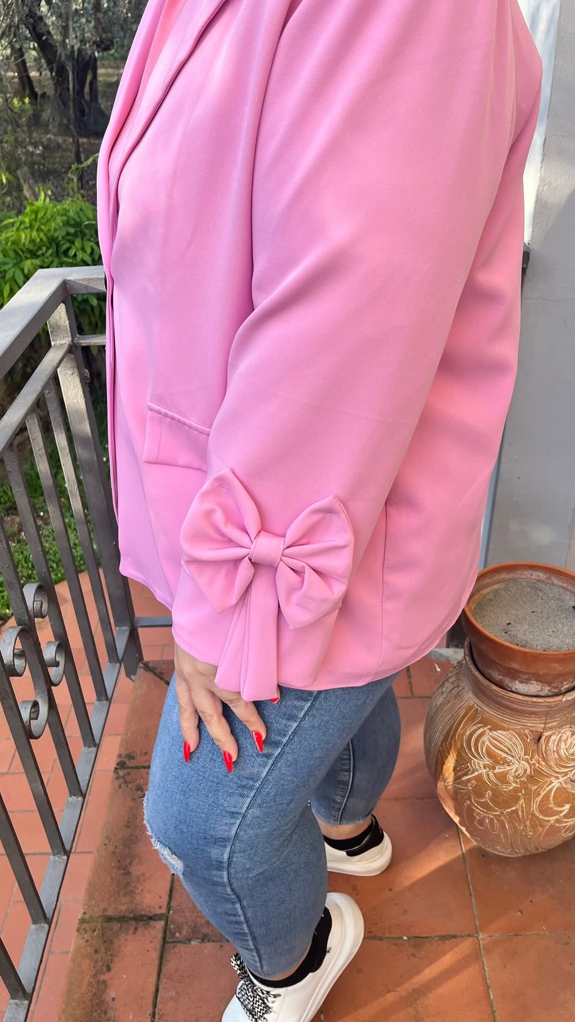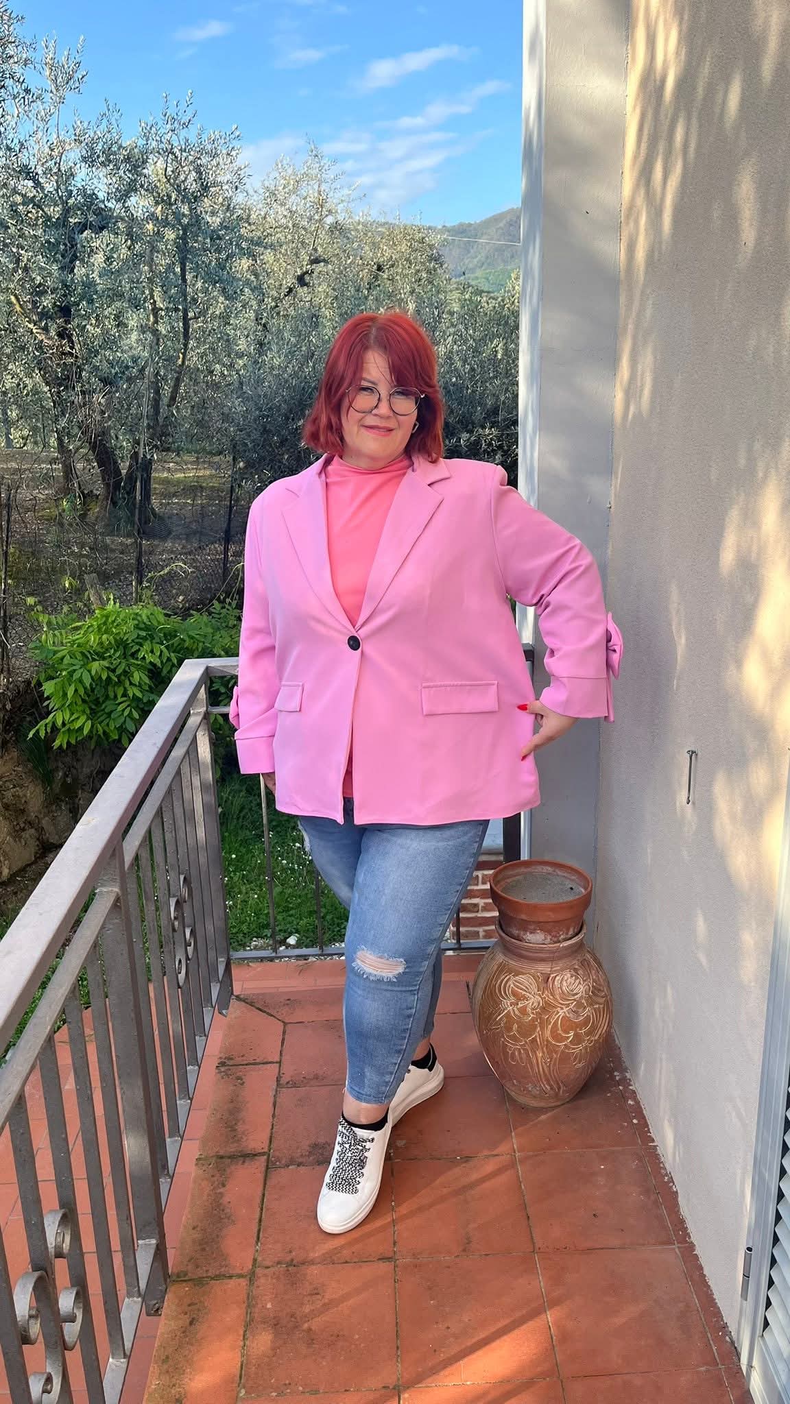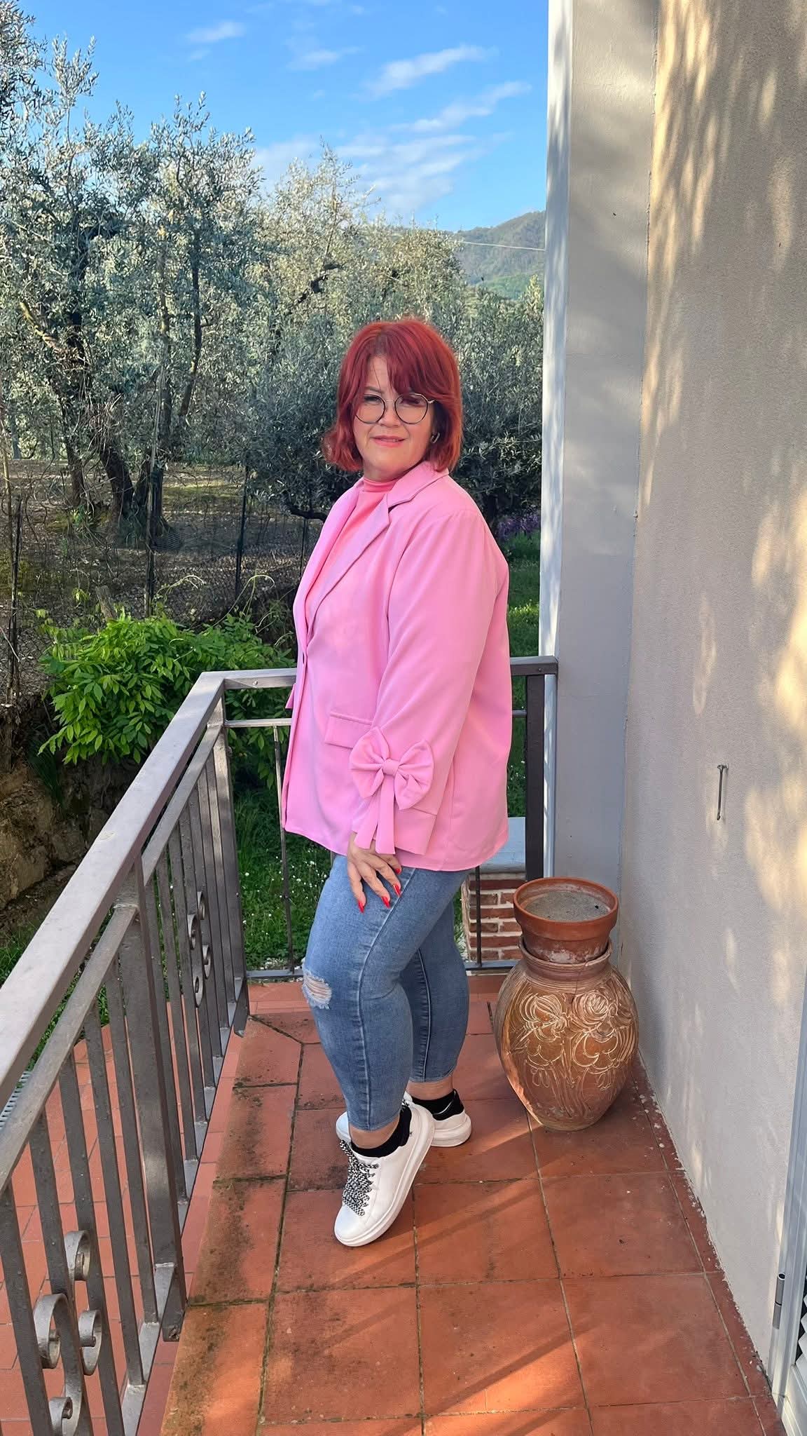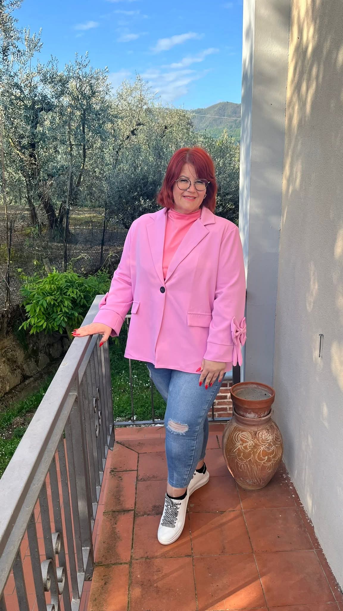 Közép méretű gomb nélküli, húzott ujjú blézer magenta színben