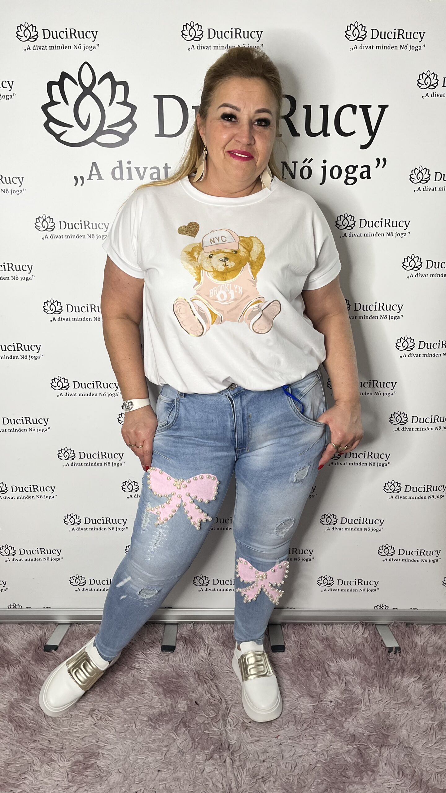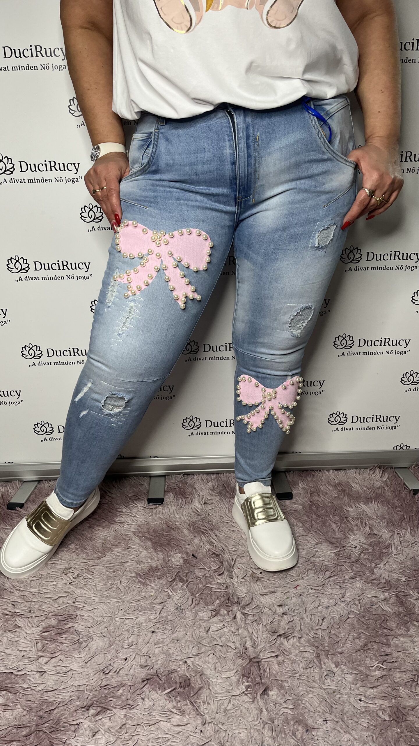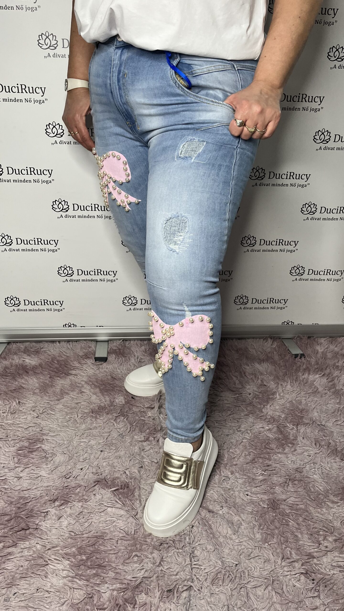 Masnival és gyöngyökkel díszített tavaszi-nyári farmer. Nagyon divatos, szuperül kombinálható.
