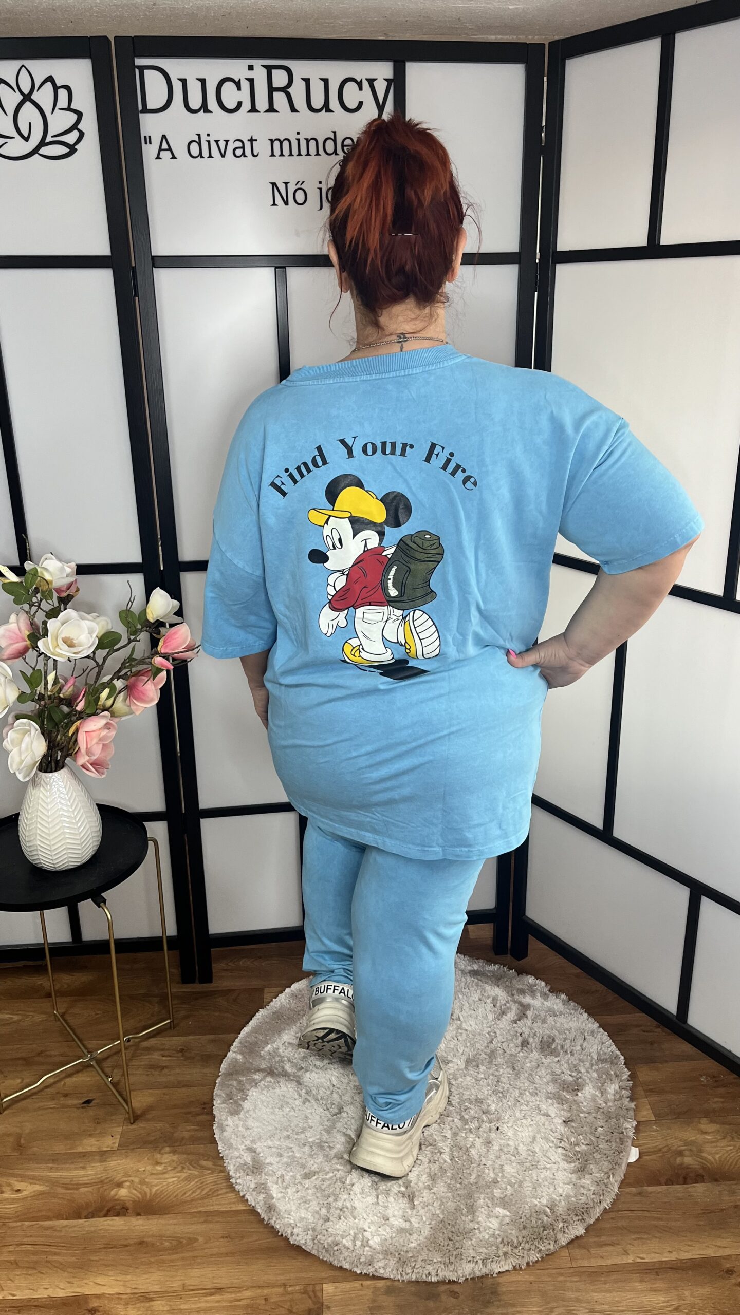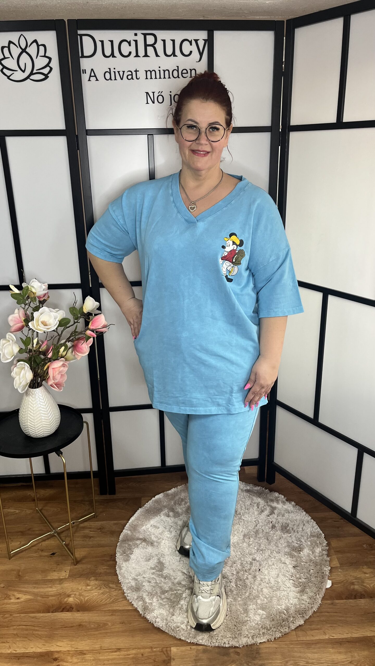Szuper pamut anyagból készült két részes együttes. Az együttes áll egy V nyakú, egyenes fazonú MICKEY EGÉR mintával díszített pólóból/tunikából, valamint egy gumis derekú, nagyon rugalmas zsebes nadrágból. A szett anyaga rugalmas pamut anyag.