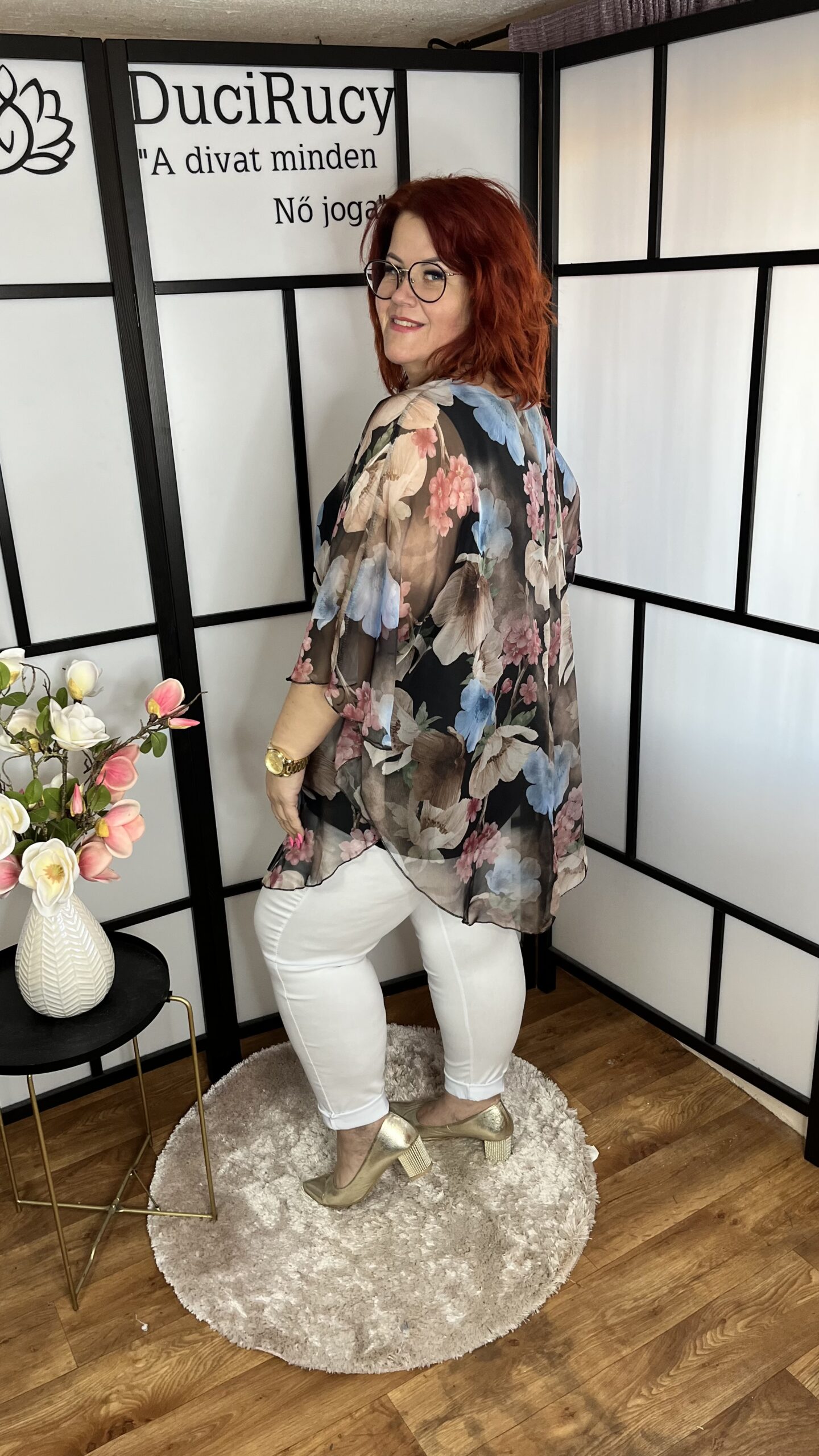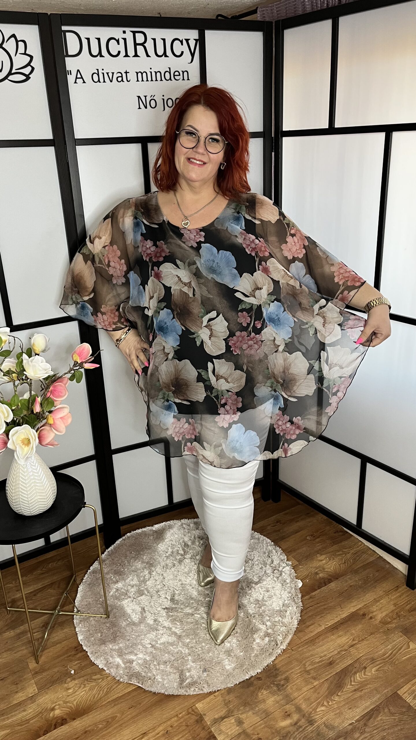A modell mellbősége 120 cm, csípőbősége 134 cm, magassága 167 cm.