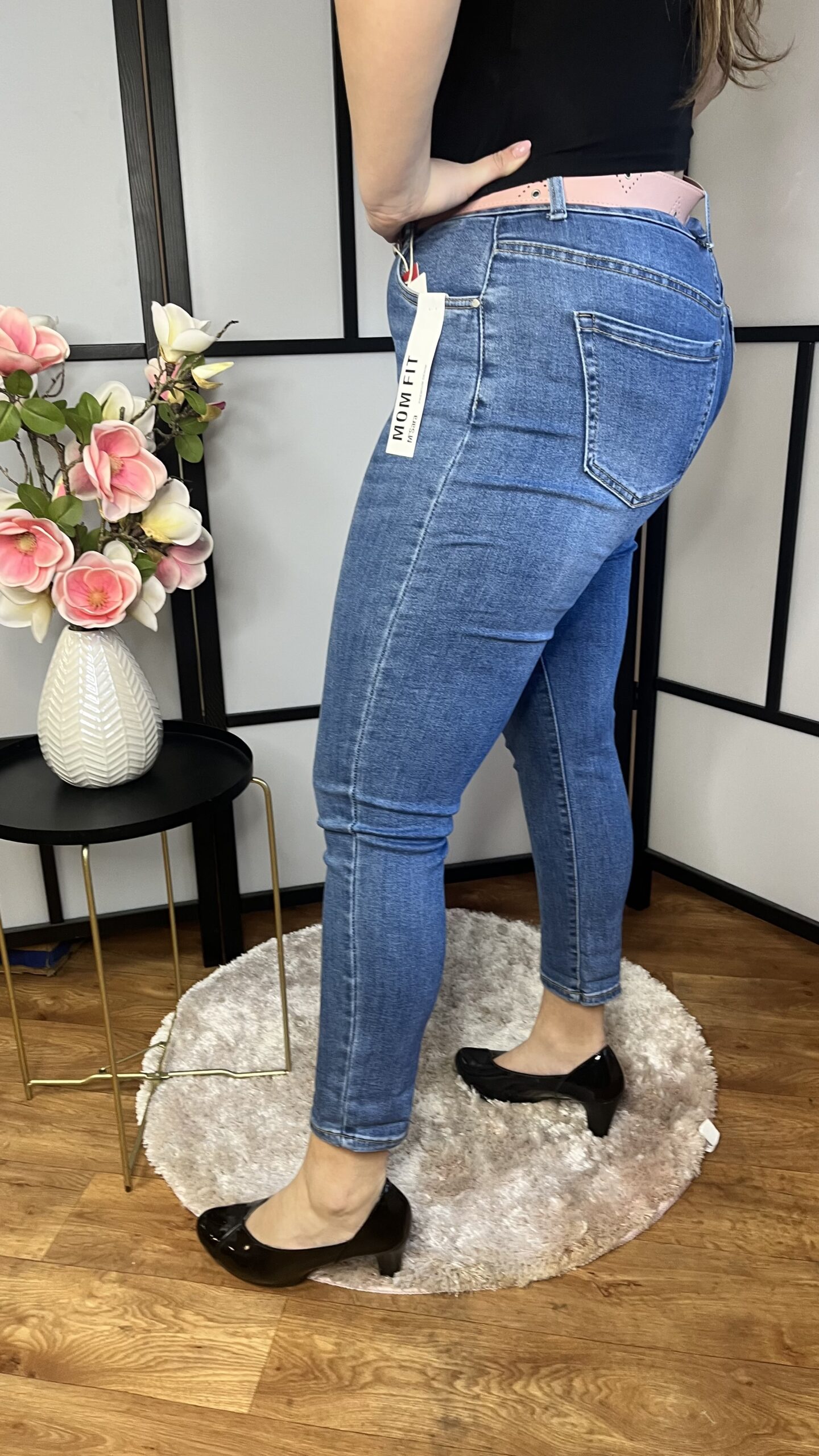 Momfit fazonú nagyon rugalmas tavaszi farmer nadrág középkék színben púder ajándék övvel. Nagyon kényelmes viselet egész napos viseletre. Normál magas dereka van.