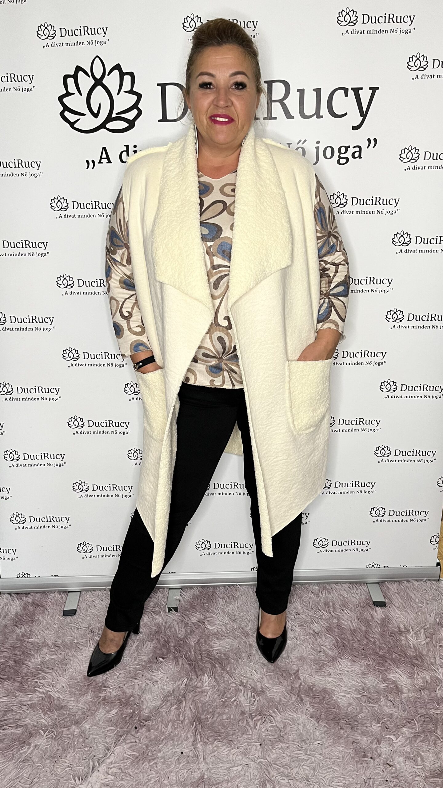 Divatos, puha mellény irha jellegű anyagból. A mellény elől hosszított fazonú, elején két zsebben díszített.