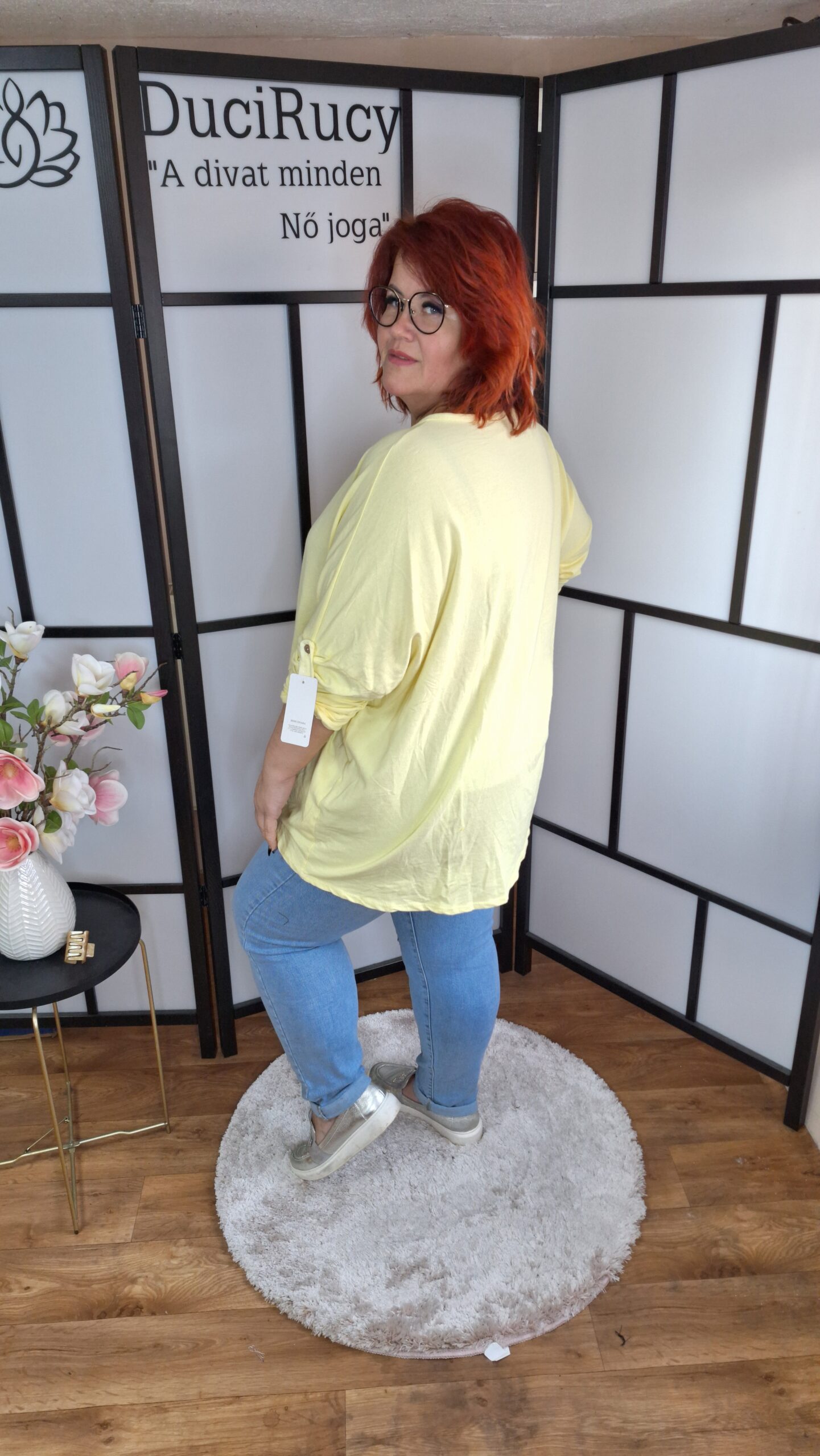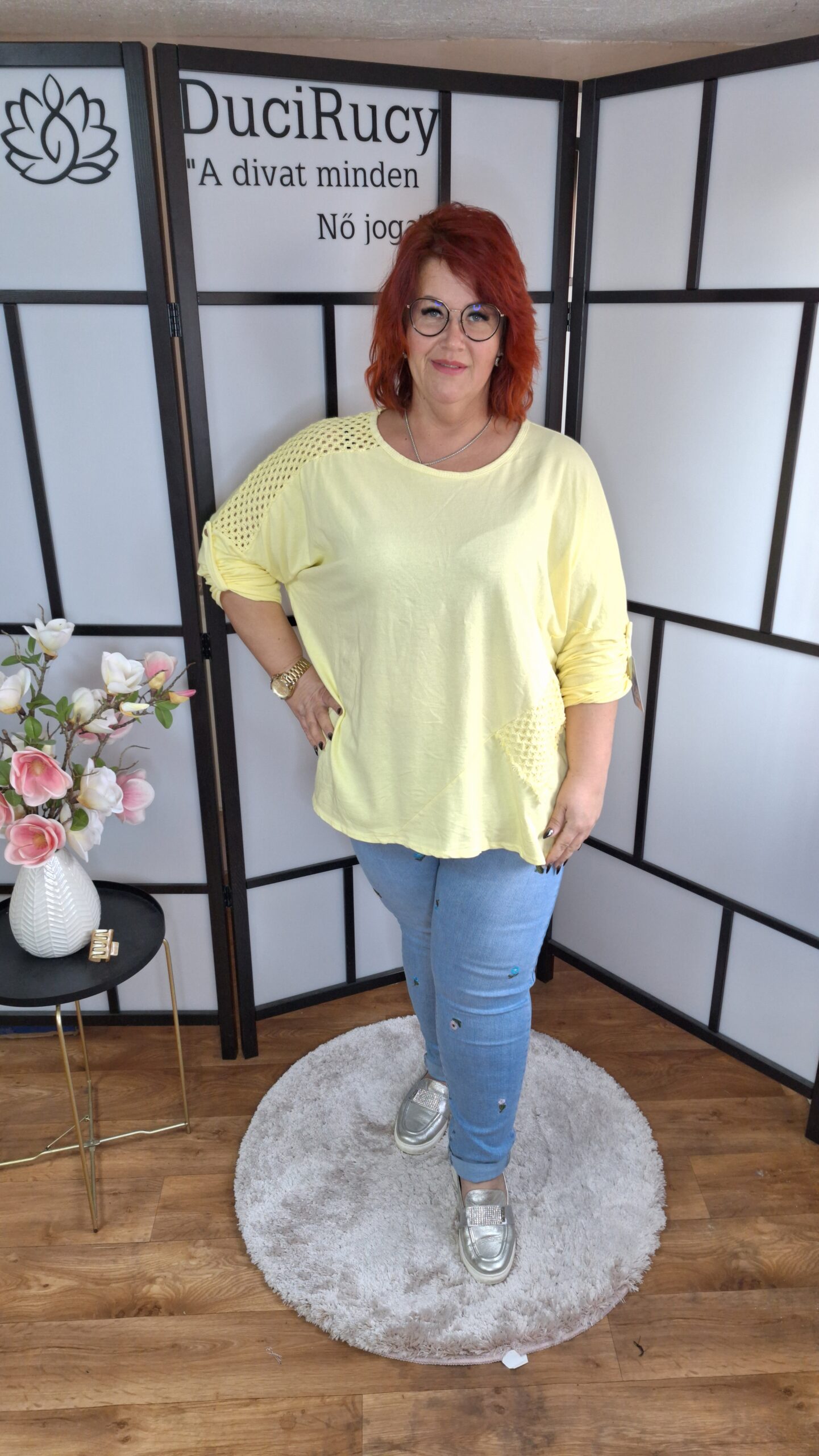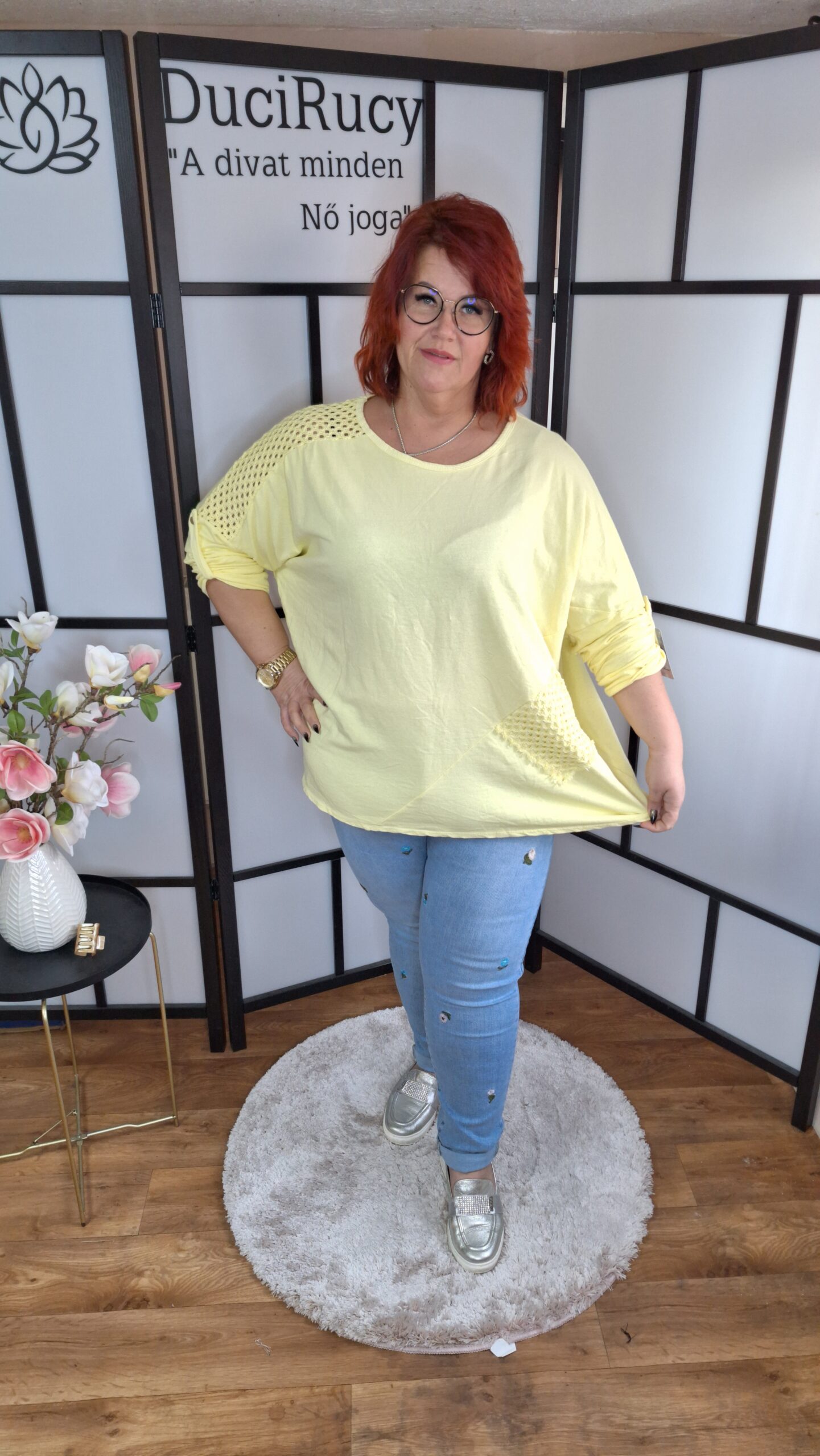 Olasz csodás pamut anyagból készült horgolt betétekkel díszített felső nagy méretben citrom színben