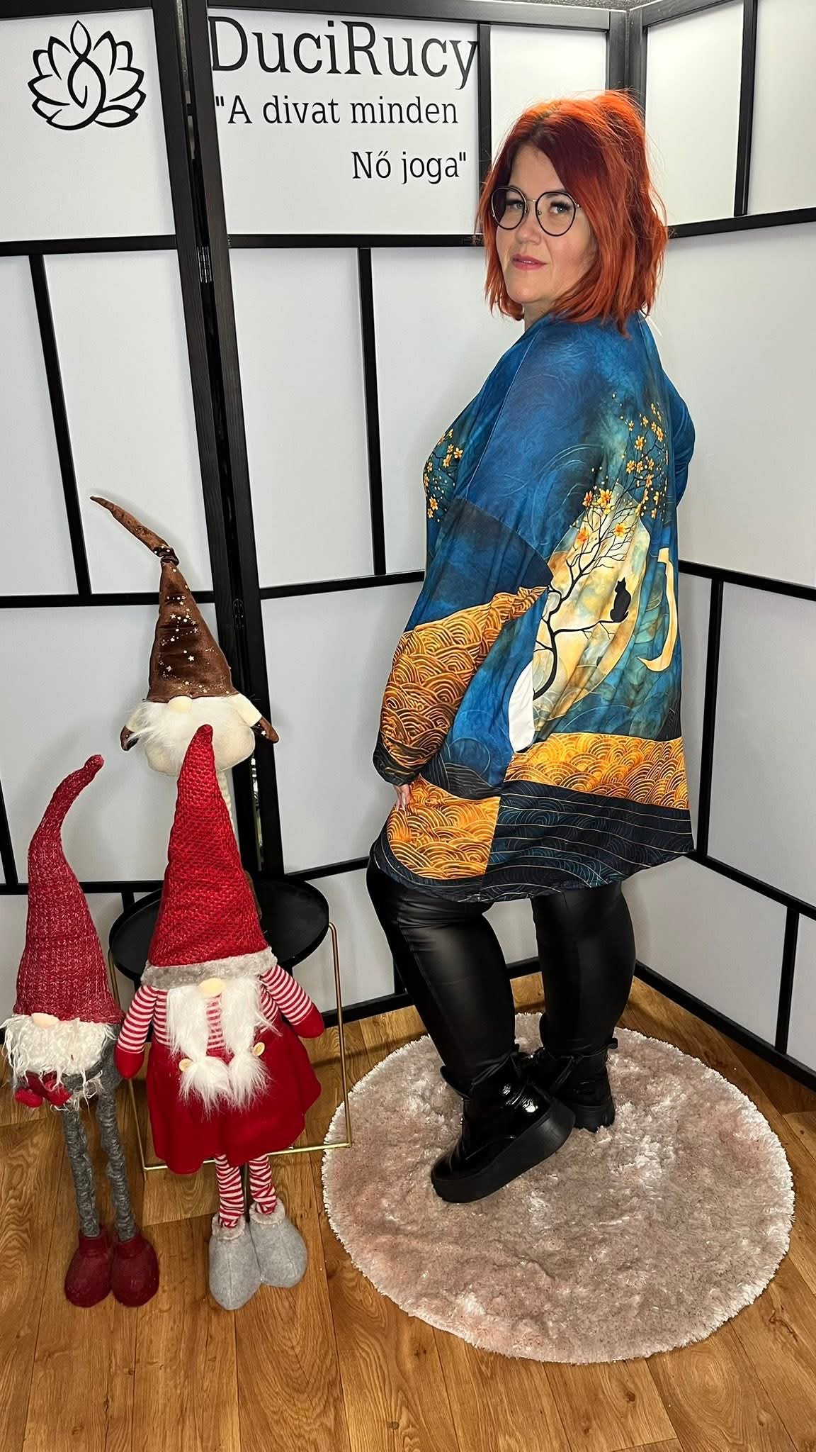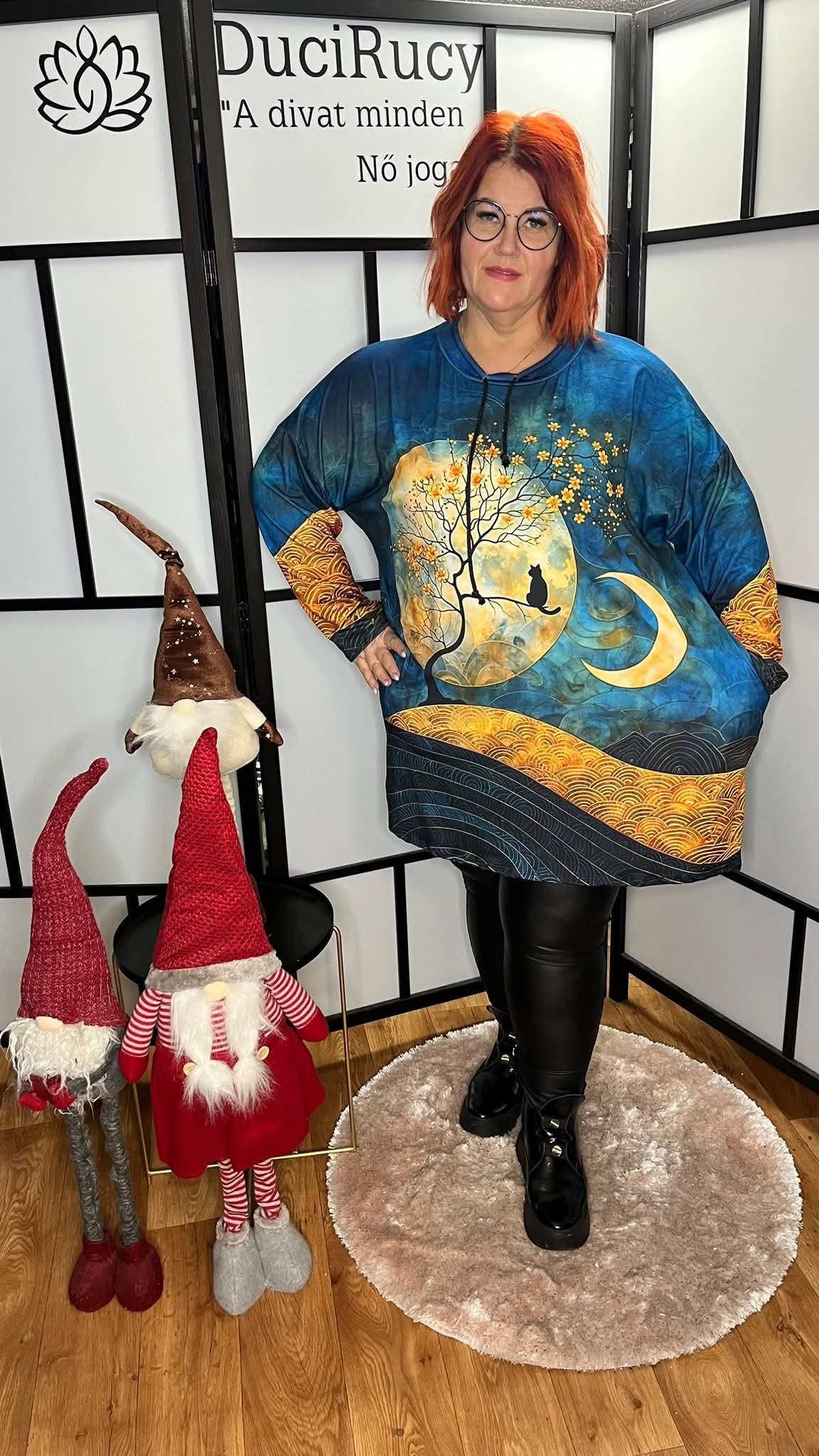 Olasz, extra méretű, pihe-puha tunika magasított nyakkal és zsinórral hold és cicás mintával