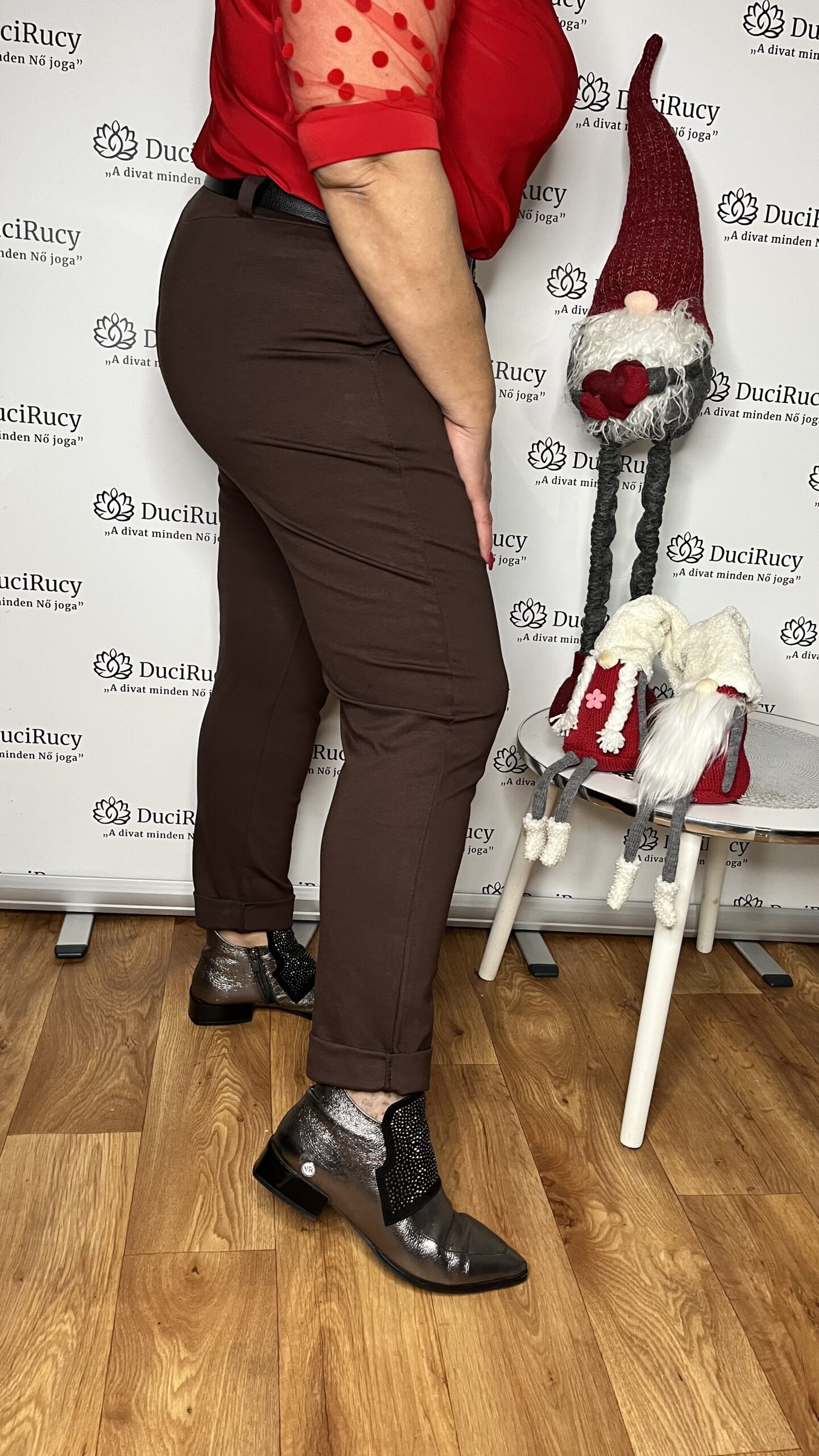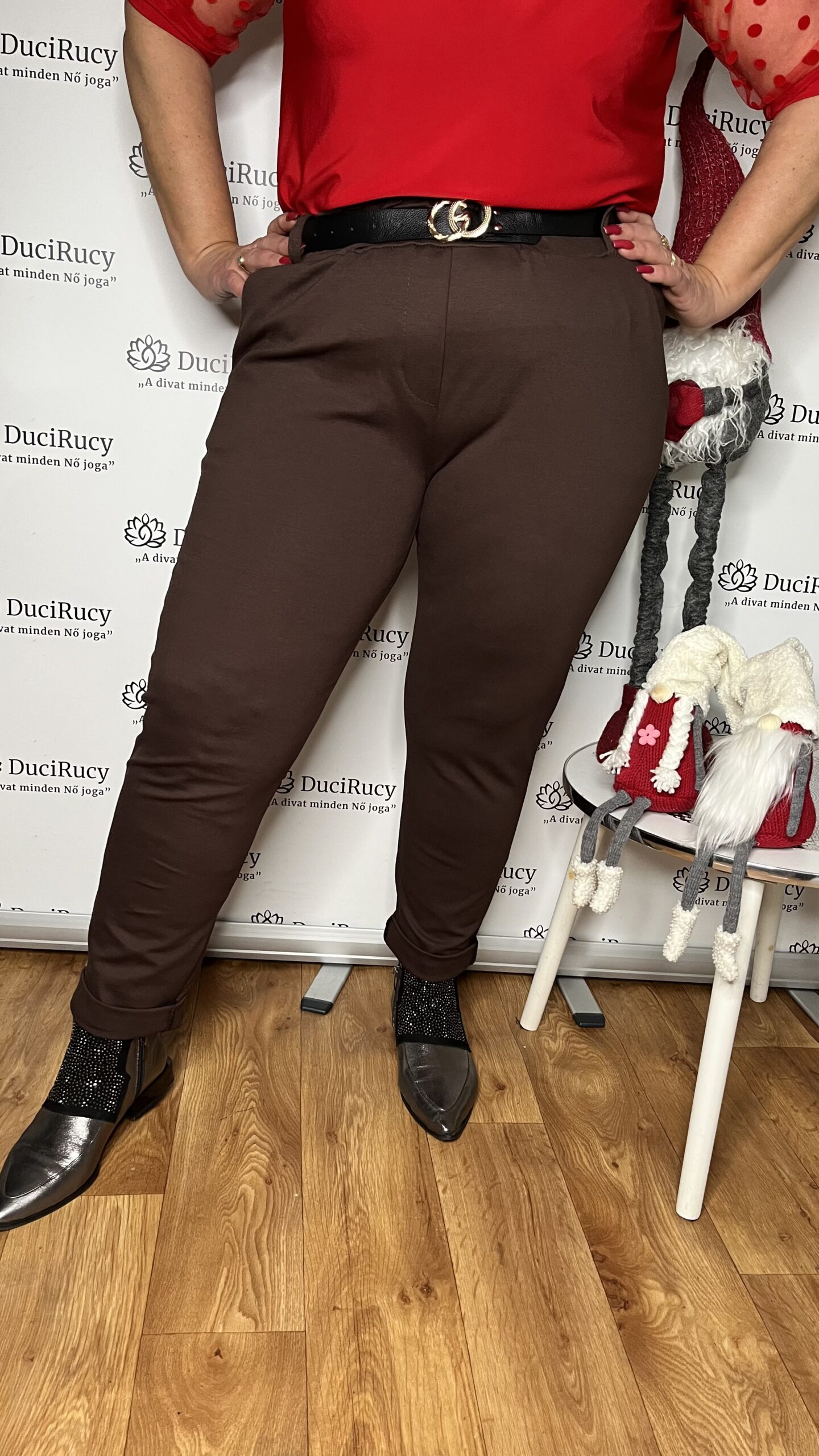 Olasz extra méretű punto anyagból készült téli nadrág csokibarna színben