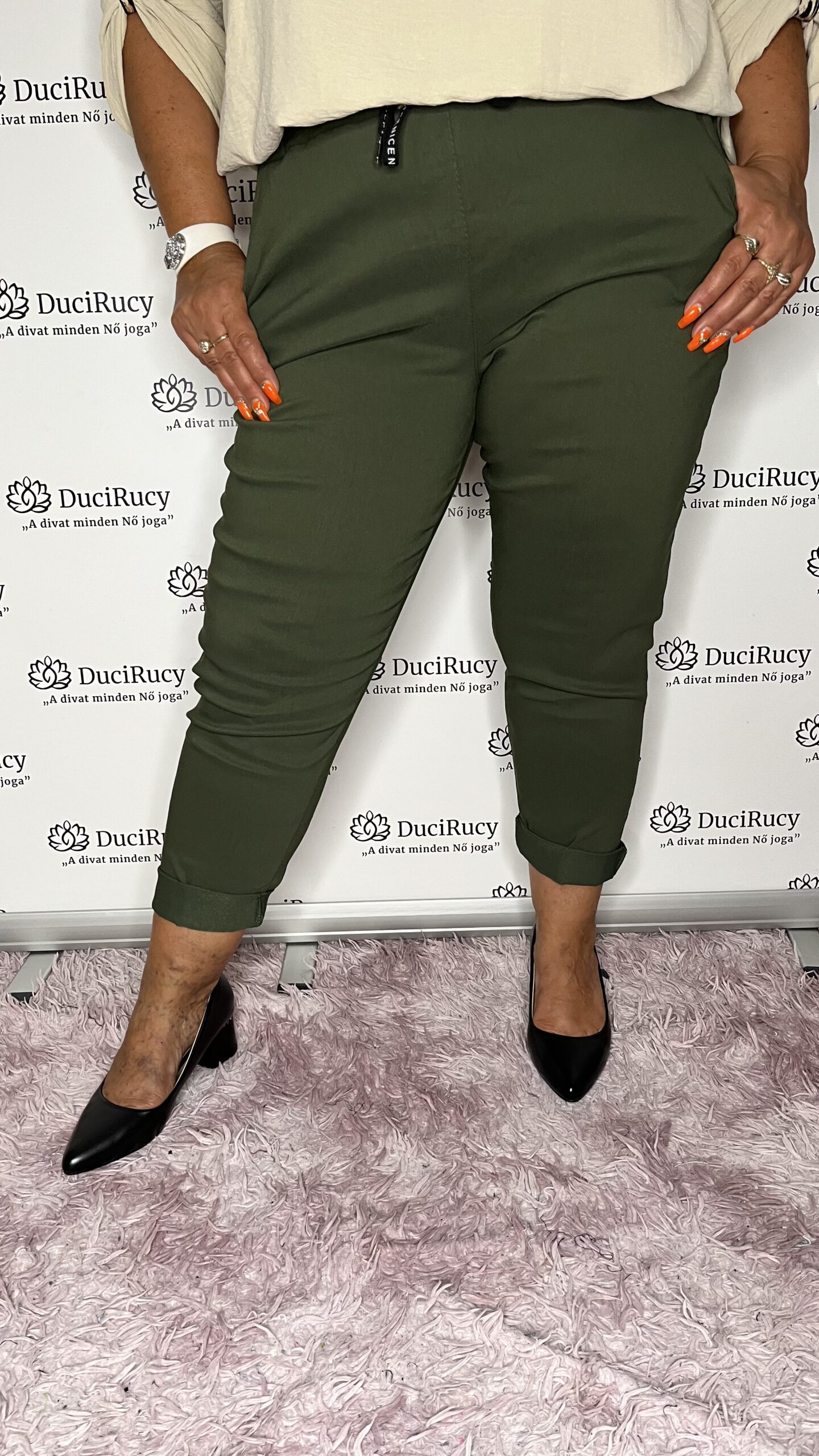 Olasz, rugalmas vászon nadrág gumis derékkal. Molett hölgyeknek kiváló viselet lehet bármilyen alkalomra. Normál magas derekú, ezért molett alakon is nagyon nagyon jól mutat. Remekül kombinálható sportos pólóval, tunikával, de akár egy elegáns blúzzal is, ezért az őszi/tavaszi gardrób alap darabja lehet ez a csodálatos rugalmas nagyméretű nadrág.