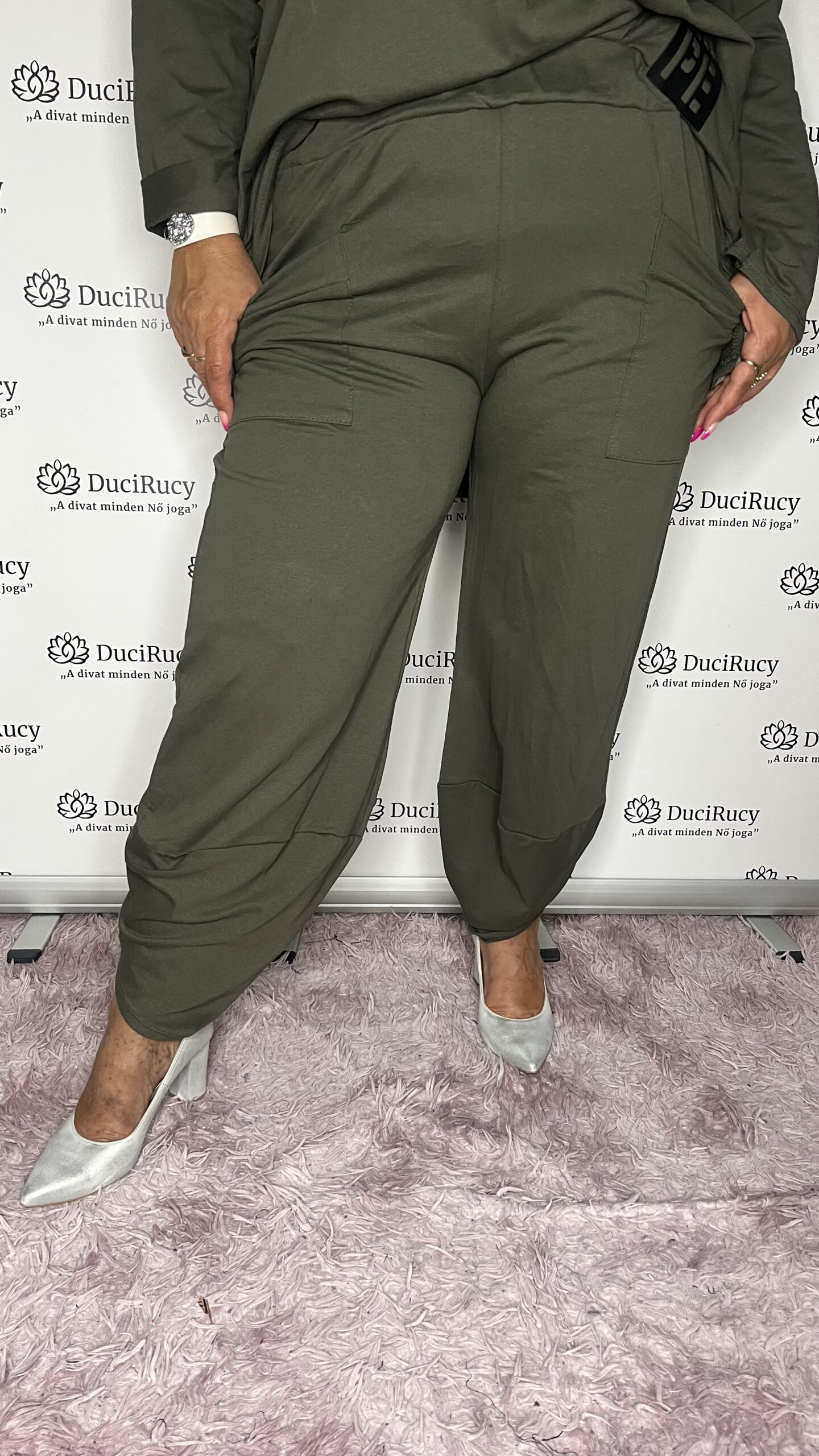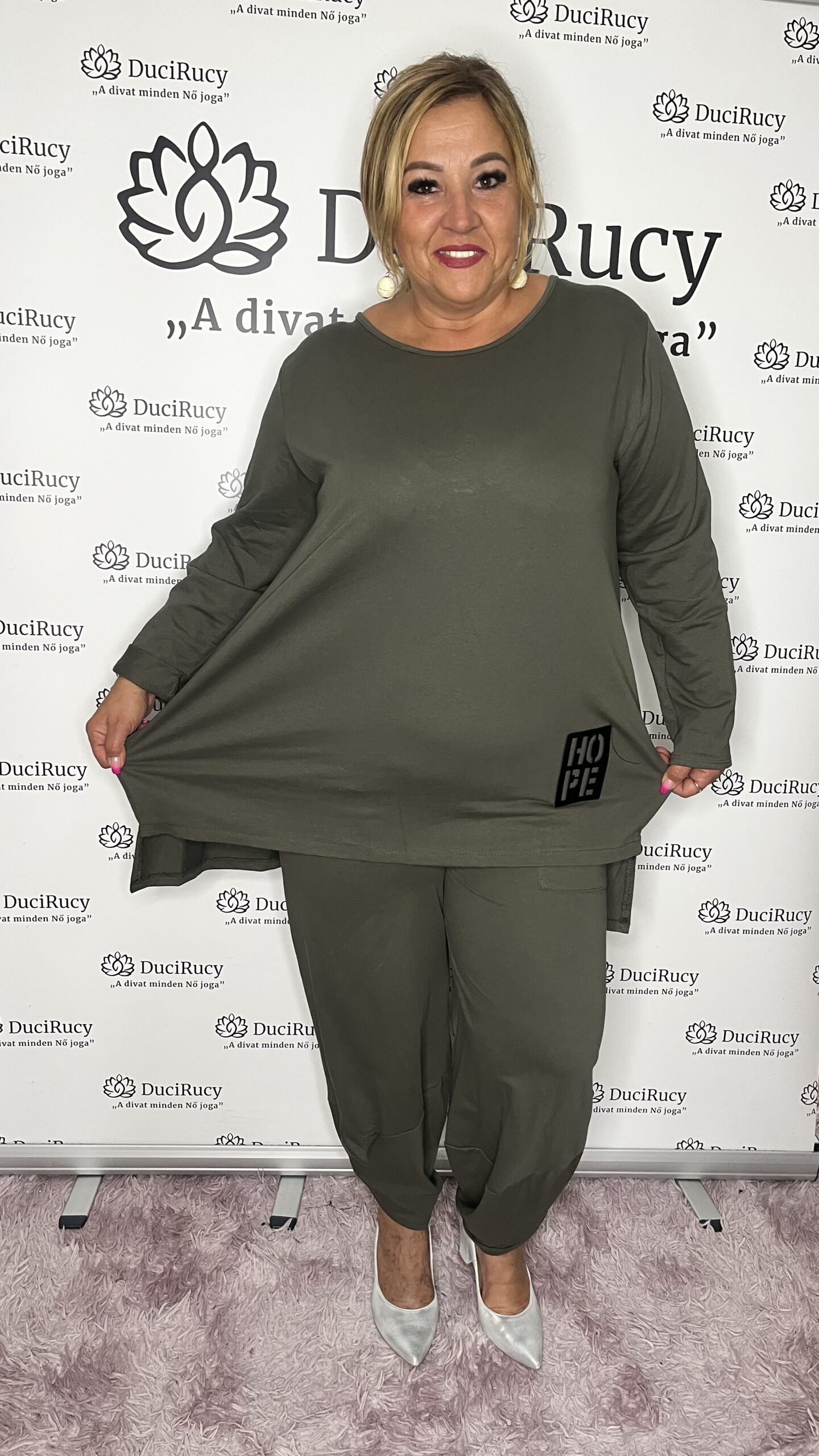 Olasz egyméretű, fiatalos, sportos, pamut anyagú 2 részes szett, amely egy egyenes szabású tunikából és egy "hárem" nadrágból áll. Nagyon jól kombinálható külön-külön is. Igazi különleges, kényelmes darab!