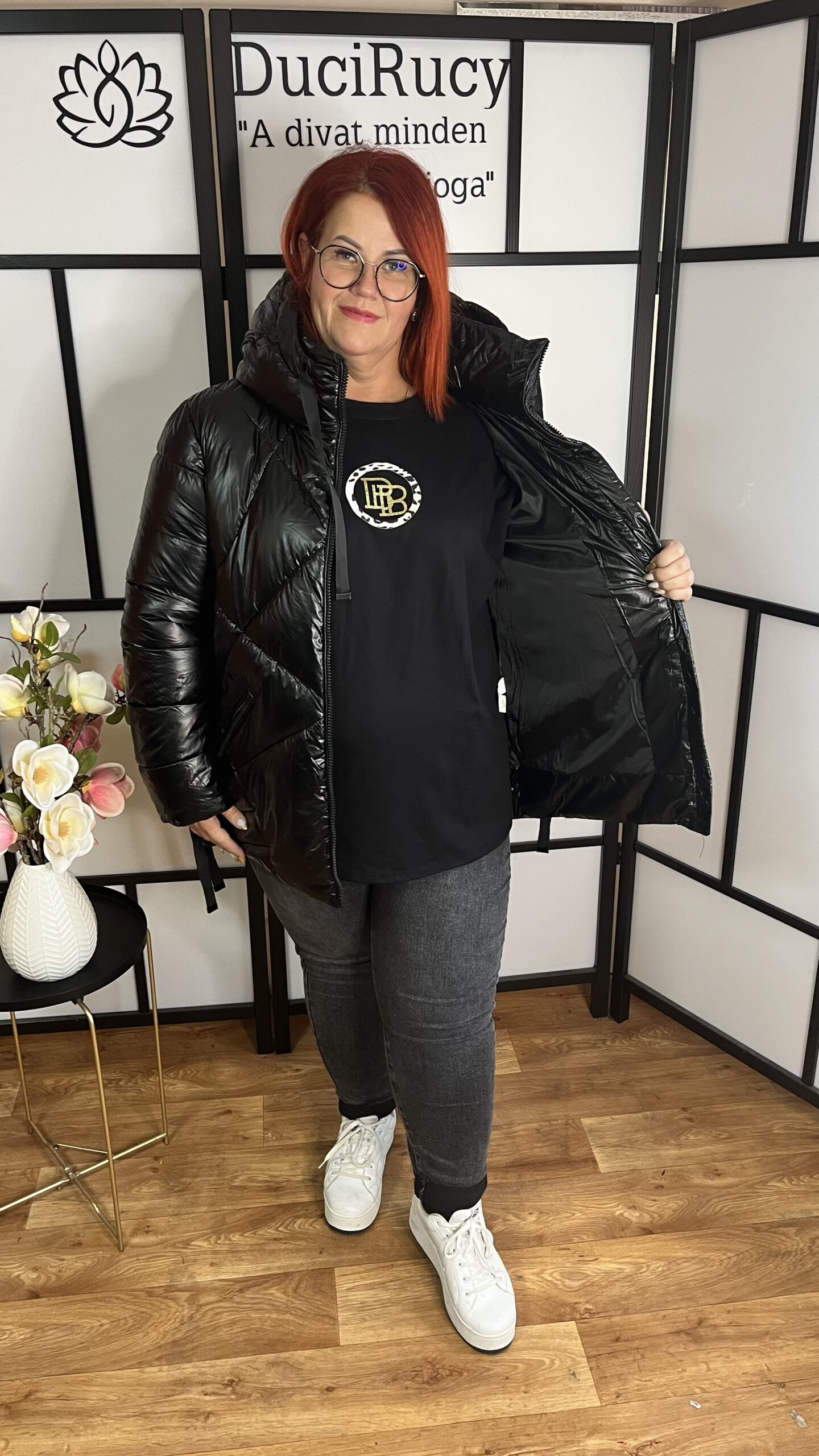 A modellen az 2xl méret van a képen. Az Ő méretei: mellbőség 120 cm, csípőbőség 134 cm.