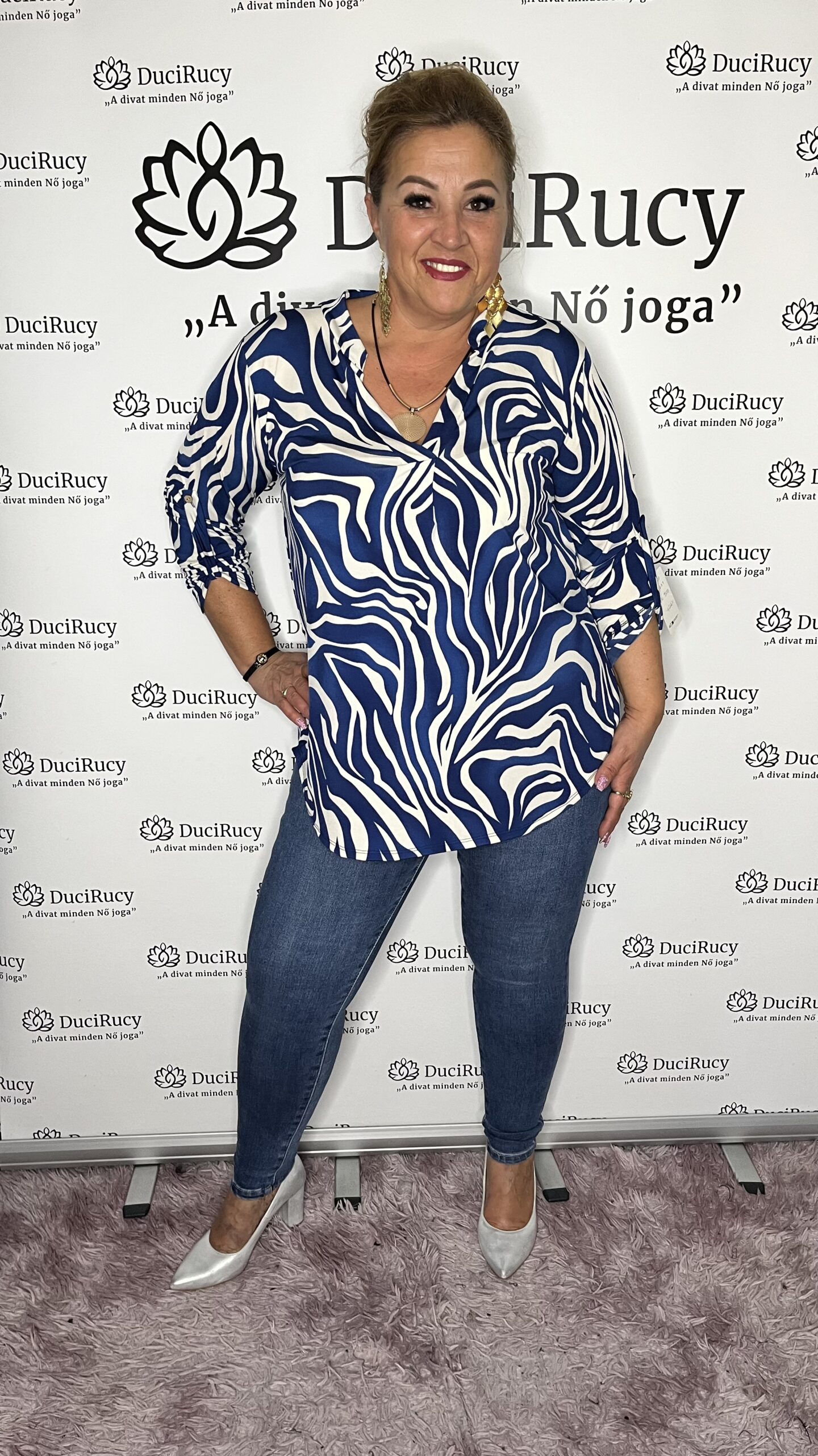 A képeken a modell is ezt a méretet viseli. A modell méretei: mell- és csípőbőség 120 cm, magassága 167 cm.
