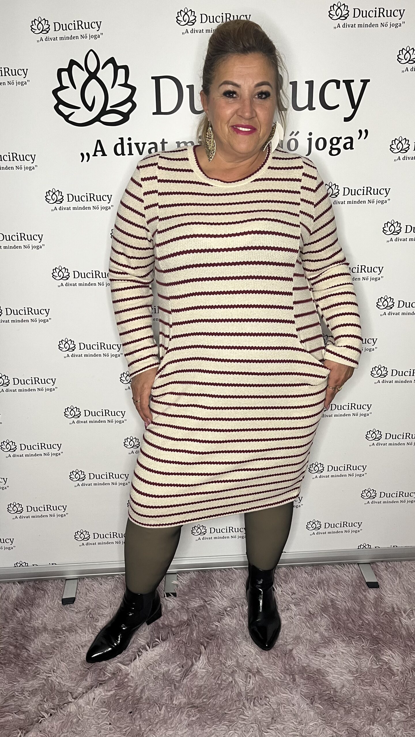 Olasz kötött anyagú zsebes, csíkos karcsúsított ruha térdig érő fazonnal. Nagyon mutatós ruha! Igazi őszi-téli alapdarab.