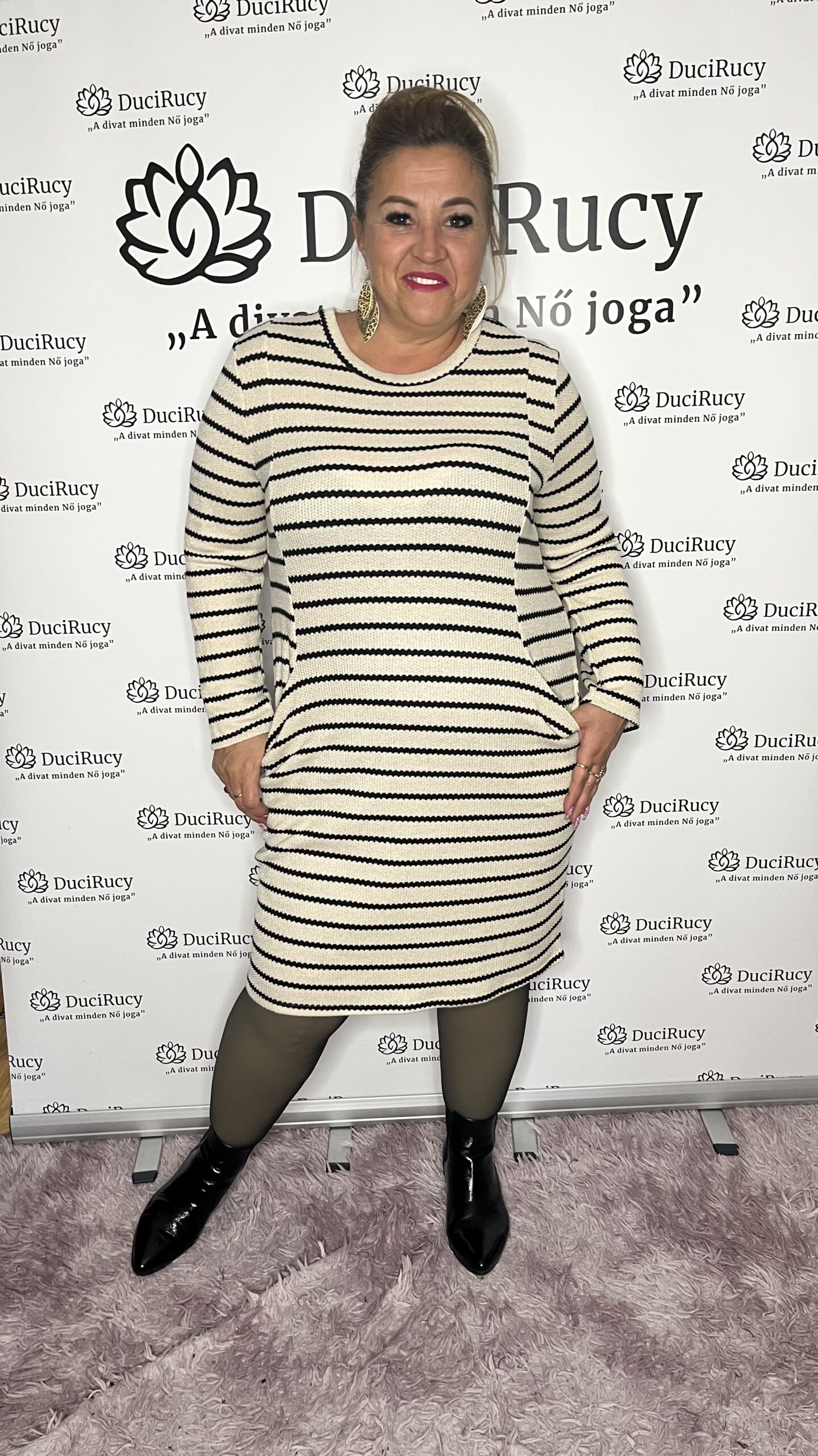 Olasz kötött anyagú zsebes, csíkos karcsúsított ruha térdig érő fazonnal. Nagyon mutatós ruha! Igazi őszi-téli alapdarab.