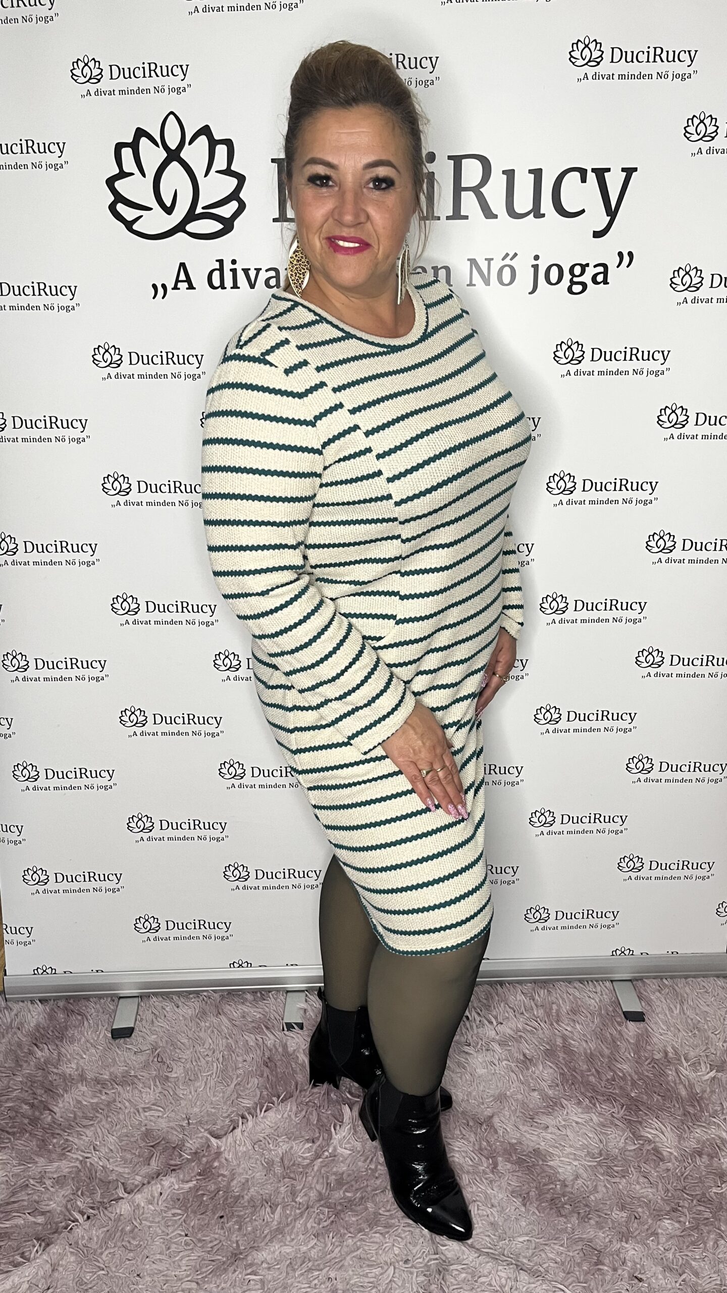 Olasz kötött anyagú zsebes, csíkos karcsúsított ruha térdig érő fazonnal. Nagyon mutatós ruha! Igazi őszi-téli alapdarab.