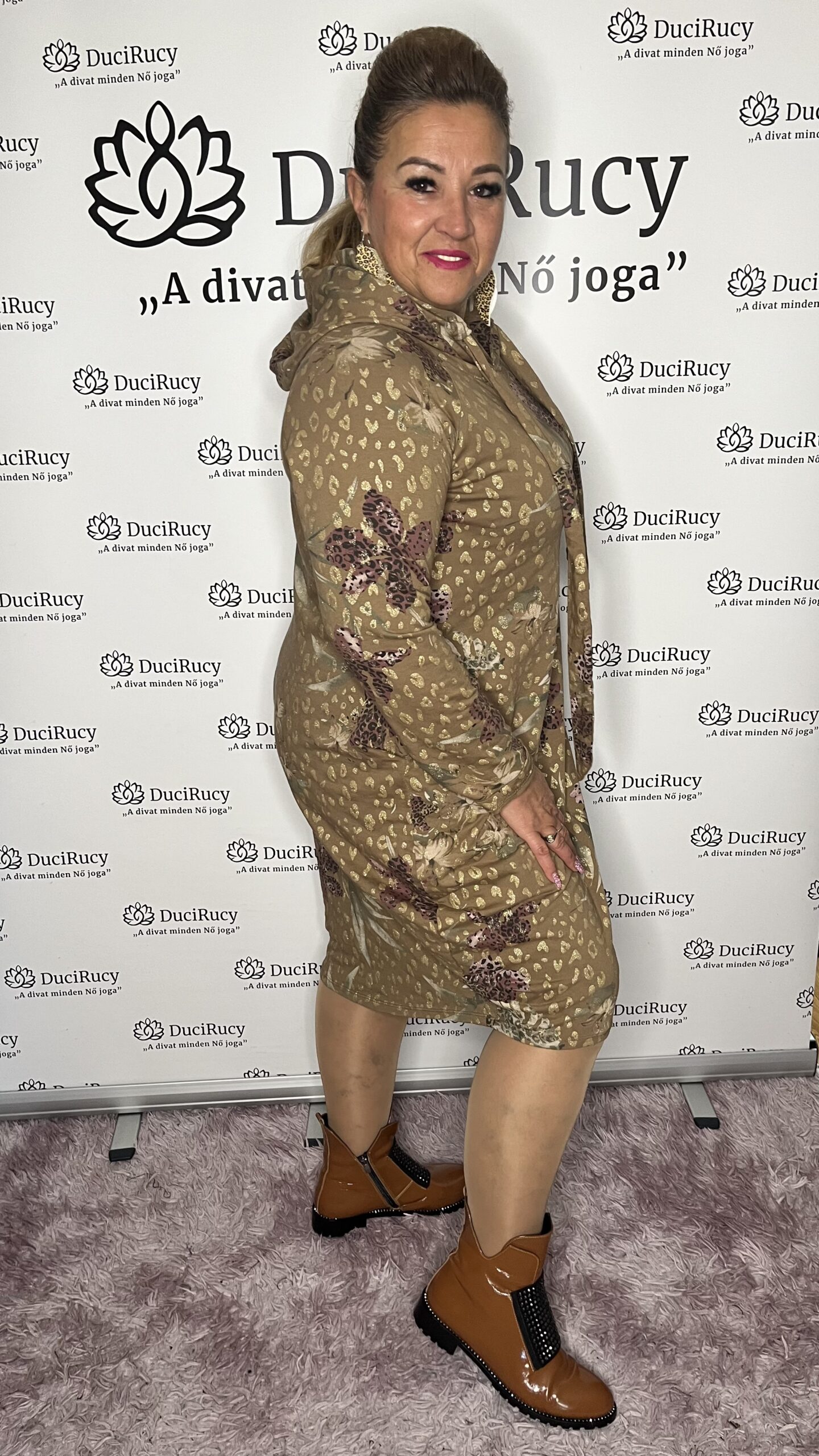 Olasz, pamut anyagú, hagyma fazonú, zsebes, kapucnis virágmintás ruha, csillámmal átszőve. Az őszi-téli állatminta ebben a ruhában is feltűnik. Nagyon mutatós ruha!  Igazi őszi alapdarab.