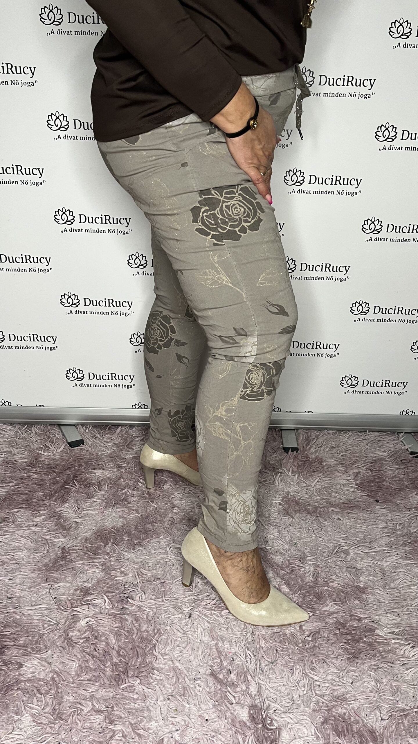 Olasz virág mintás csillámmal díszített gumis derekú nadrág szürke színben