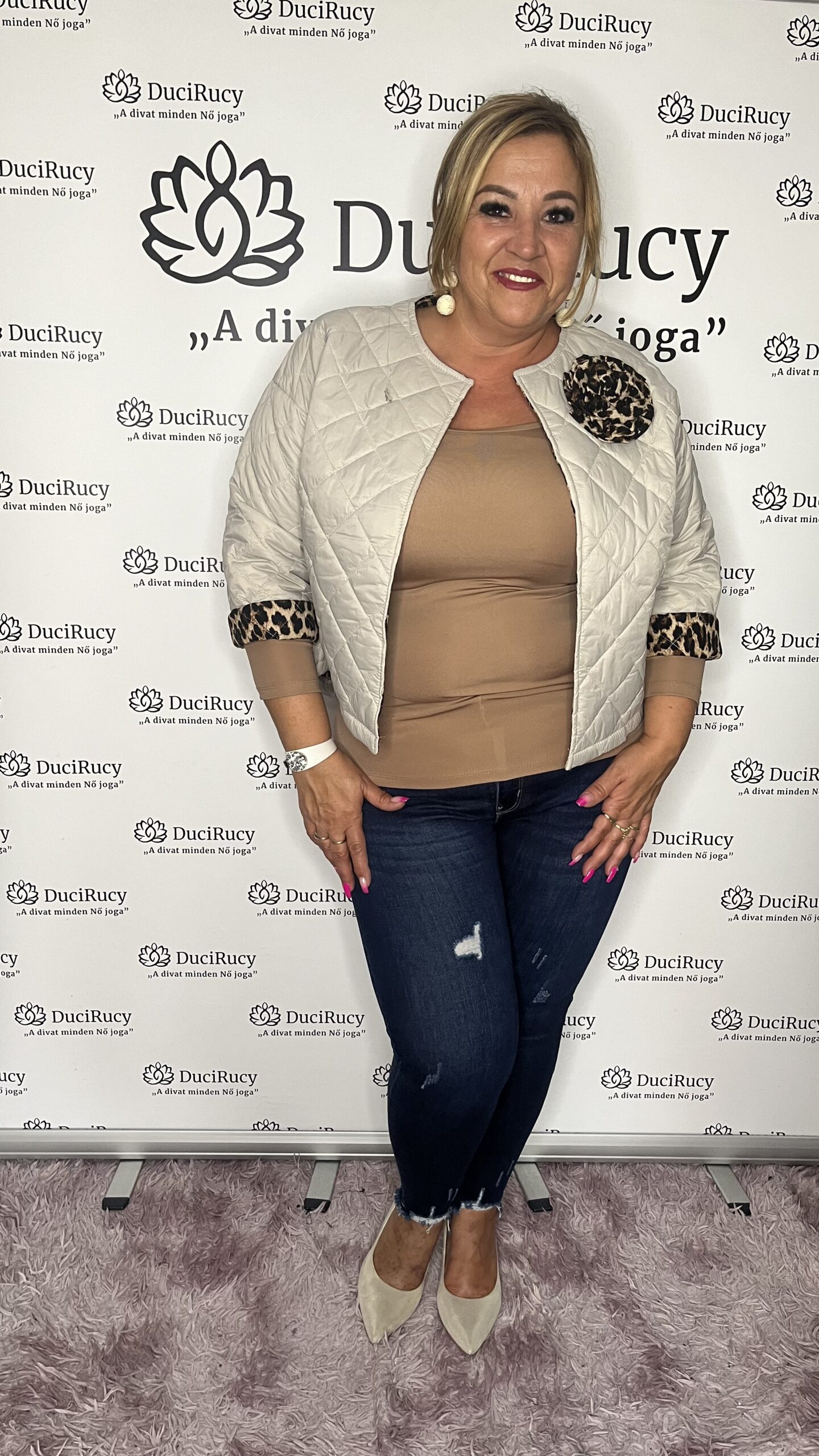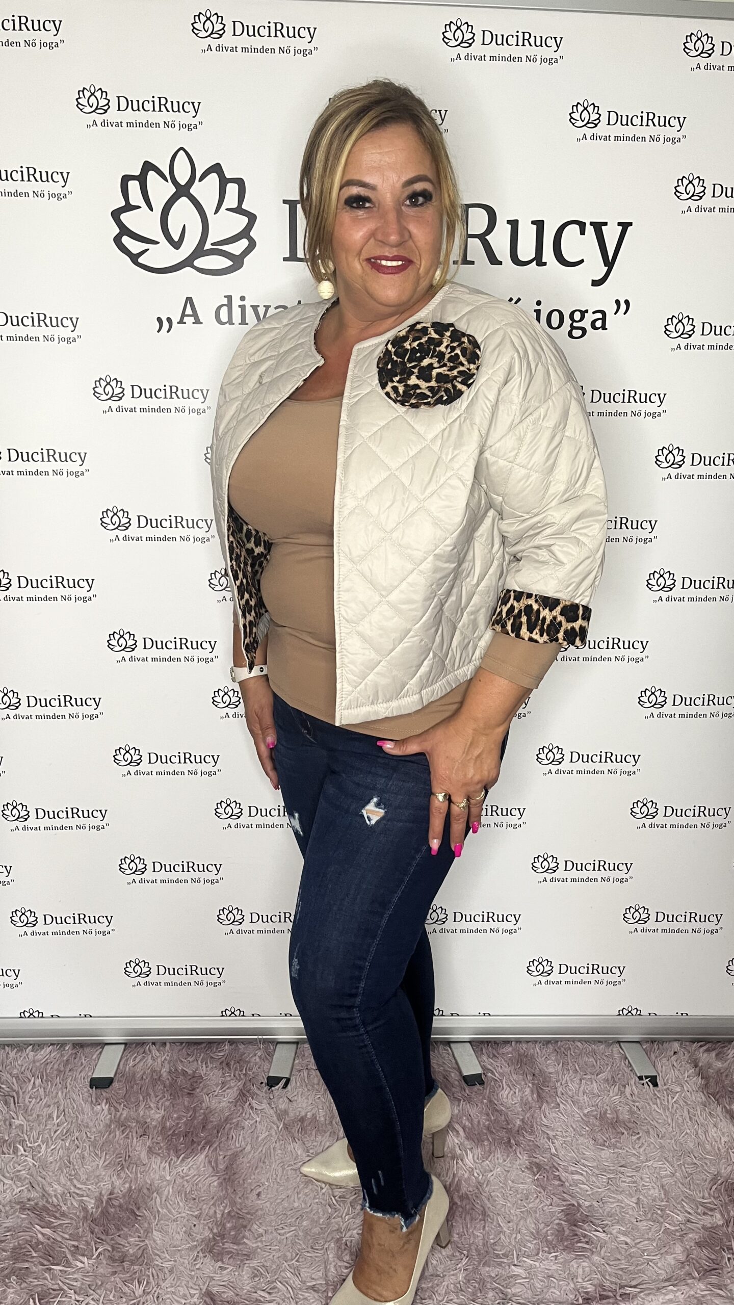 Őszi fiatalos vékony steppelt kabát/bolero párduc díszítéssel bézs színben