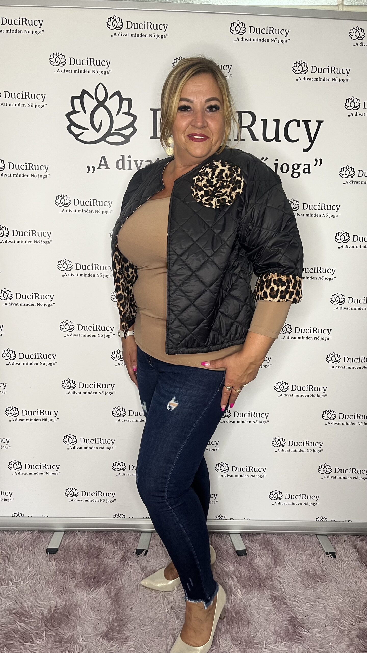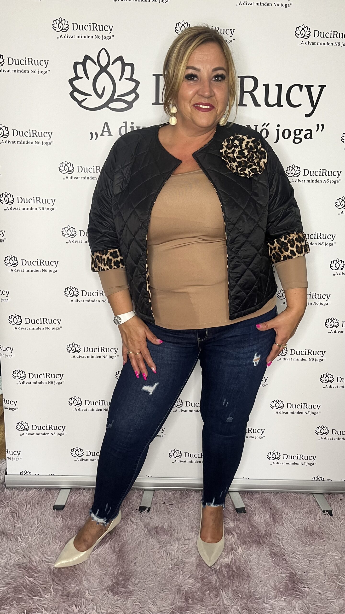 Csodaszép olasz egyméretű, vékony steppelt kabát/bolero párduc díszítéssel, levehető kitűzővel. Nincs rajta gomb, vagy cipzár, tipikus felkapom és megyek dzseki. Fiatalos, extra dögös kabát, amit a párduc díszítés különlegessé tesz! Hűvös reggelek elengedhetetlen kelléke ez a szuper ruhadarab.