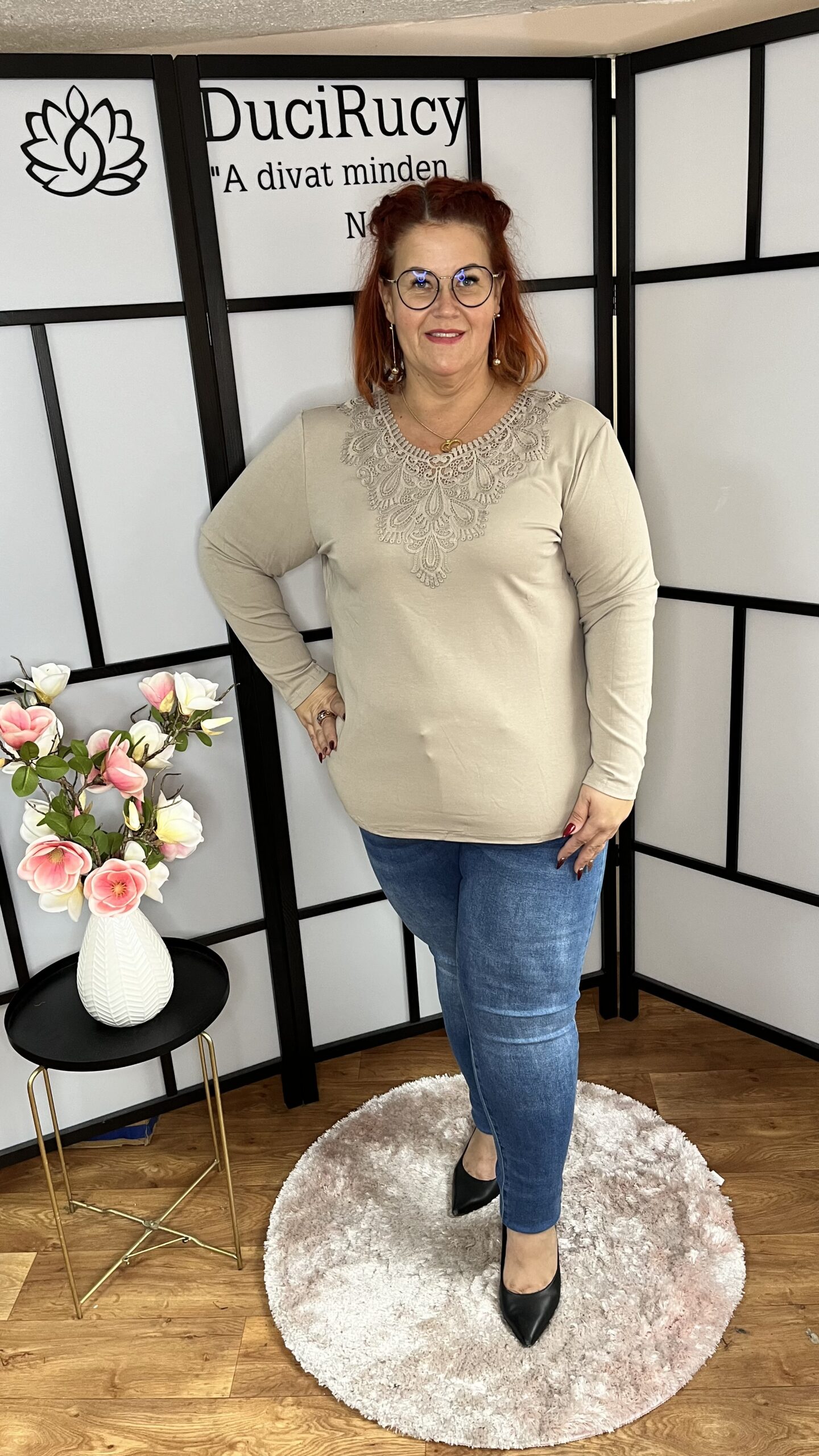 Pamut elején madeirával díszített felső bézs színben