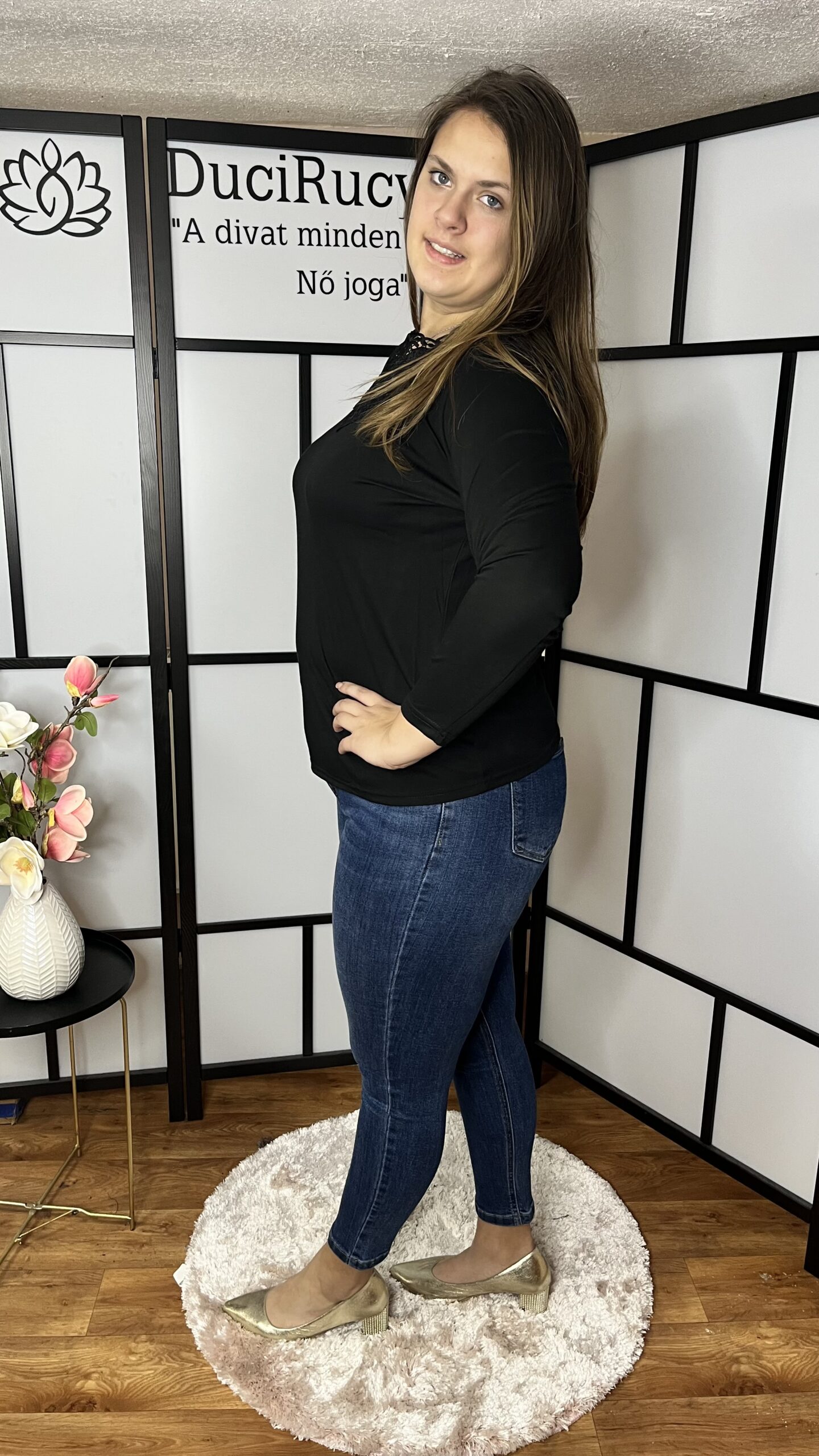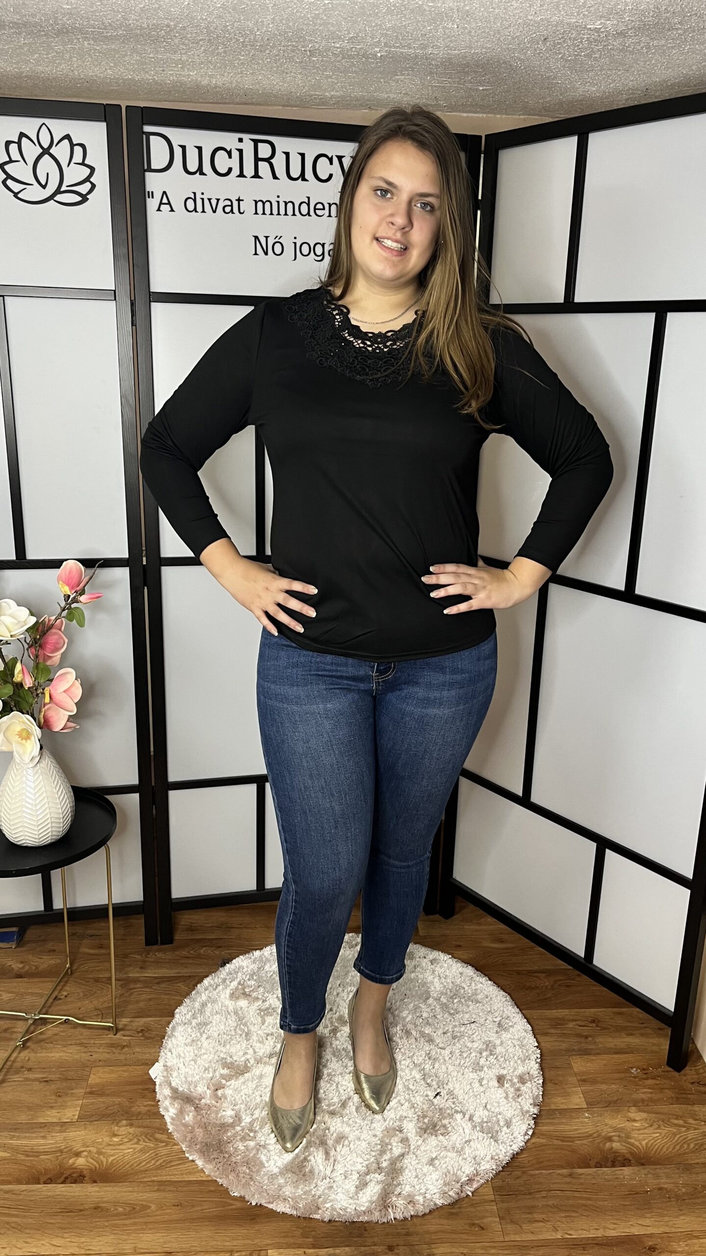 Szuper pamut anyagból készült felső, melynek elöl a nyak része V-be madeirával és apró kövekkel díszített. Igazán mutatós kis darab. A felső anyaga rugalmas pamut.