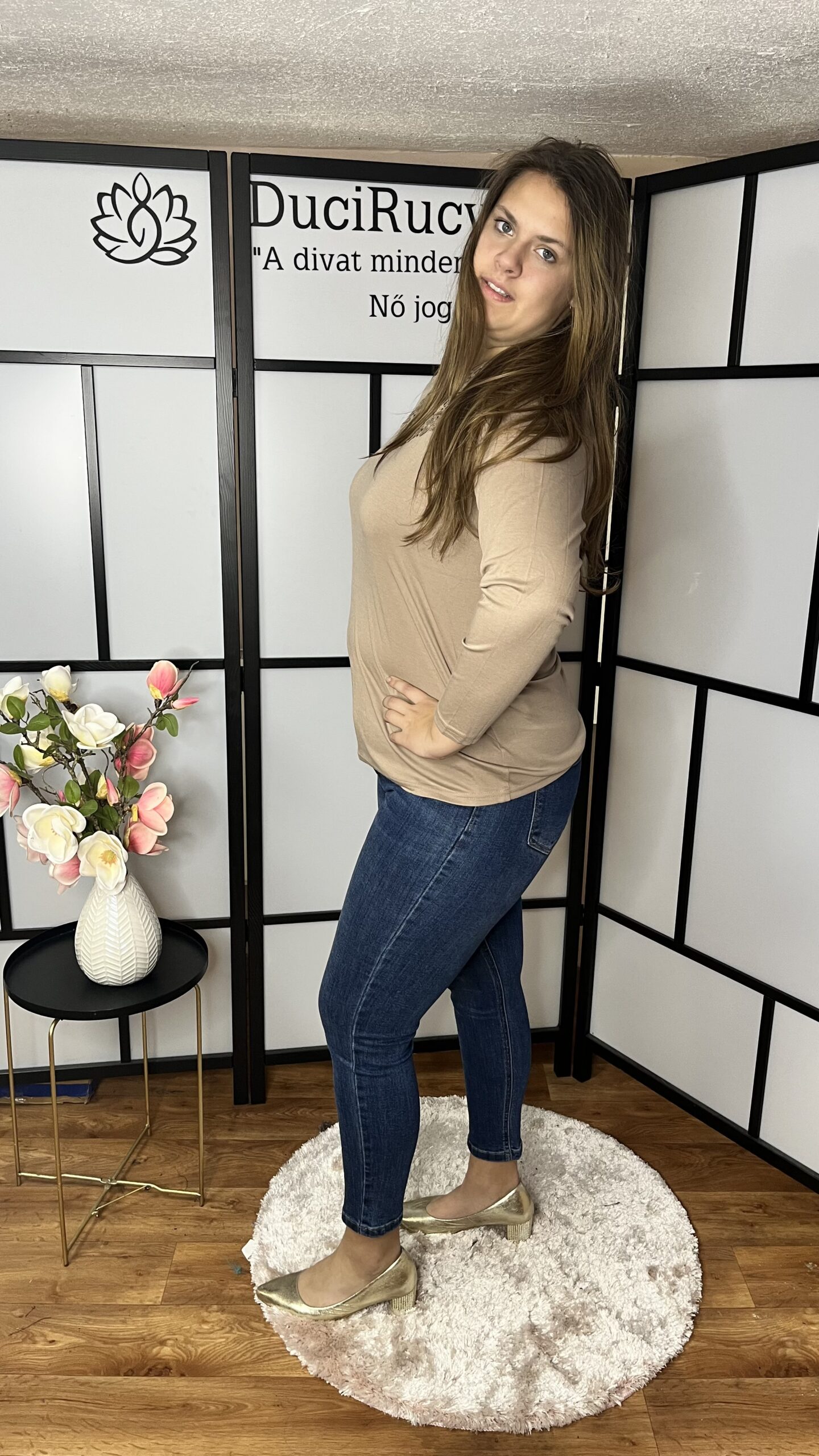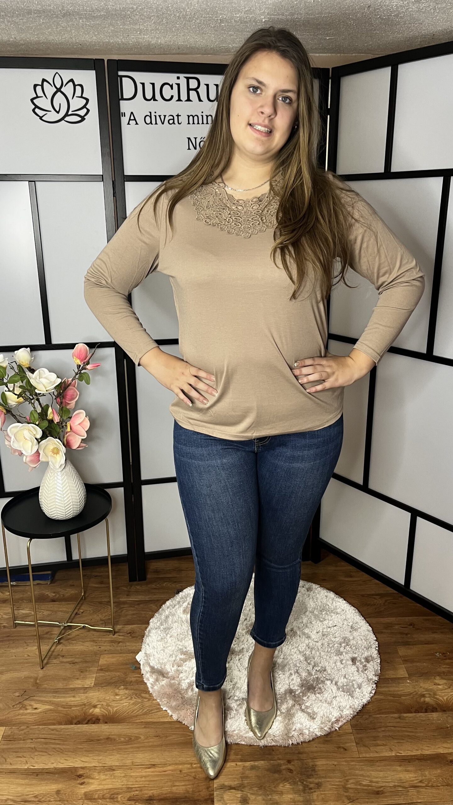Szuper pamut anyagból készült felső, melynek elöl a nyak része V-be madeirával és apró kövekkel díszített. Igazán mutatós kis darab. A felső anyaga rugalmas pamut.