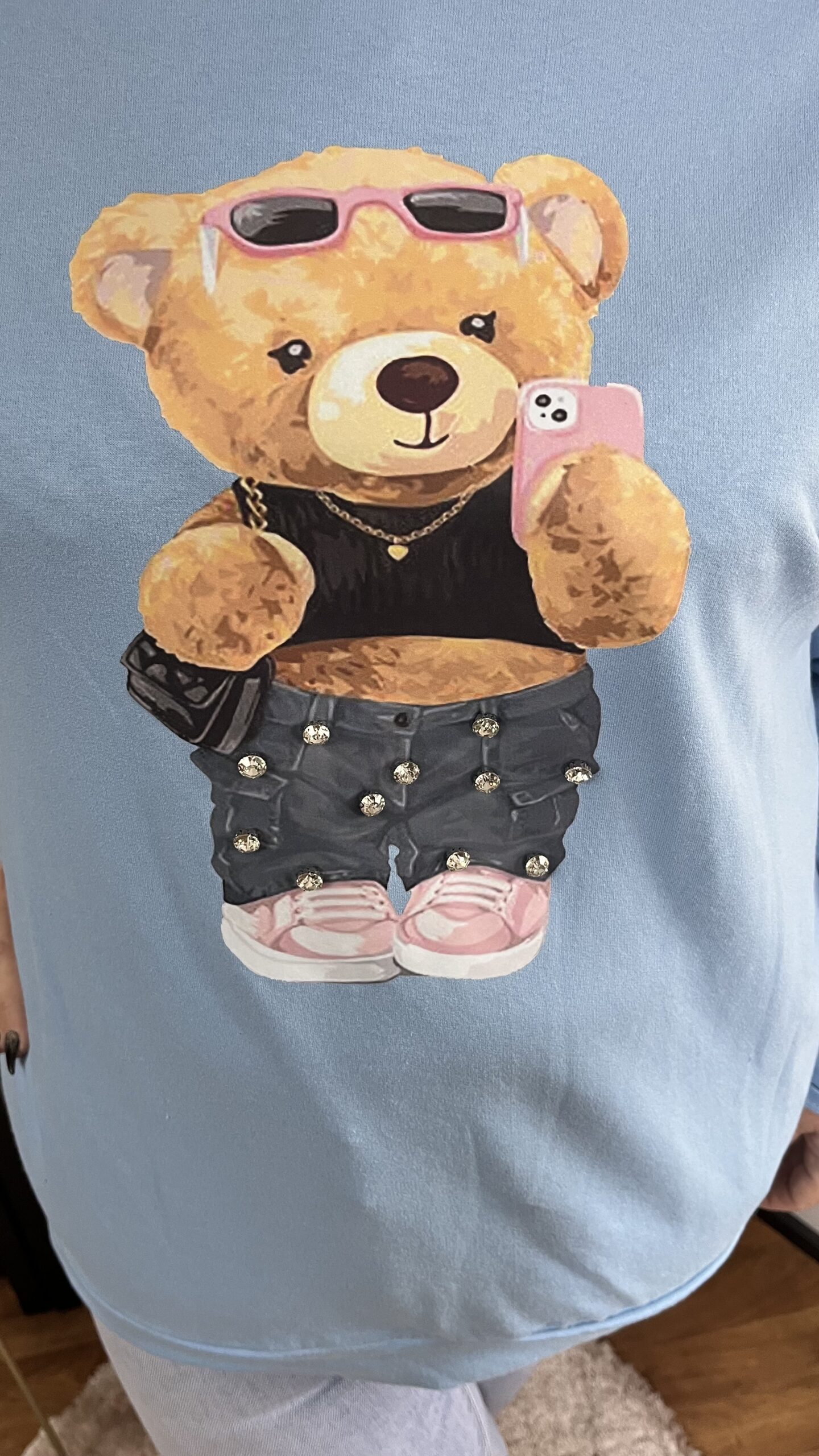 Olasz, pamut anyagból készült, cuki macival díszített tunika. A maci nadrágja kövekkel került díszítésre. A tunika anyaga rugalmas. Nagyon kényelmes és trendi felső.
