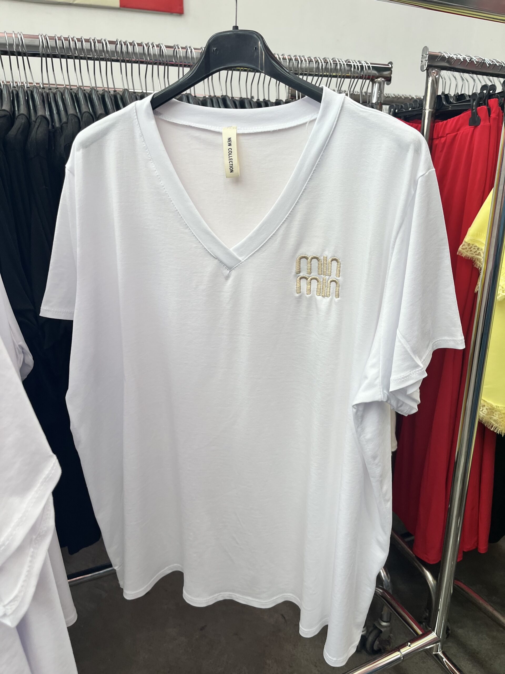Pamut, V nyakú, MIN MIN feliratú felső fehér színben mennyiség