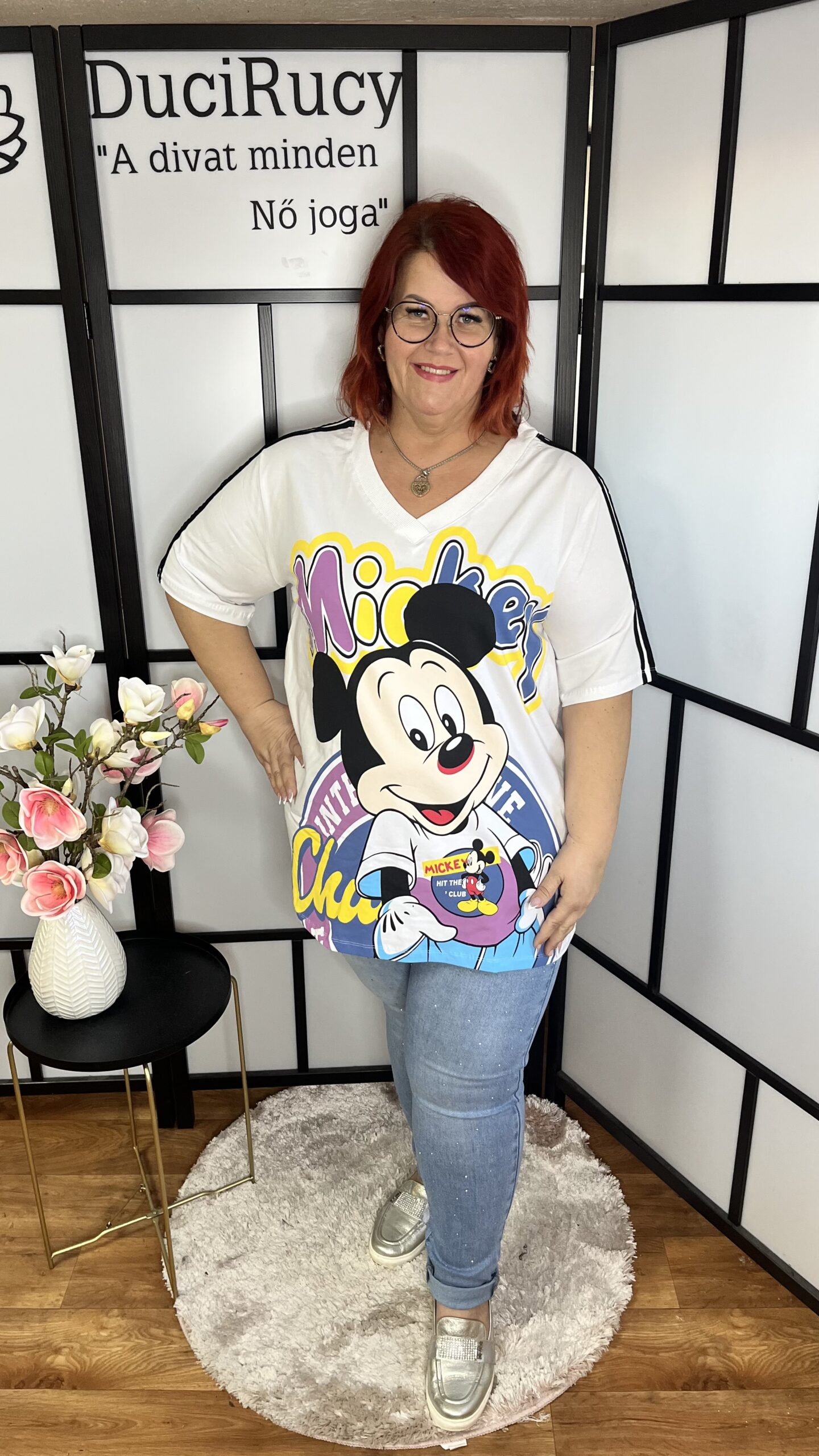 Pamut, V nyakú, vállán csíkos, Mickey egérrel díszített felső/póló fehér színben