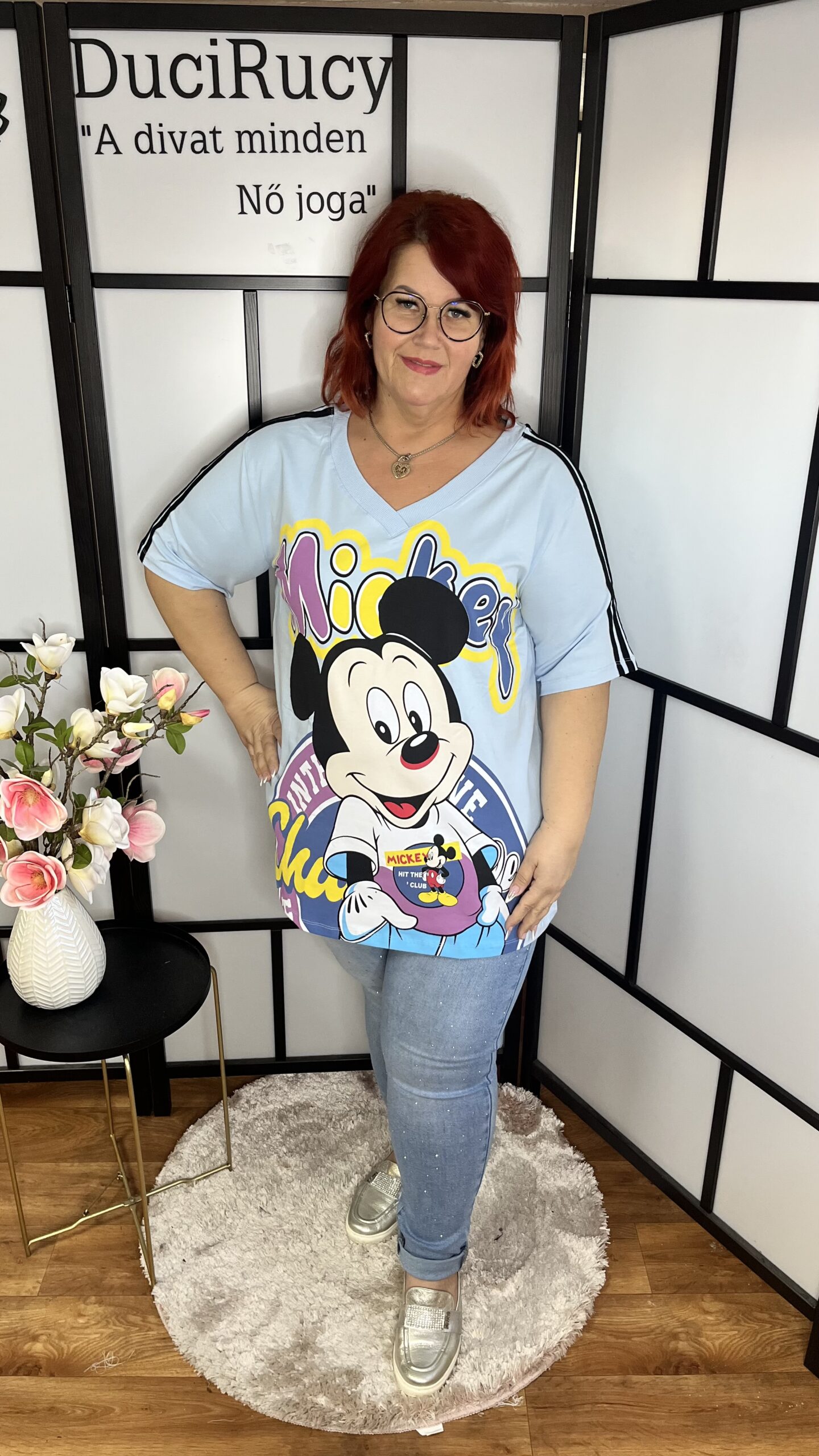 Pamut, V nyakú, vállán csíkos, Mickey egérrel díszített felső/póló felhőkék színben