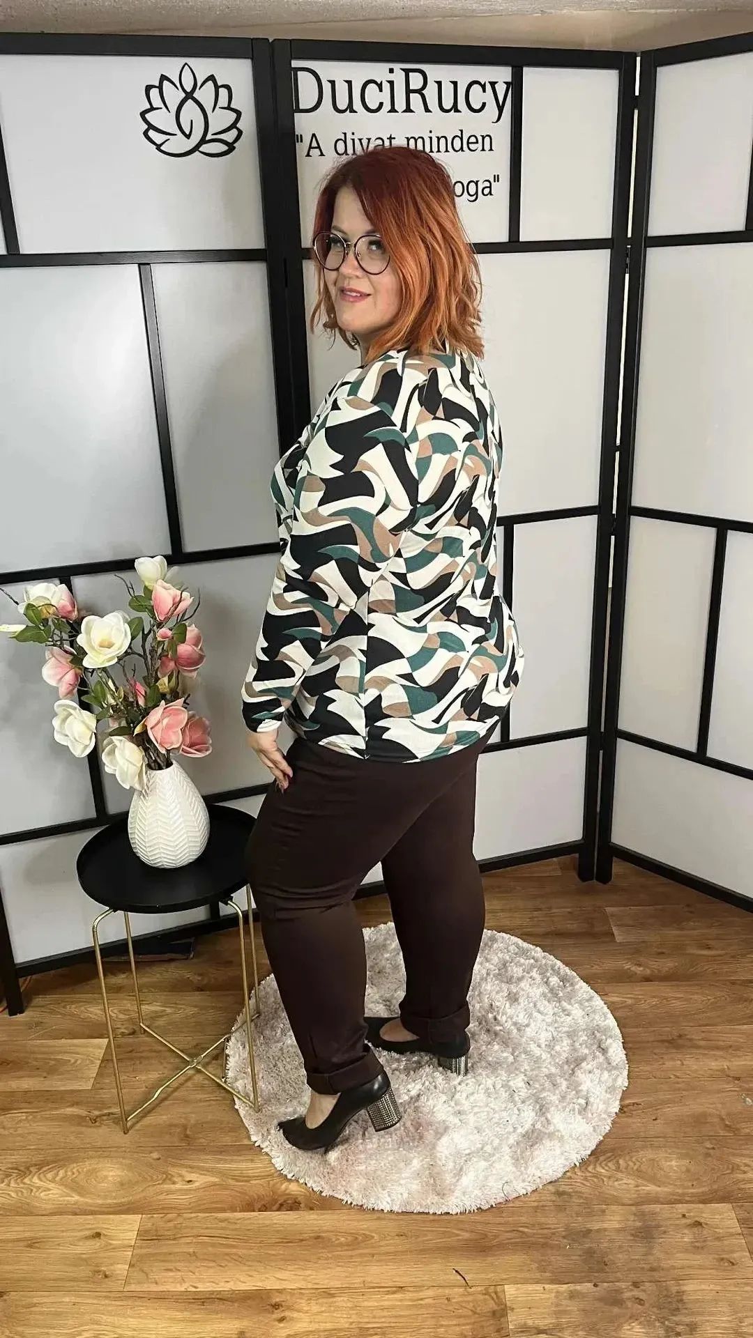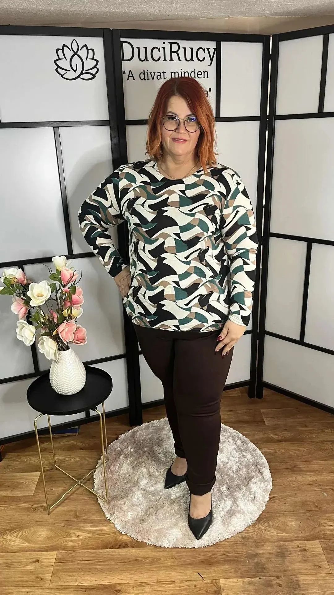 Pihe-puha anyagból készült, egyenes fazonú, mintás cérna felső nagyon trendi őszi színben. Egy egyszínű nadrággal nagyon jól kombinálható darab.