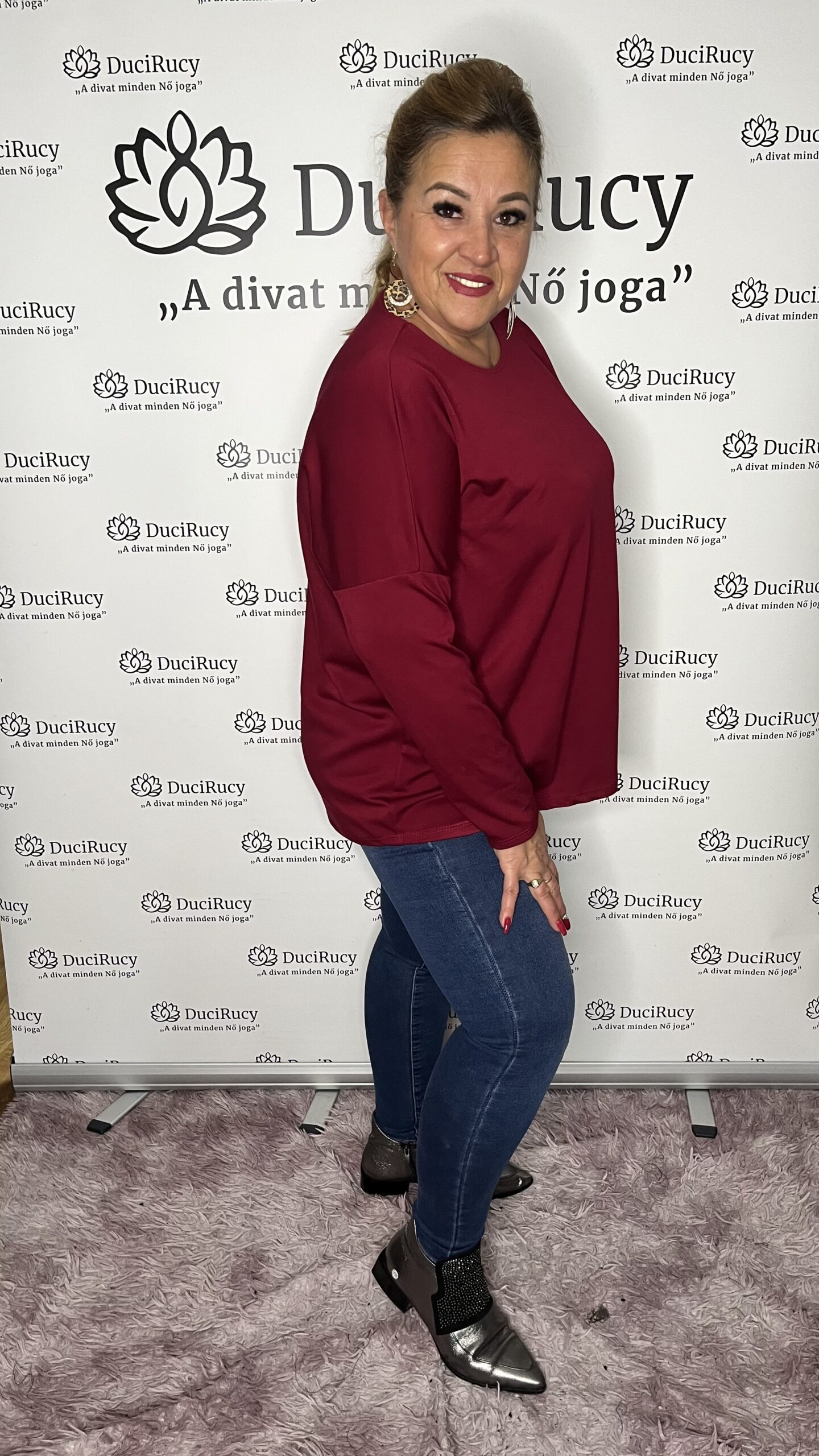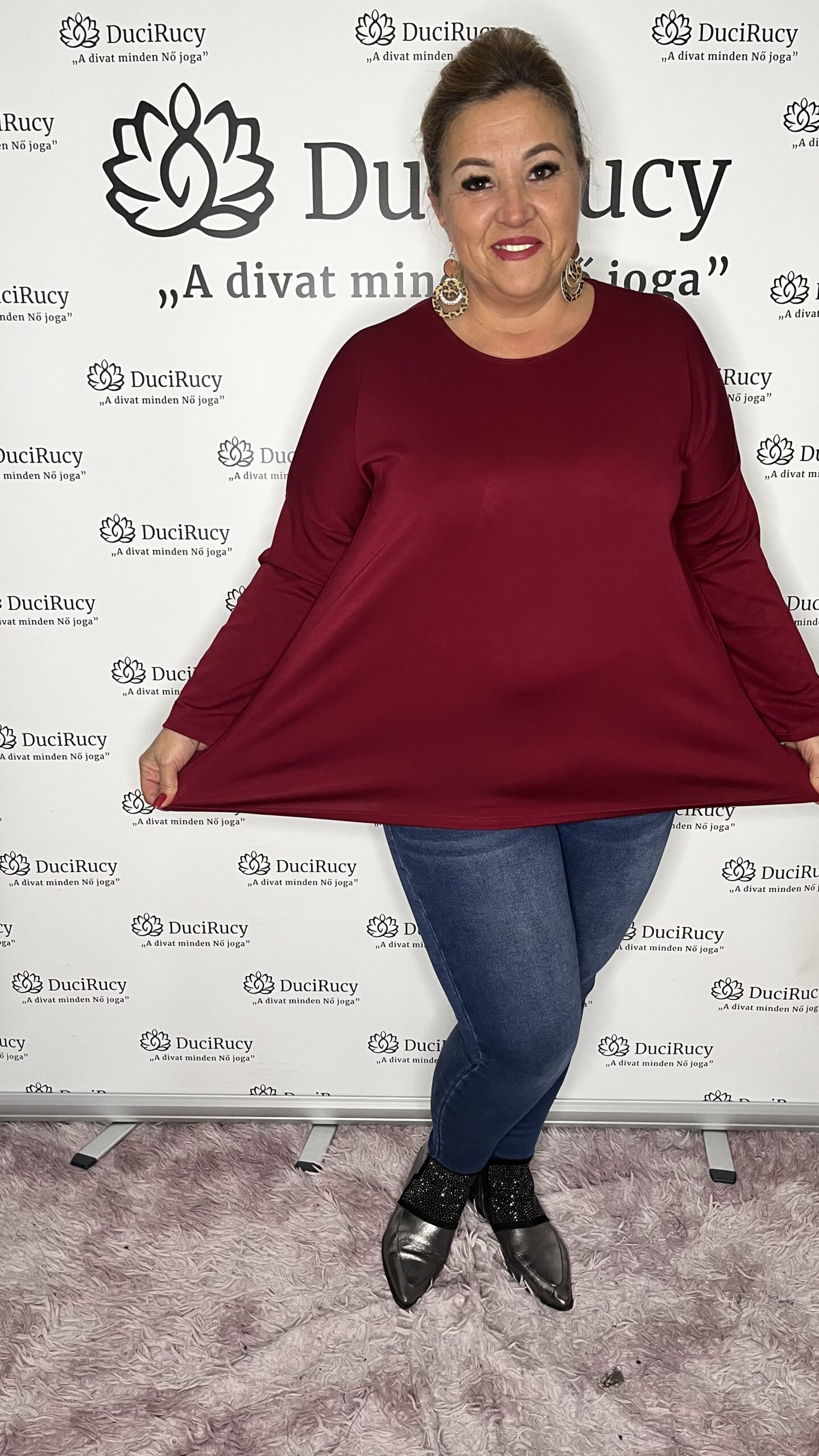 Pihe-puha anyagú, elöl rövidebb fazonú, kerekített felső bordó színben